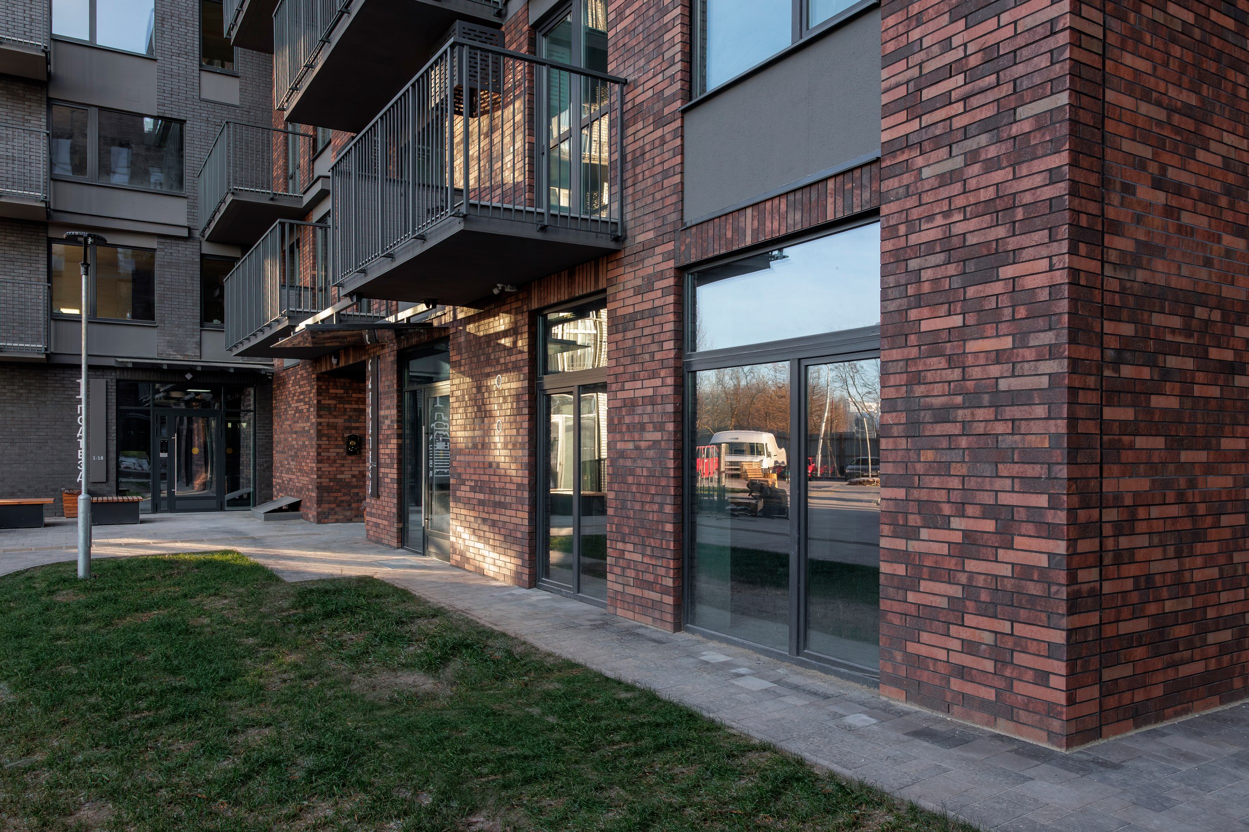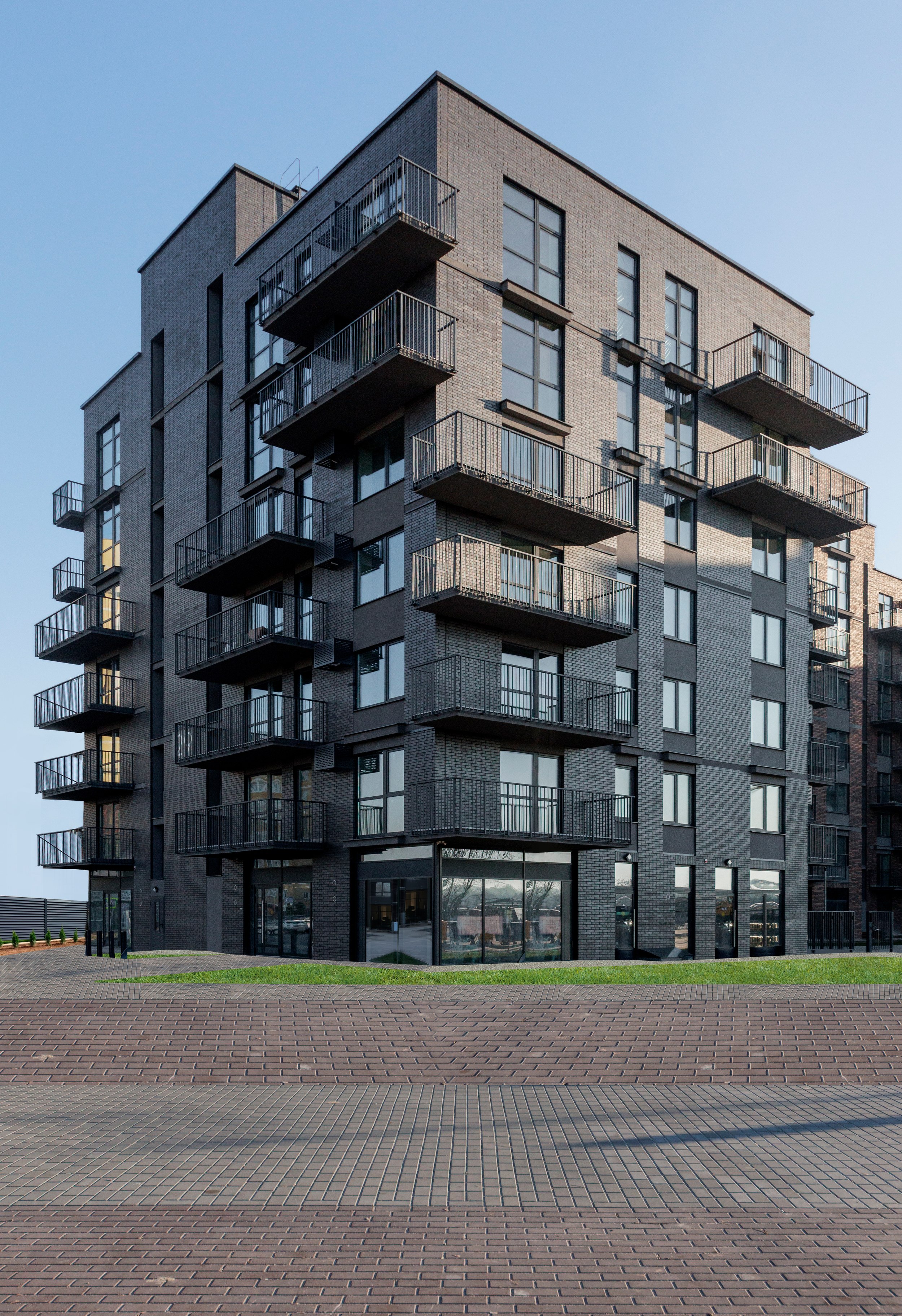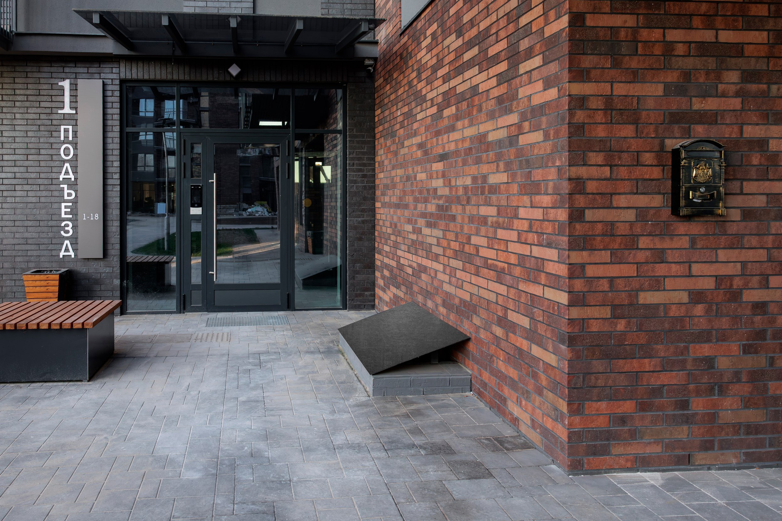 Для ЖК «ЦЕНТР» выбрали три клинкера Модформат (290×85×65 мм): Мальмё – графитово-чёрный с блеском, Брюне – винный тон, сочетающий несколько оттенков (до шести-семи), Стокгольм – серо-бежевый. Все три работают в едином ансамбле на пяти корпусах квартала.