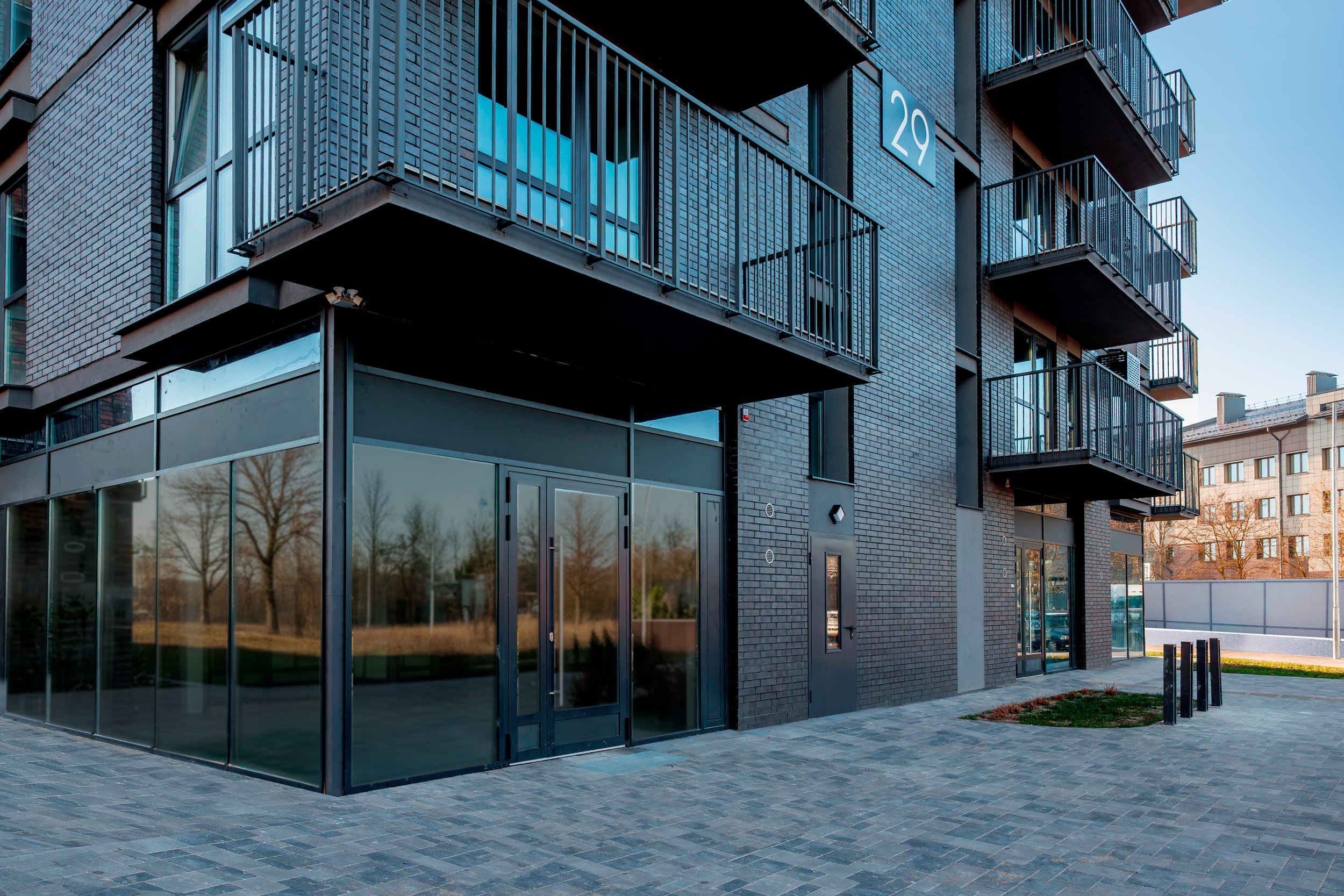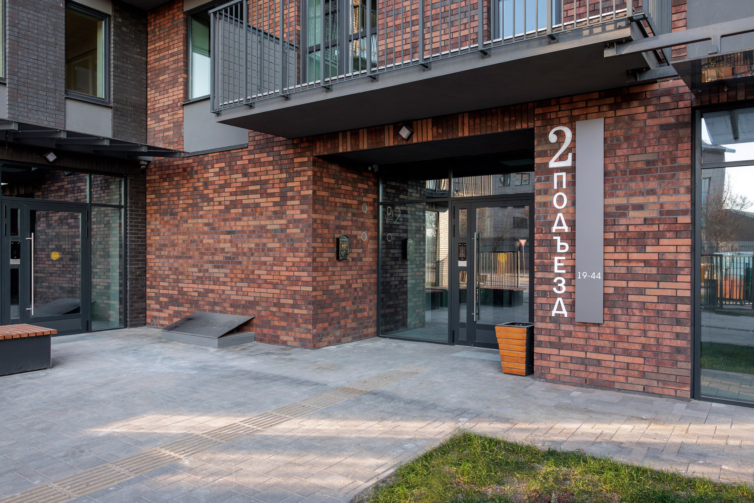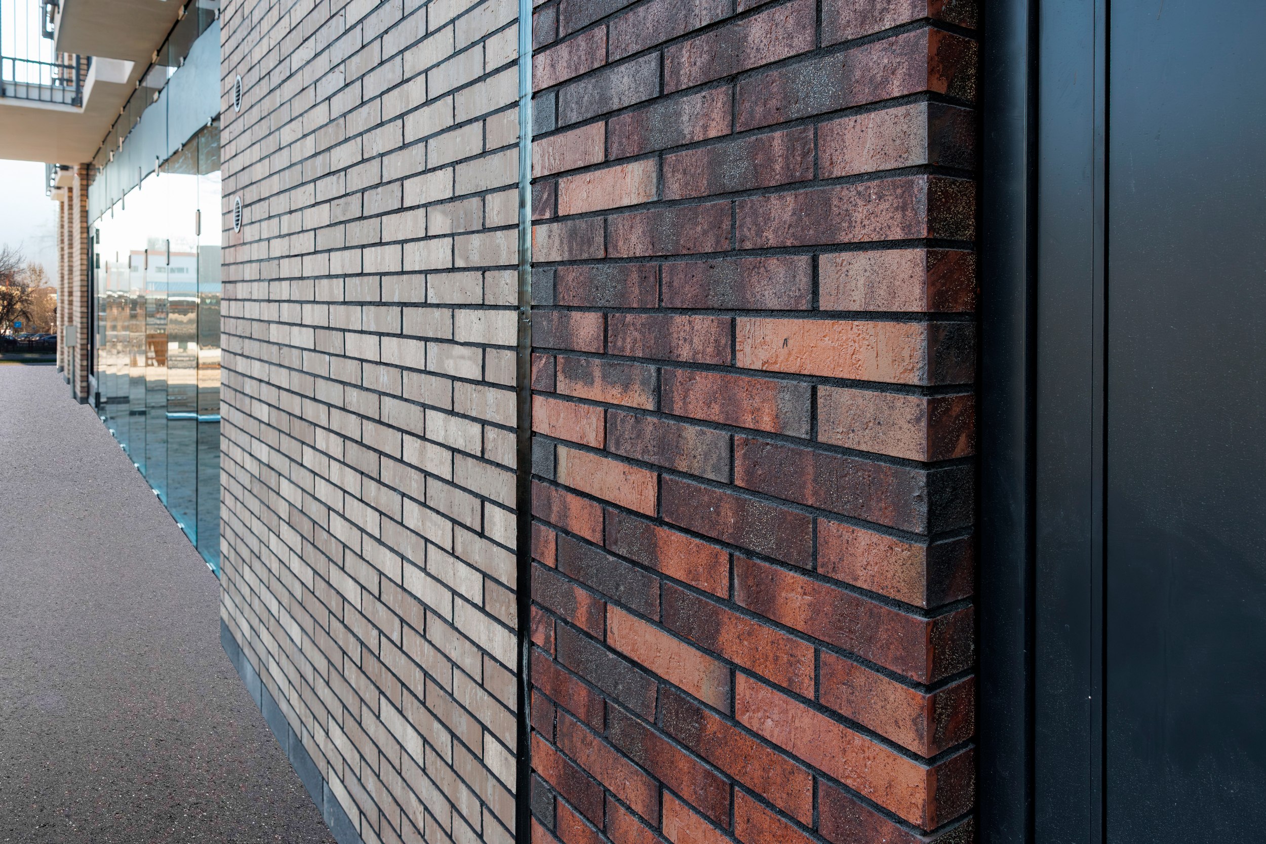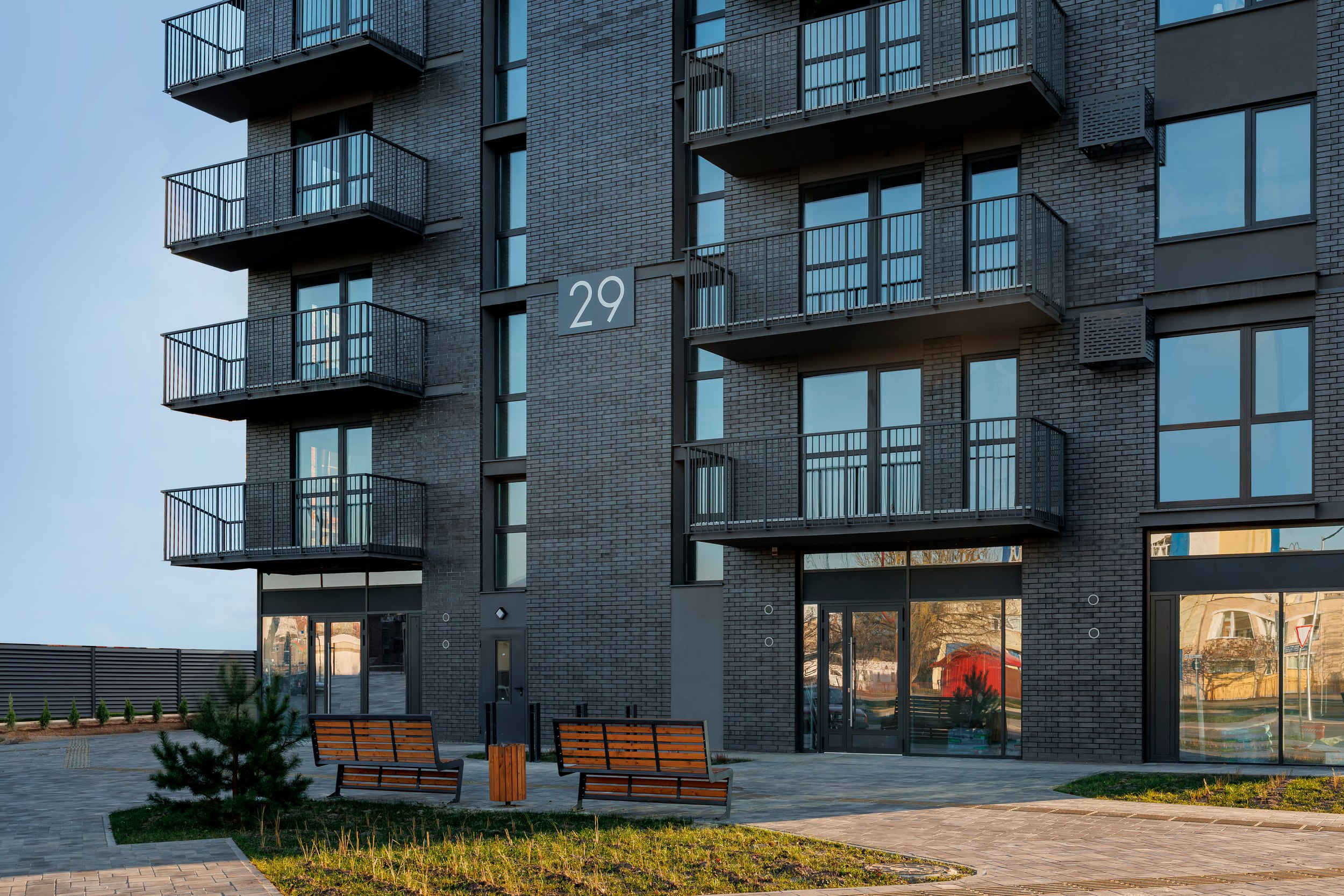 Для ЖК «ЦЕНТР» выбрали три клинкера Модформат (290×85×65 мм): Мальмё – графитово-чёрный с блеском, Брюне – винный тон, сочетающий несколько оттенков (до шести-семи), Стокгольм – серо-бежевый. Все три работают в едином ансамбле на пяти корпусах квартала.