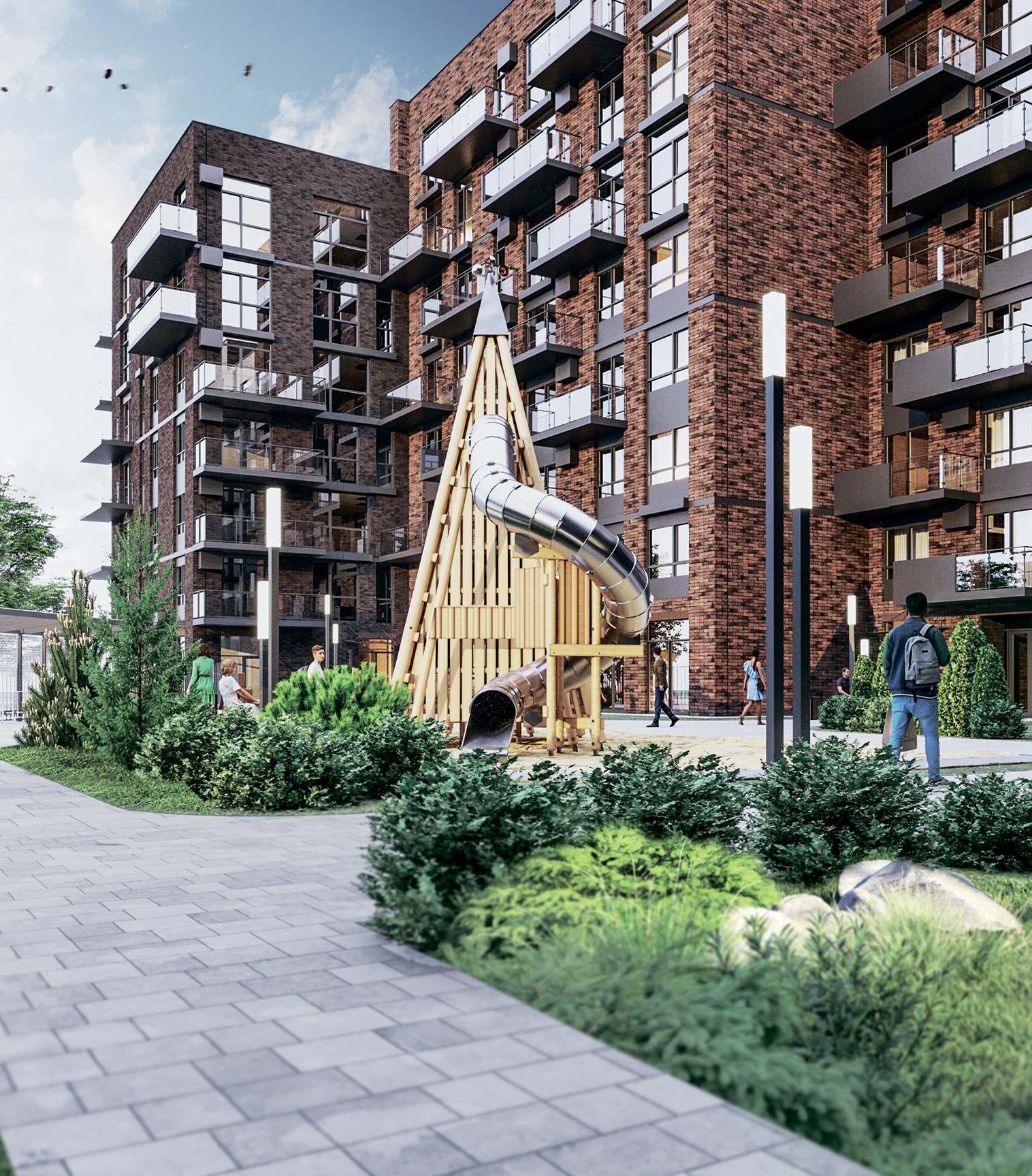 Дворы – закрытые, машины выведены за пределы дворовых территорий. Встроенные коммерческие и административные помещения ориентированы на пешеходную аллею, входные группы в жилые секции – во дворы. Потоки жителей и гостей квартала не пересекаются.