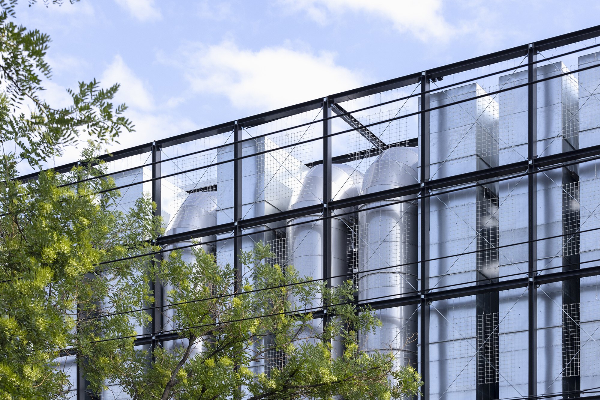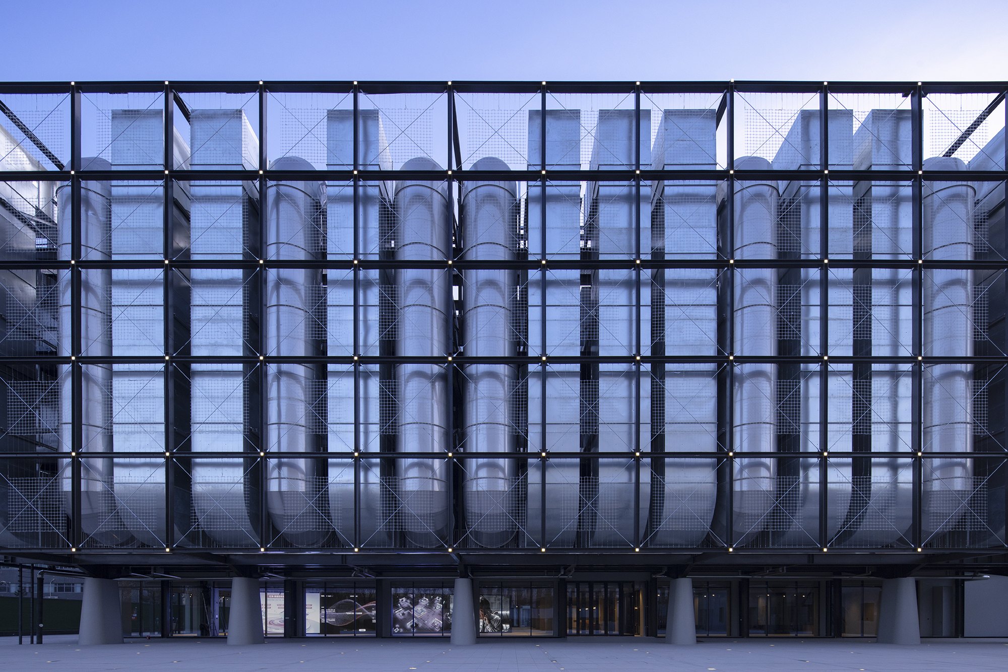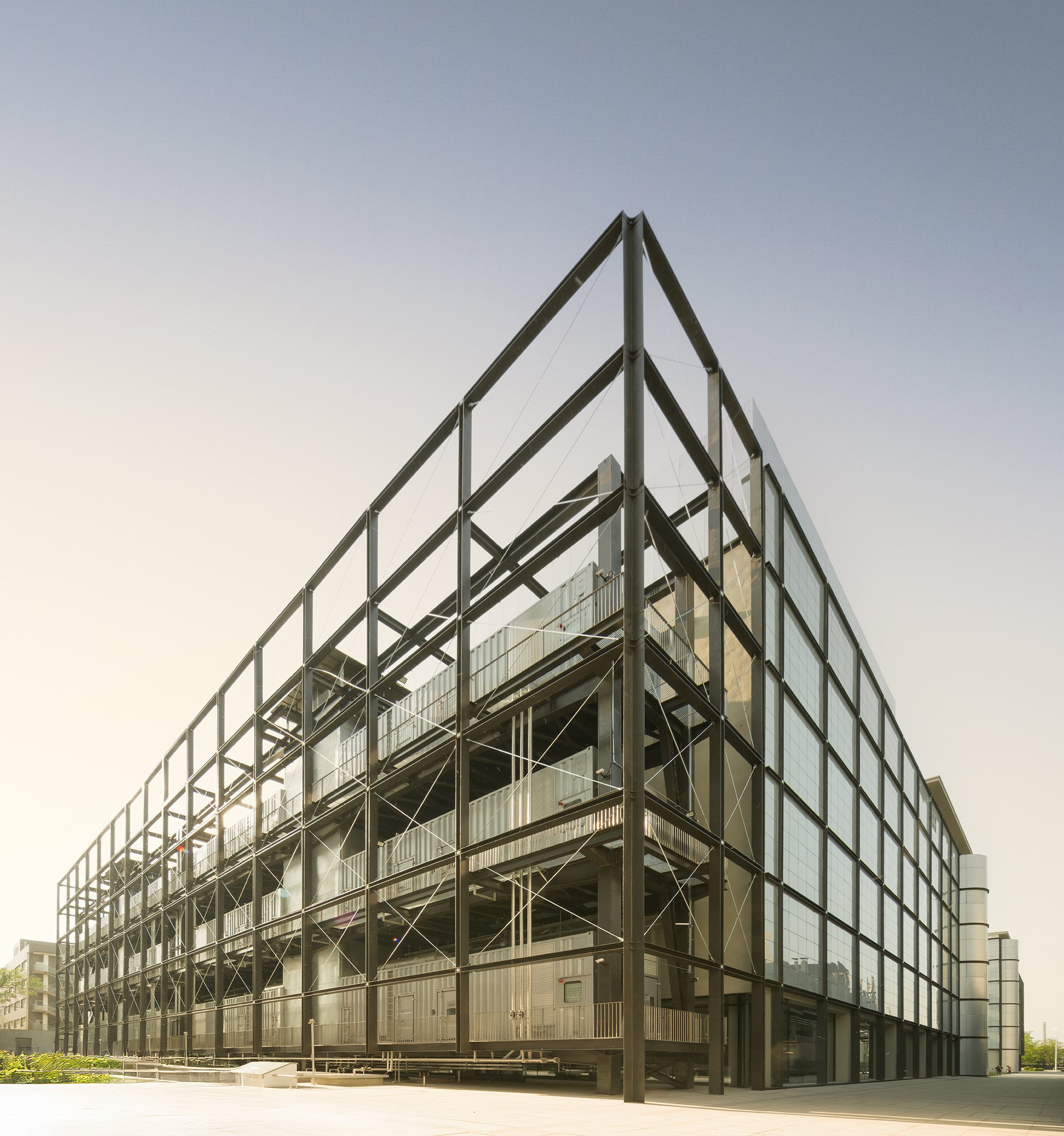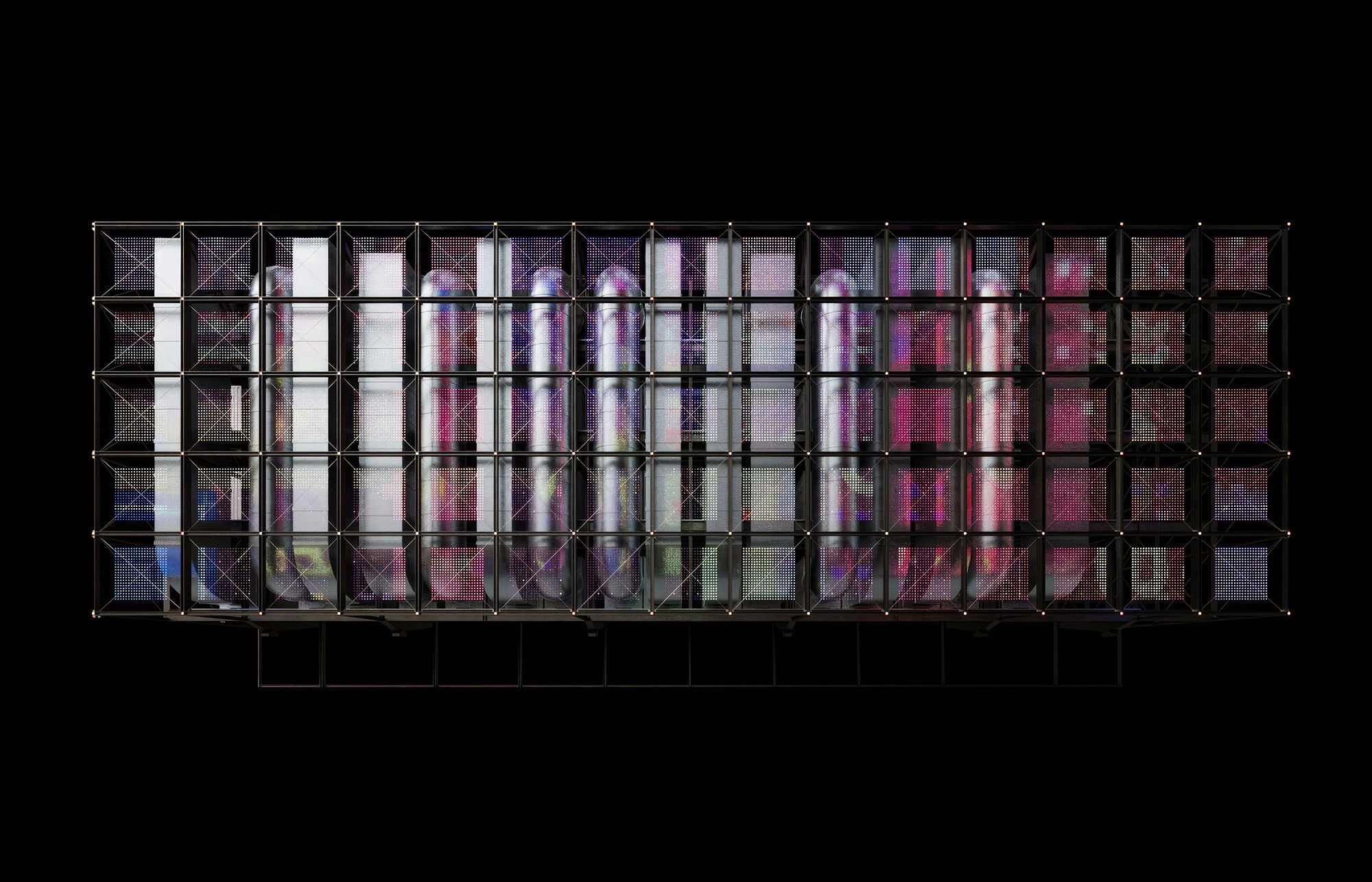 На фасады выведены обычно скрытые части дата-центра, в первую очередь – его охладительная система. В темное время суток в узлах решетчатой конструкции, поддерживающей эти внешние объекты, зажигаются светильники, но главное – это прозрачный медиафасад, обращенный на улицу. Все это призвано выражать процесс обработки информации и мощность дата-центра.