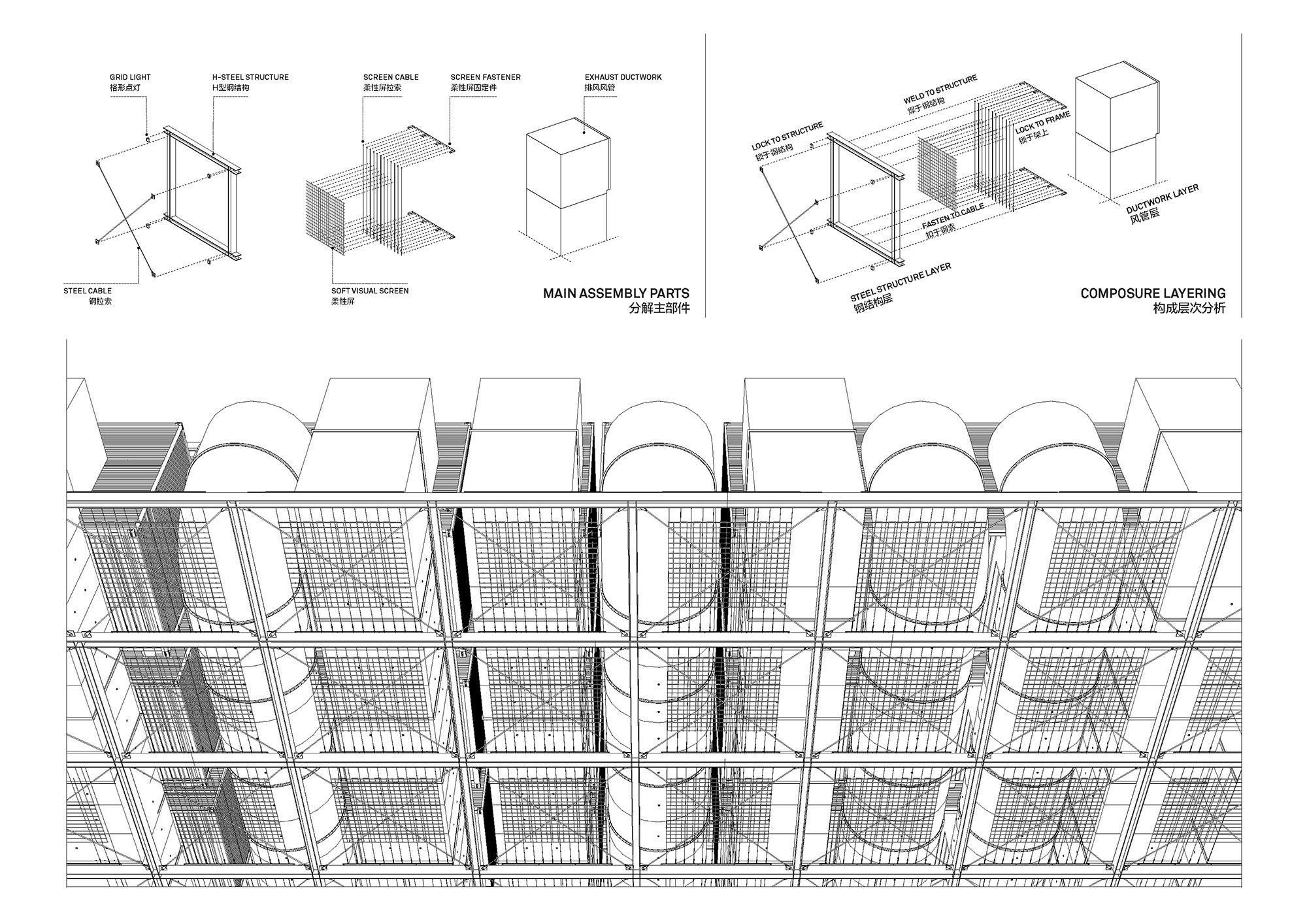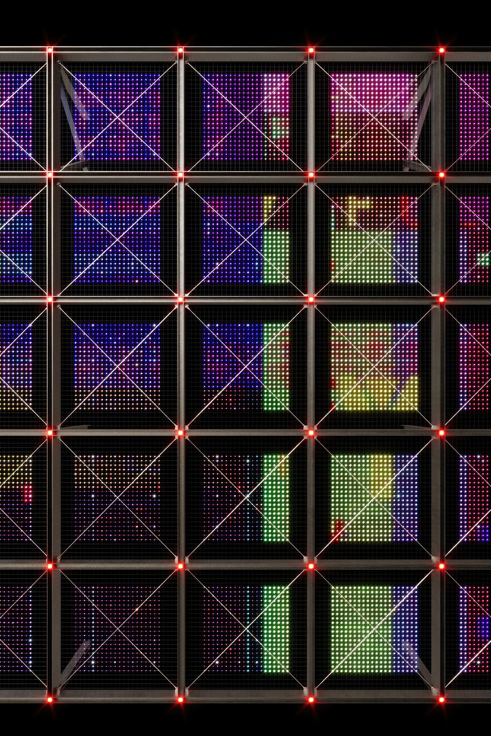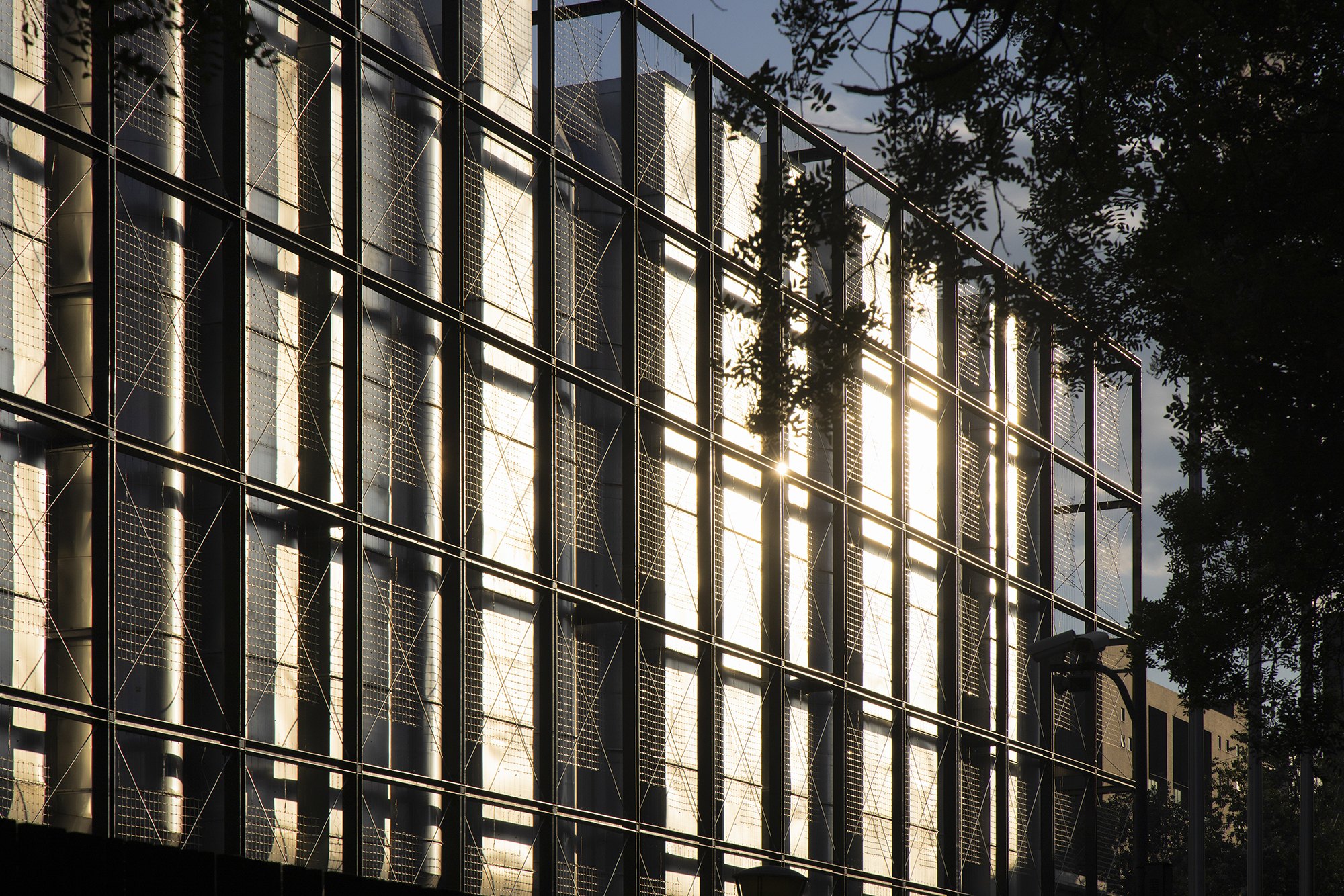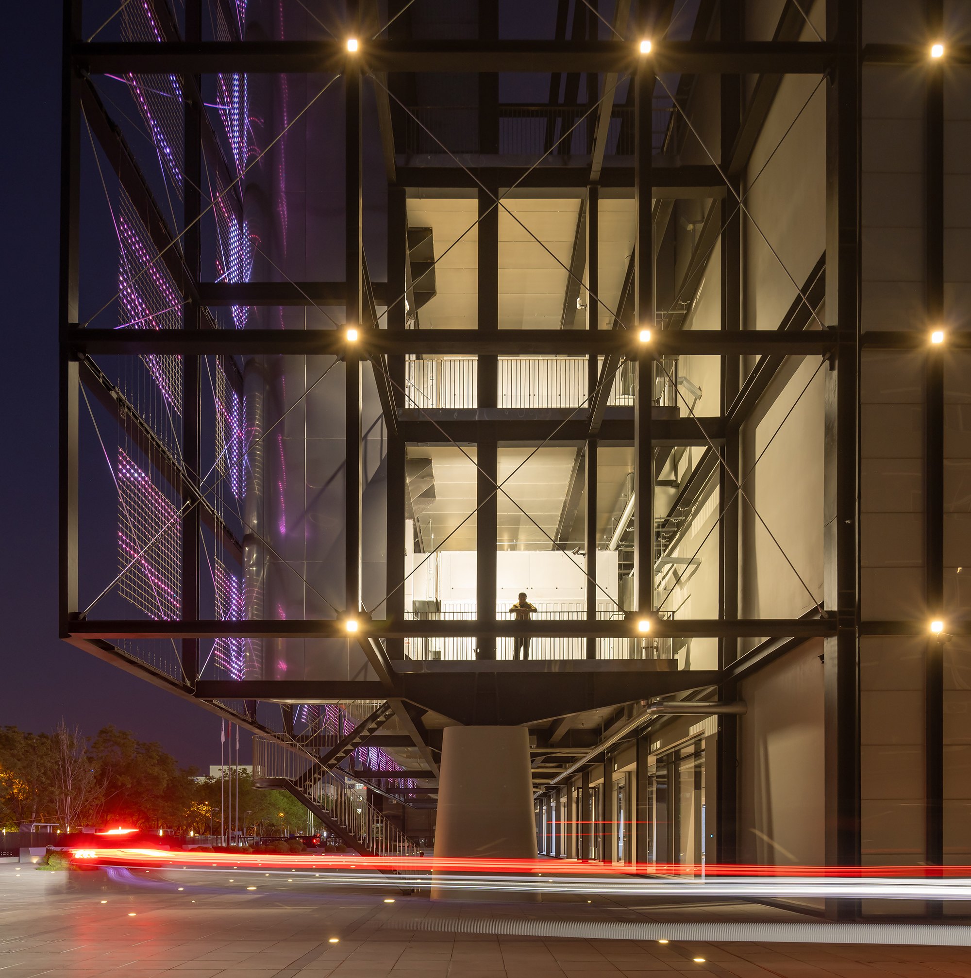 На фасады выведены обычно скрытые части дата-центра, в первую очередь – его охладительная система. В темное время суток в узлах решетчатой конструкции, поддерживающей эти внешние объекты, зажигаются светильники, но главное – это прозрачный медиафасад, обращенный на улицу. Все это призвано выражать процесс обработки информации и мощность дата-центра.