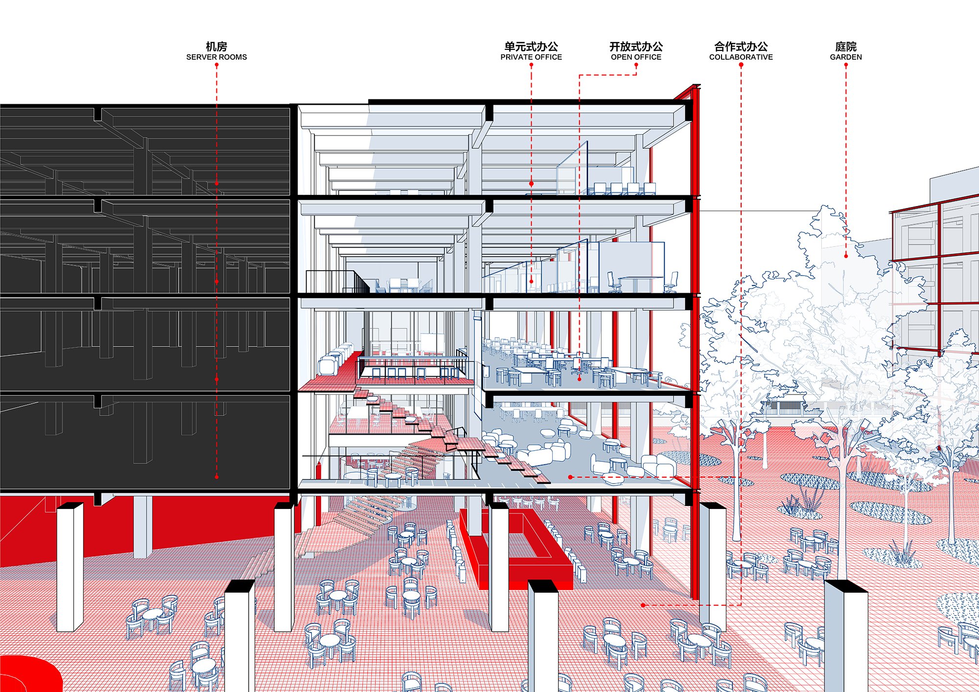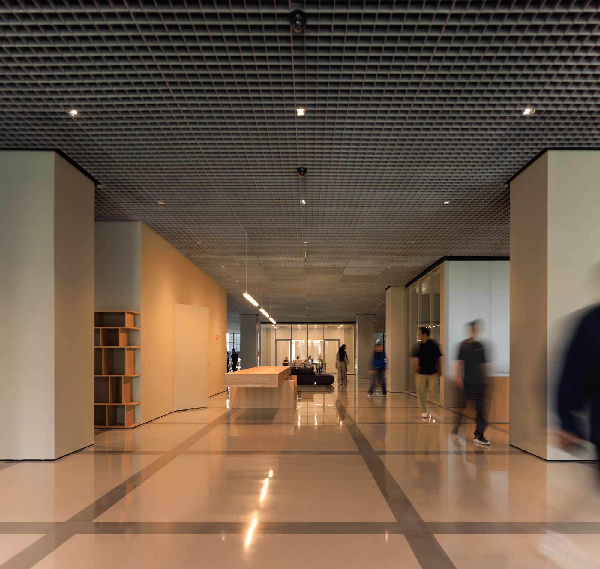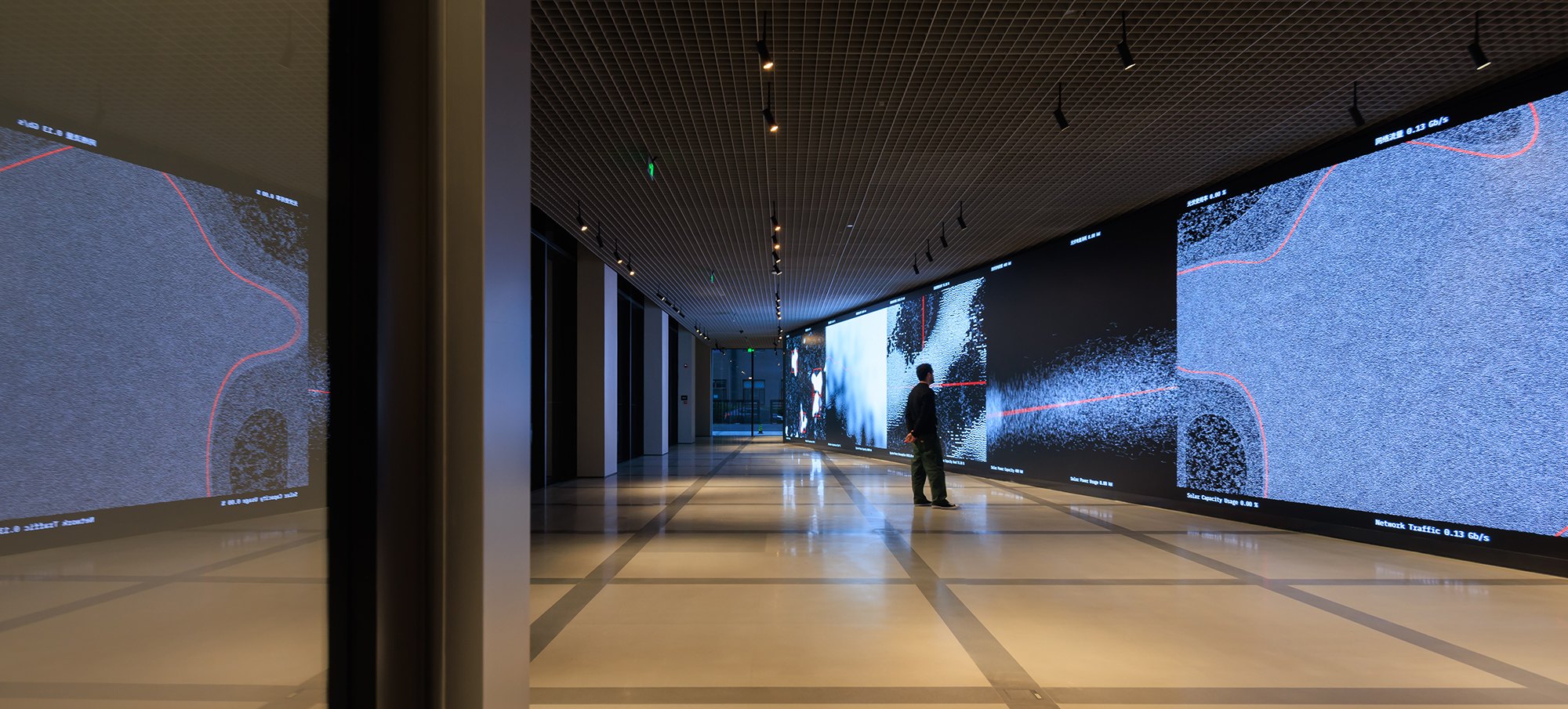 Внутри сервера соседствуют с офисными пространствами разного типа, кафе и спортзалом для резидентов, а главное – общественными и полуобщественными пространствами на первом этаже. Это многофункциональный зал «Театр вычислительных мощностей», который в будущем превратится в форум для многочисленных высокотехнологичных компаний, базирующихся в Цзюсяньцяо. Здесь есть зал типа black box, амфитеатр для презентаций и встреч, экспозиционные и демонстрационные пространства, в том числе посвященные развитию человечества от неолитических аграрных сообществ до цифровой экономики наших дней, а также достижениям КНР в производстве собственных компьютерных чипов.