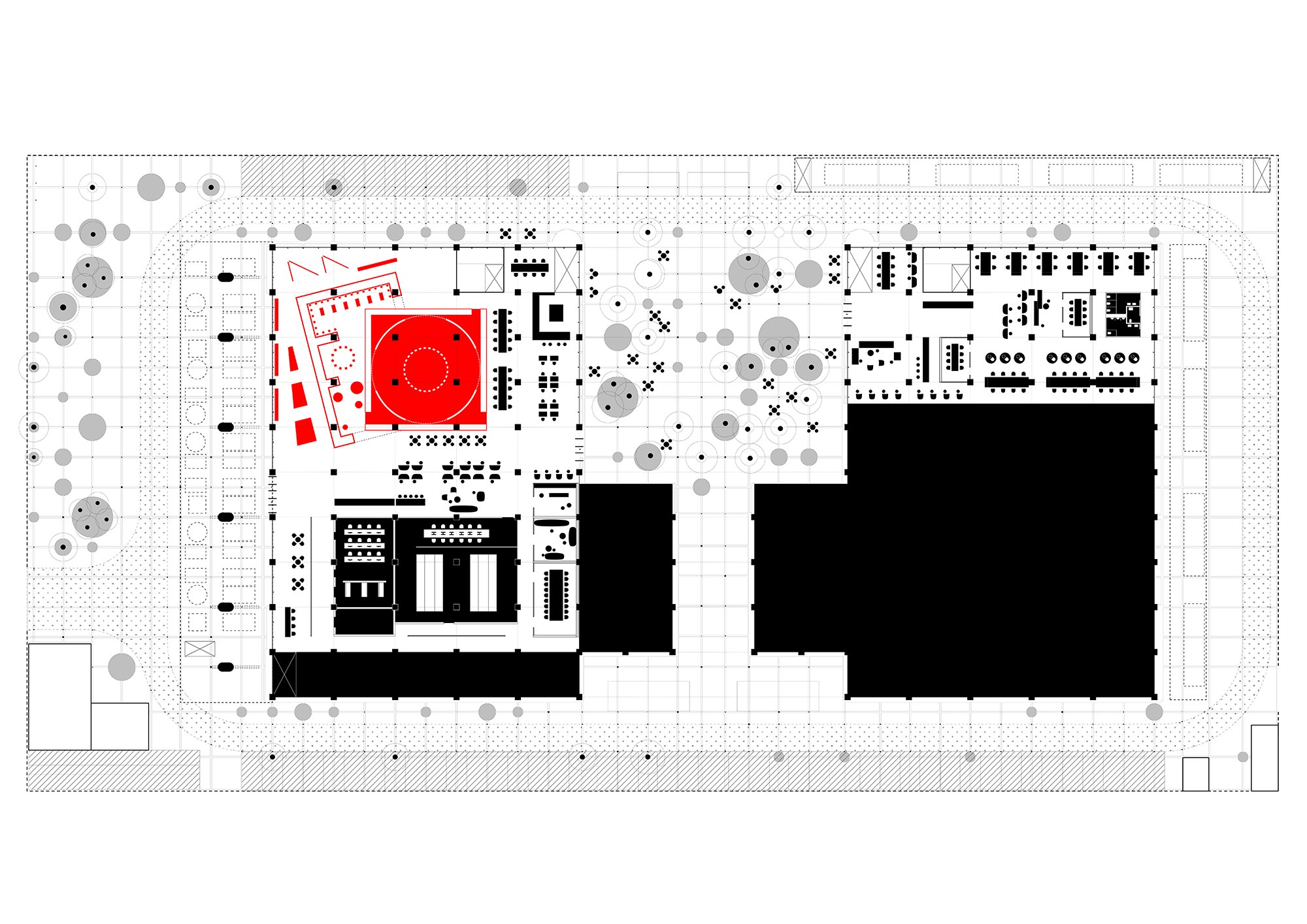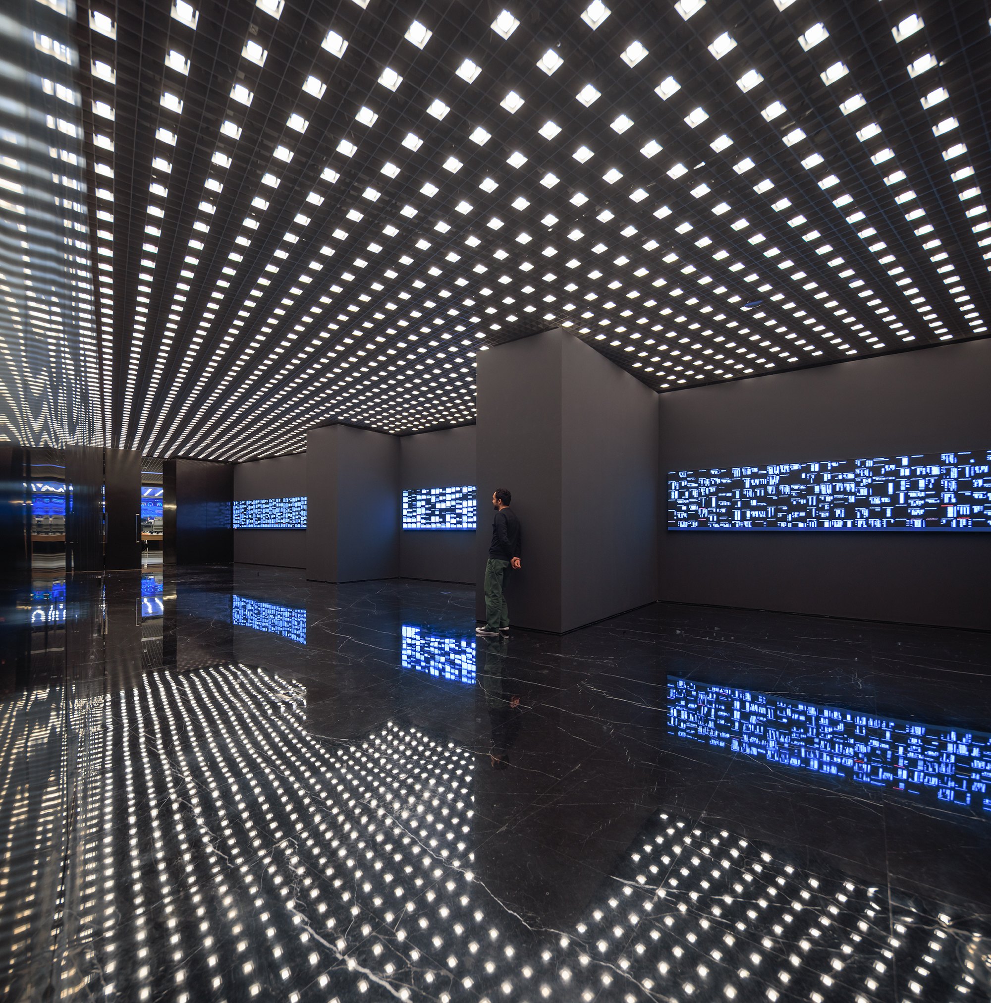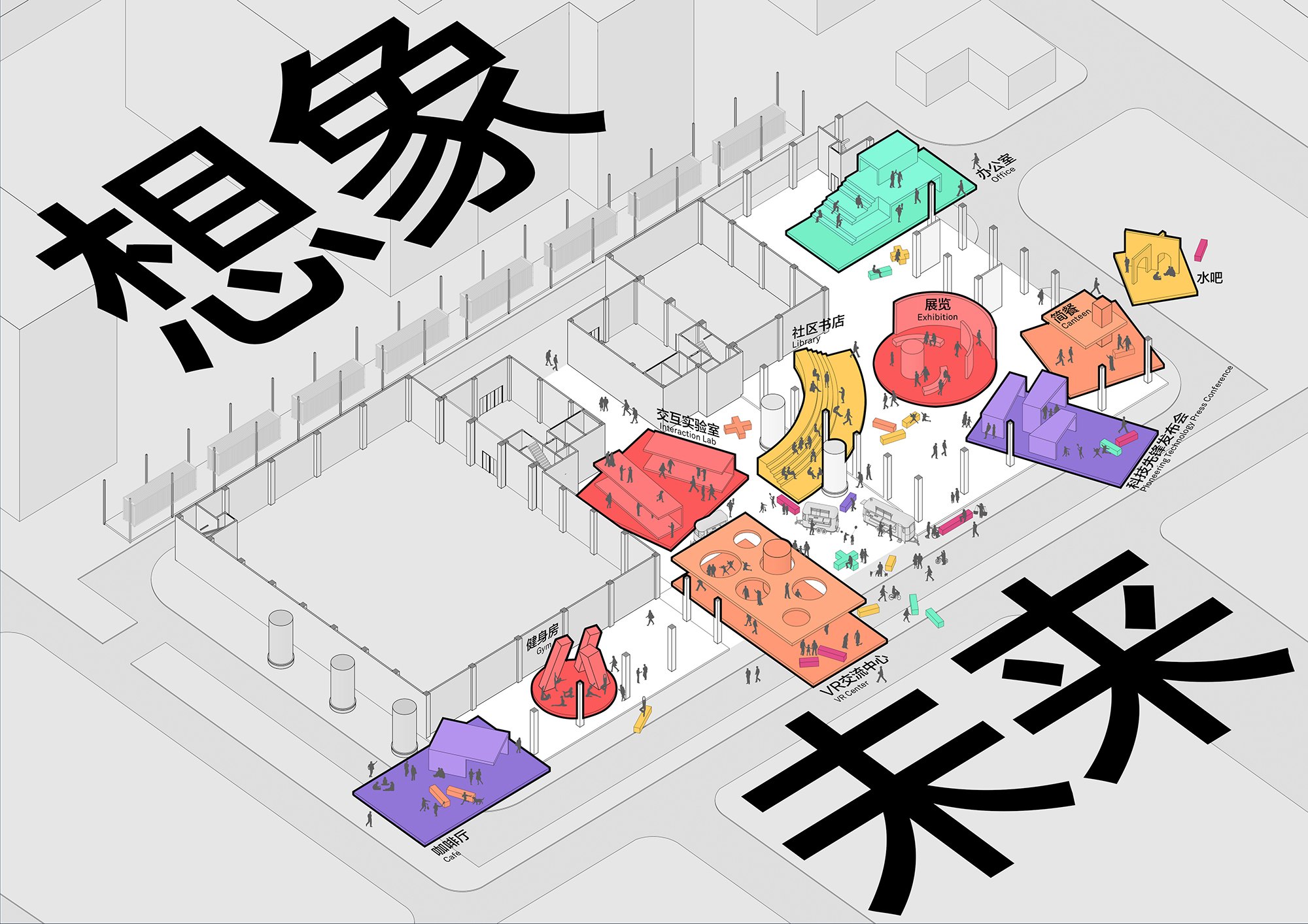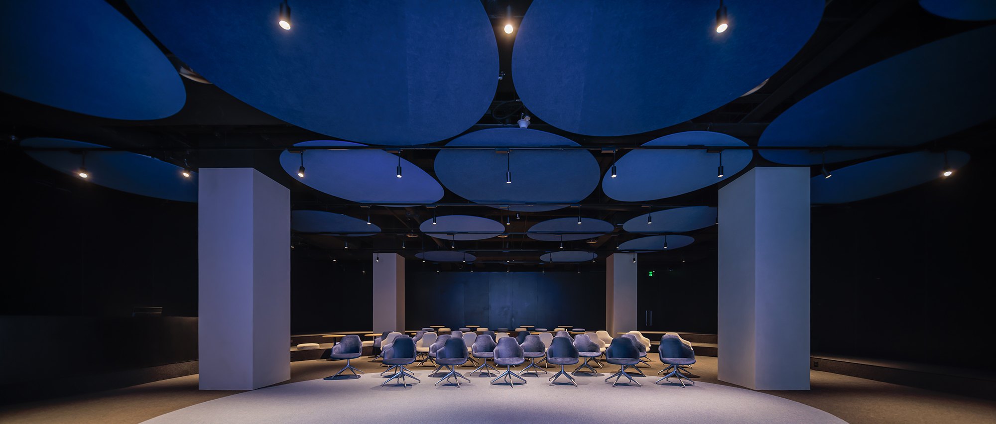 Внутри сервера соседствуют с офисными пространствами разного типа, кафе и спортзалом для резидентов, а главное – общественными и полуобщественными пространствами на первом этаже. Это многофункциональный зал «Театр вычислительных мощностей», который в будущем превратится в форум для многочисленных высокотехнологичных компаний, базирующихся в Цзюсяньцяо. Здесь есть зал типа black box, амфитеатр для презентаций и встреч, экспозиционные и демонстрационные пространства, в том числе посвященные развитию человечества от неолитических аграрных сообществ до цифровой экономики наших дней, а также достижениям КНР в производстве собственных компьютерных чипов.