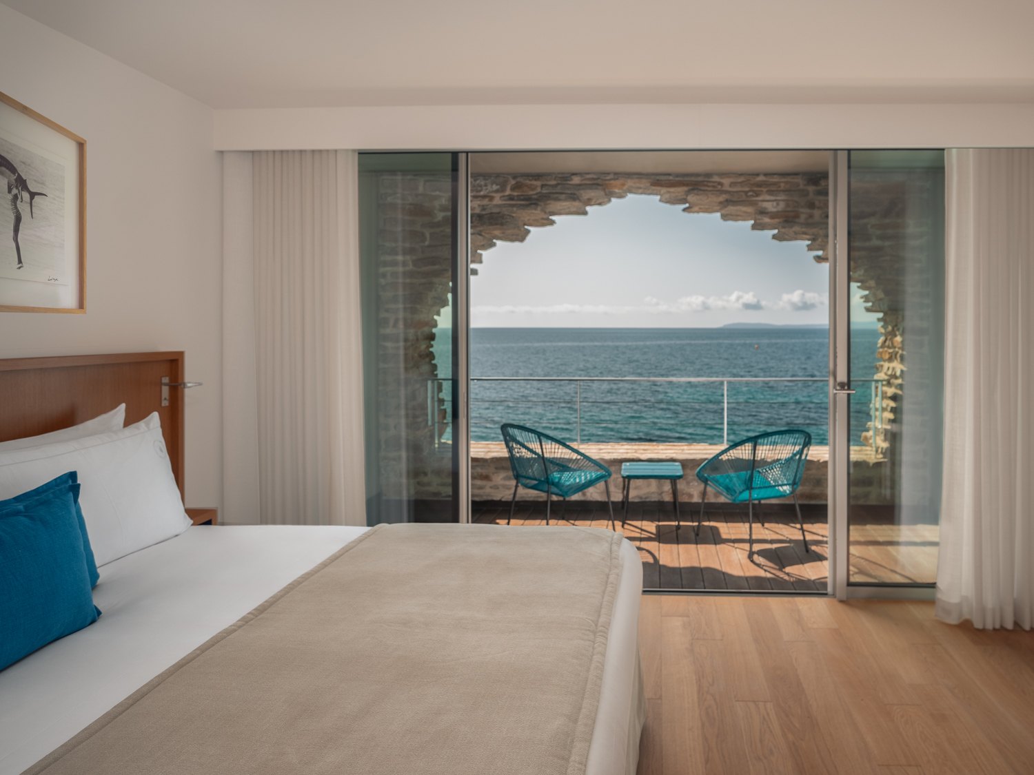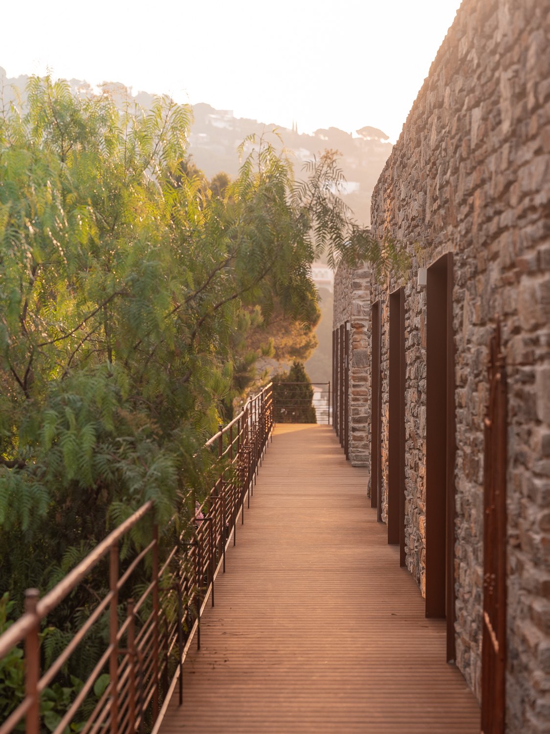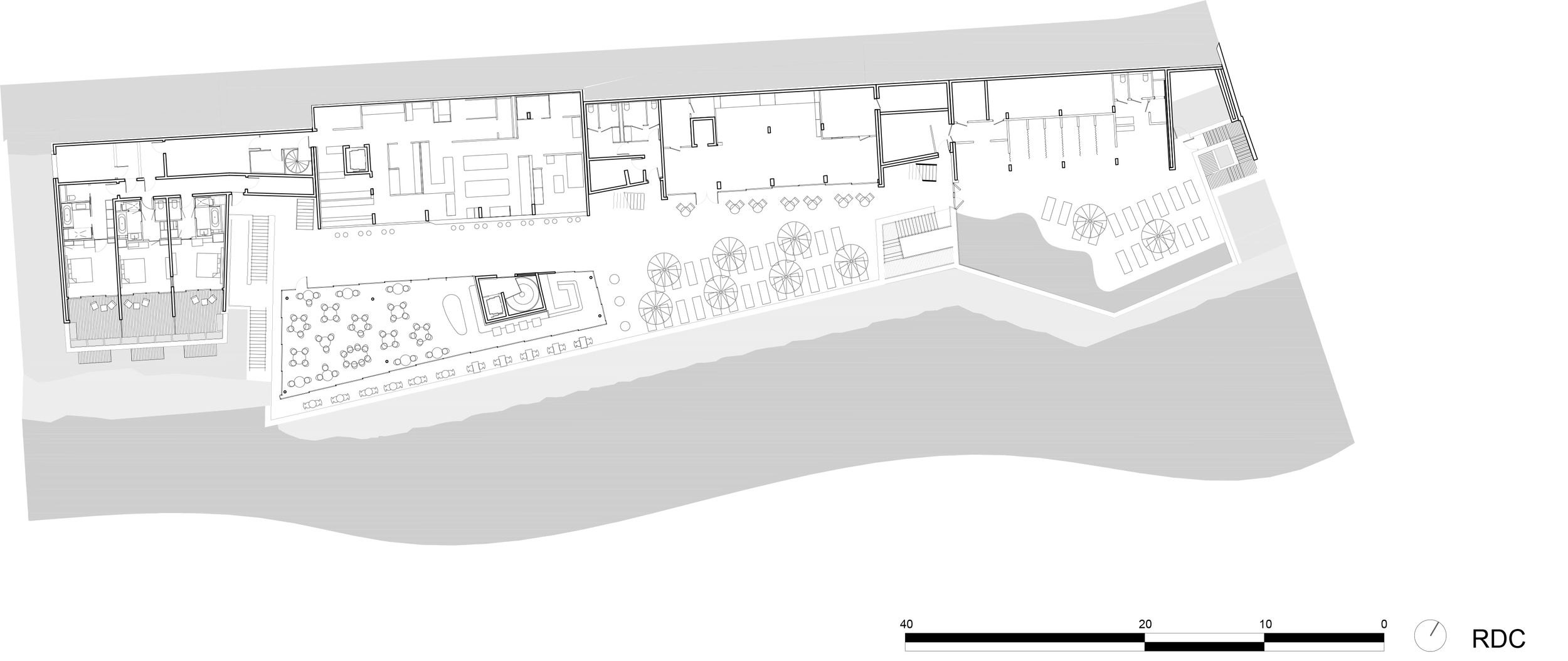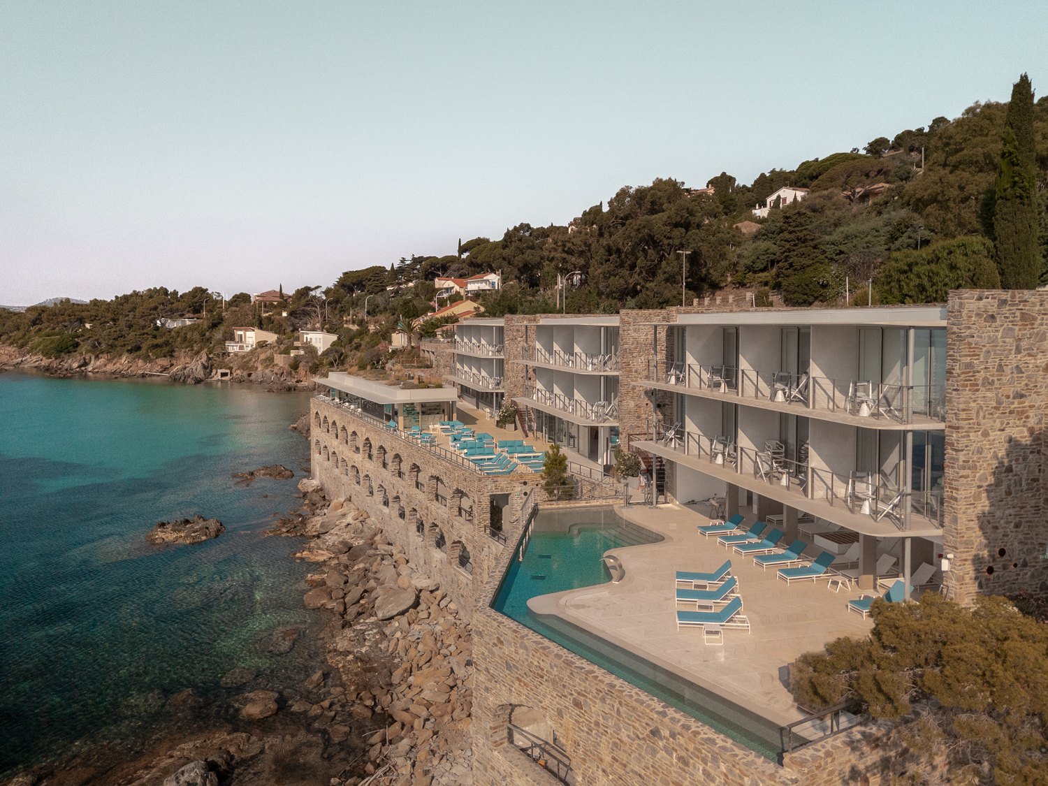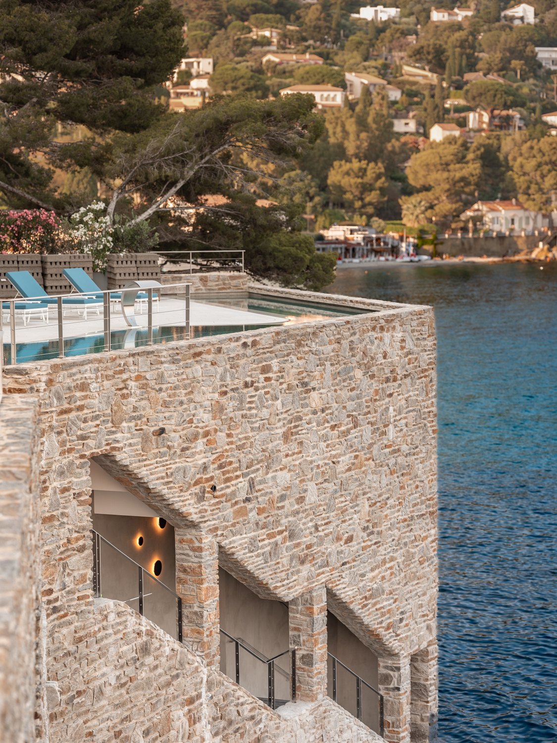 Бюро Pietri Architectes посчитало достойным сохранения только основание здания, облицованное грубым местным камнем: оно представляет собой типичное для этой местности решение. Теперь здесь расположена часть номеров (всего их 40), напоминающих гроты. Архитекторы сравнивают эту часть с сооружениями троглодитов, то есть пещерных жителей, и это тоже уместно: на южном побережье Франции сохранилось немало их следов.
