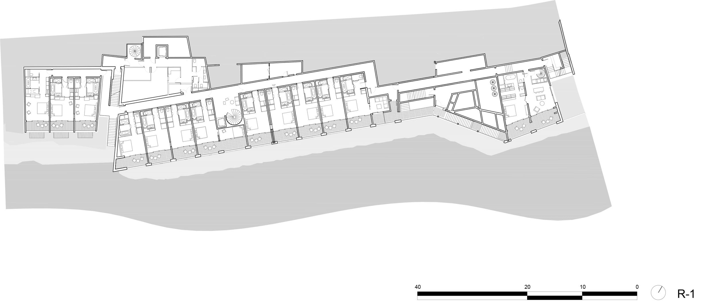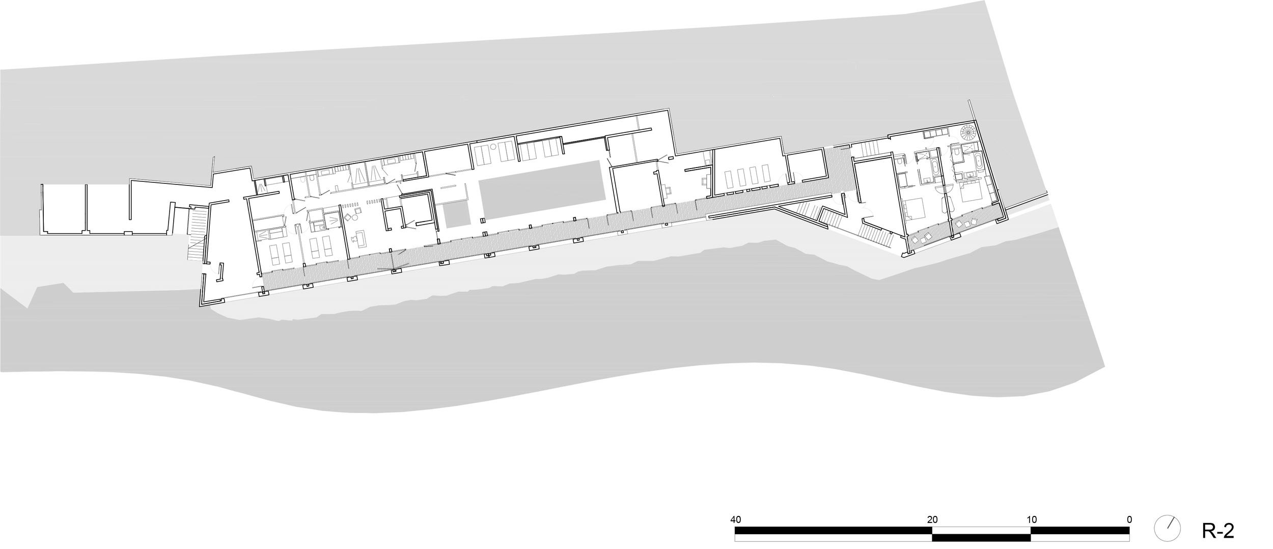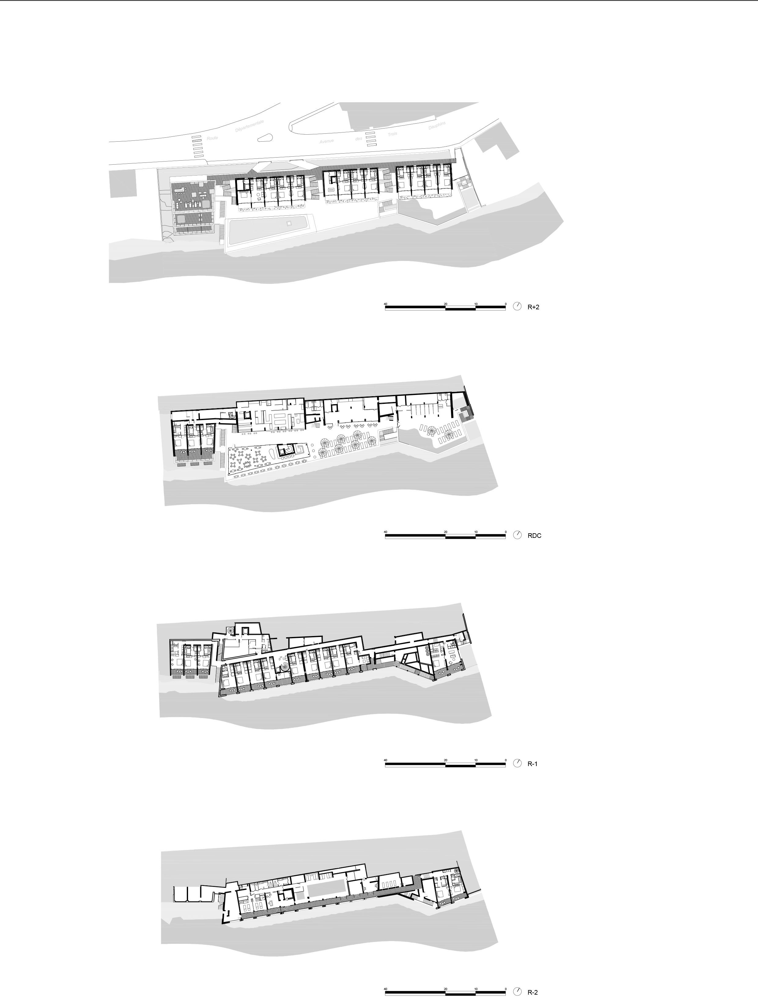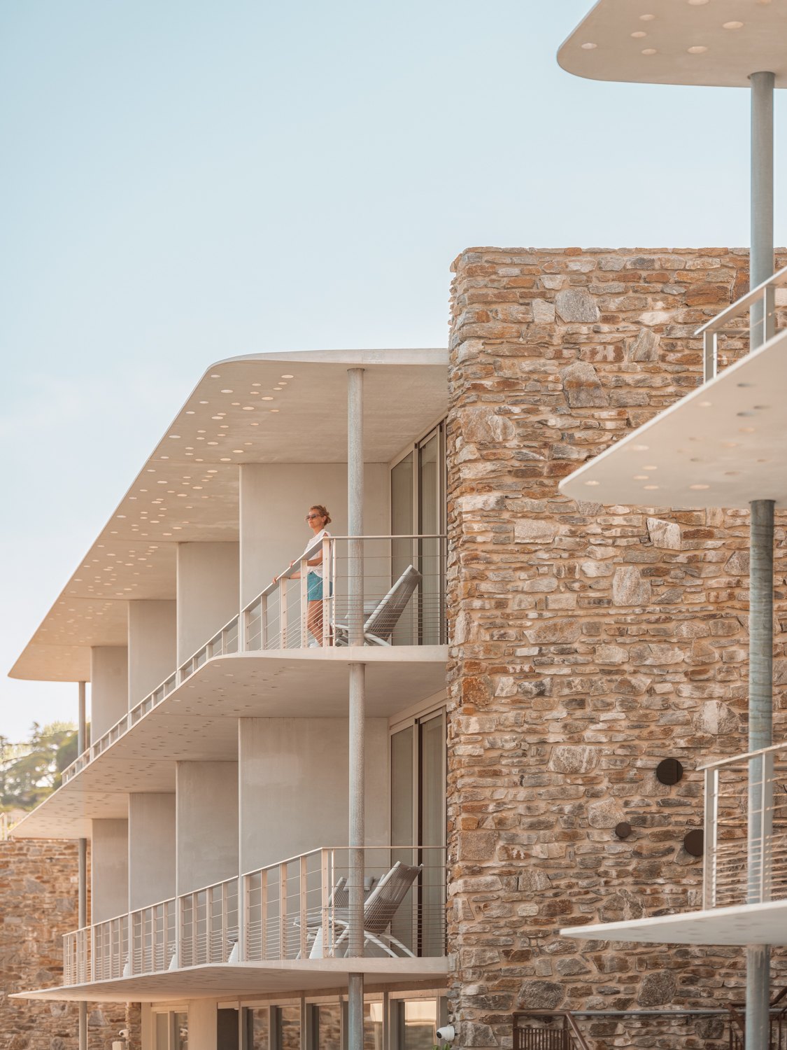 Выше расположены четыре объема с характерными перфорированными навесами из сверхпрочного фибробетона, напоминающие о послевоенной модернистской курортной архитектуре. Объемы разделены озелененными «ущельями», через которые перекинуты мостики.