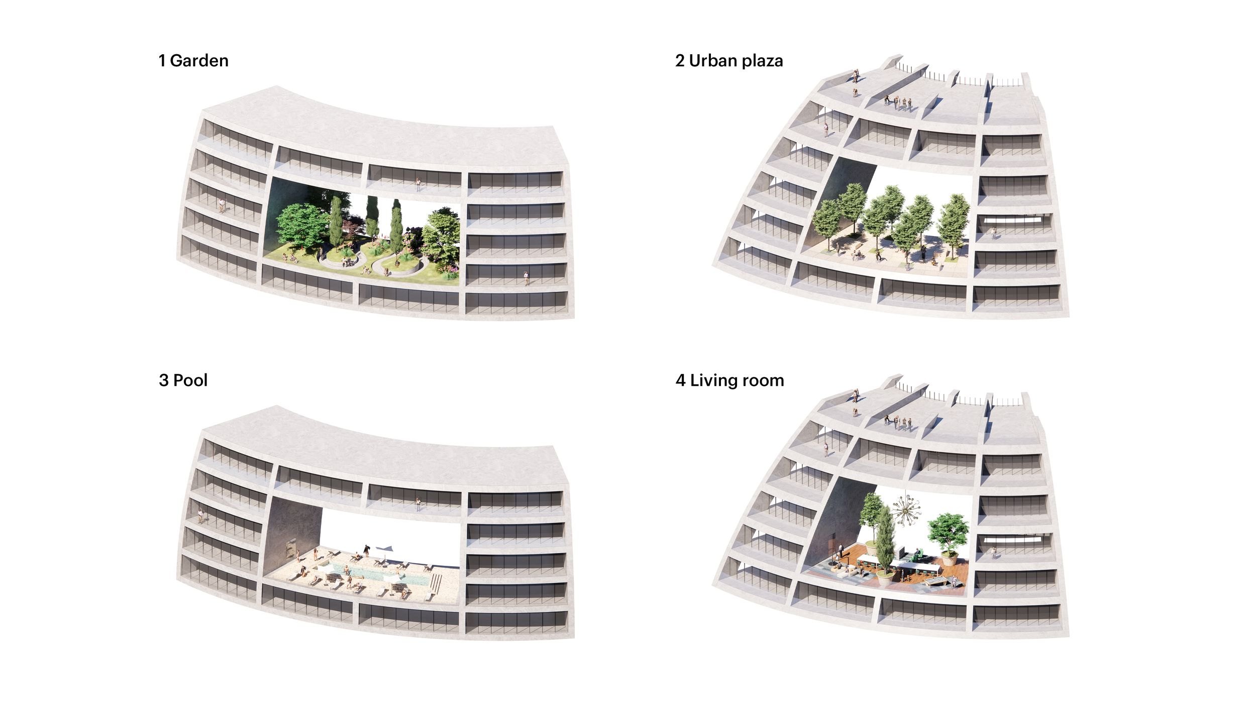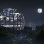 Всю половину сферы выше «экватора» займут квартиры: часть будет обращена наружу, часть – одновременно наружу и внутрь. По периметру остекления устроят озелененное общественное пространство, сады также появятся в прорезанных в сфере проемах высотой в 3–4 этажа.