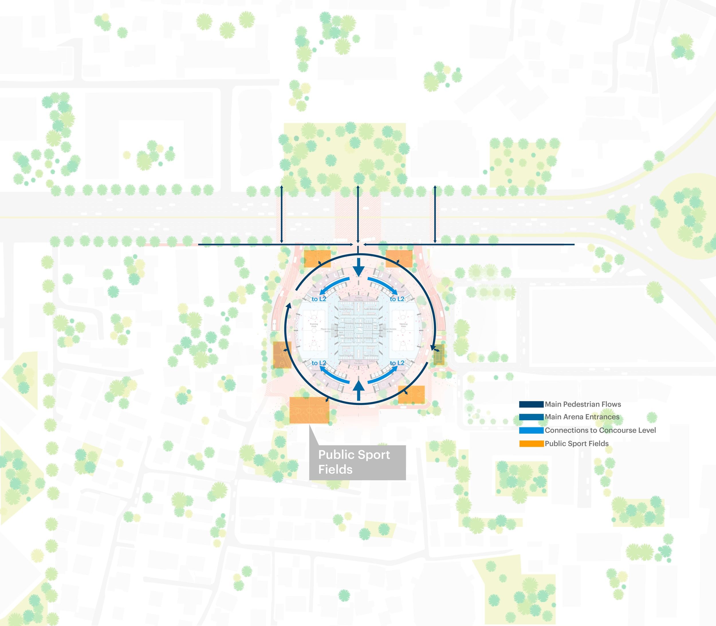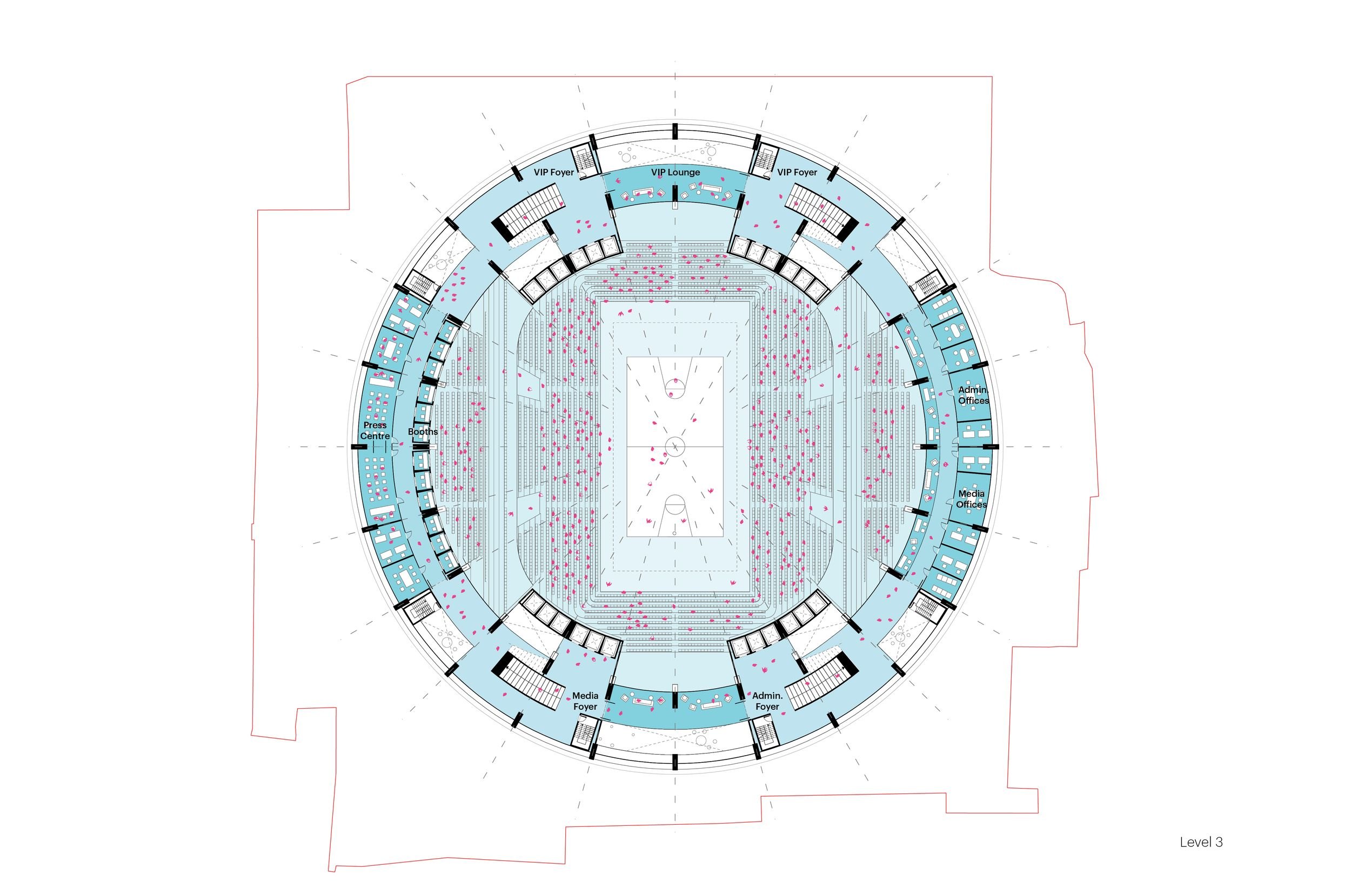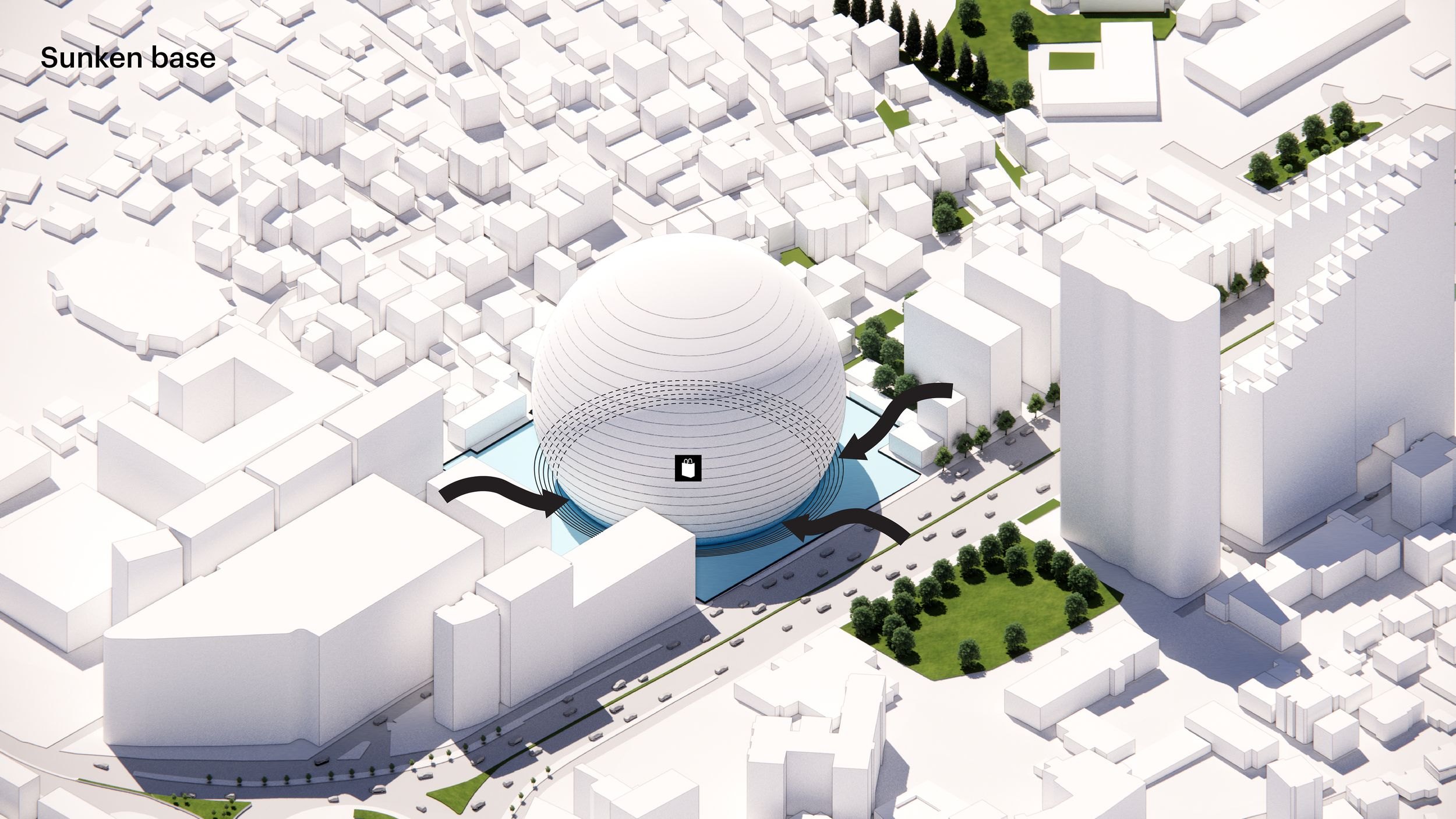 Сфера будет чуть утоплена в землю: в цоколе, куда с уровня улицы приведут ступени-трибуны, откроются кафе и магазины, а также иная необходимая арене инфраструктура. Выше разместится сама арена, предназначенная для волейбольных и баскетбольных матчей на 6000 зрителей. Внутрь можно будет попасть по перекинутым над цокольным ярусом коротким мостам. Под трибунами арены устроят две тренировочные спортивные площадки.