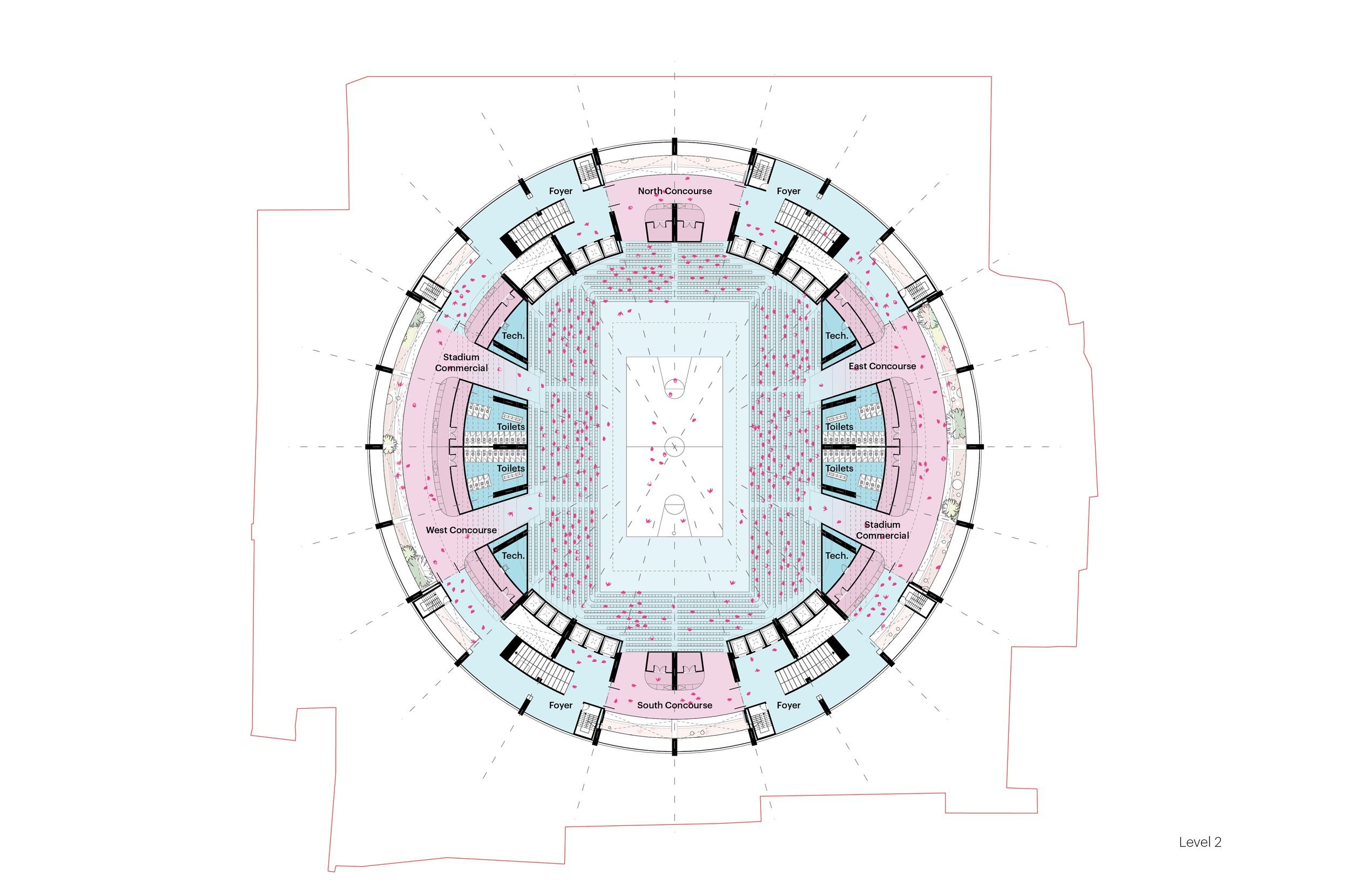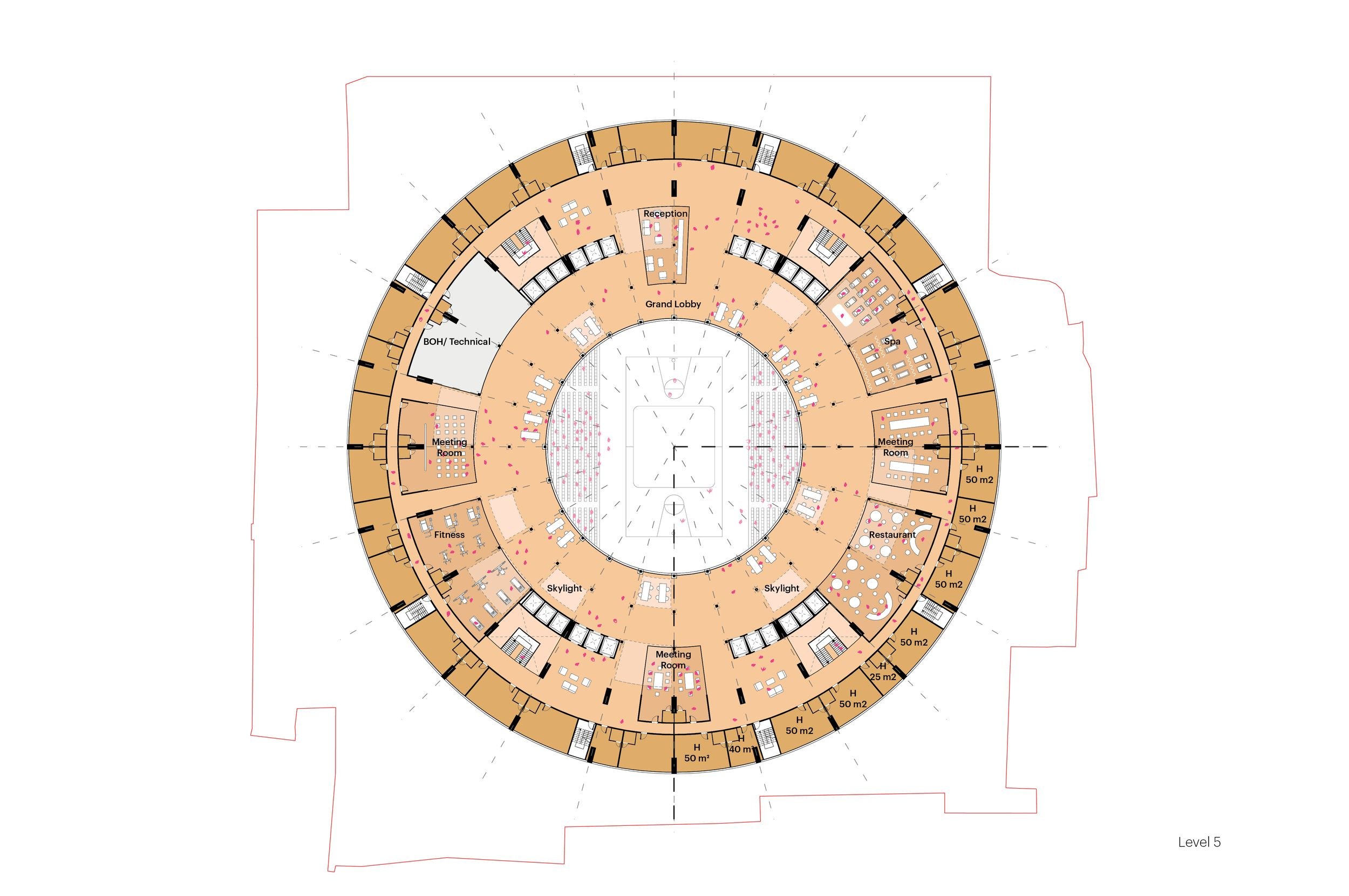 Два уровня над ней займет отель: часть номеров будет выходить на арену; следить за матчами у постояльцев получится и из пространств общего пользования. Консольные выносы гостиничных блоков будут поддерживать остекление, проходящее по «экватору» сферы. Его можно будет закрыть полностью, чтобы обеспечить звукоизоляцию.