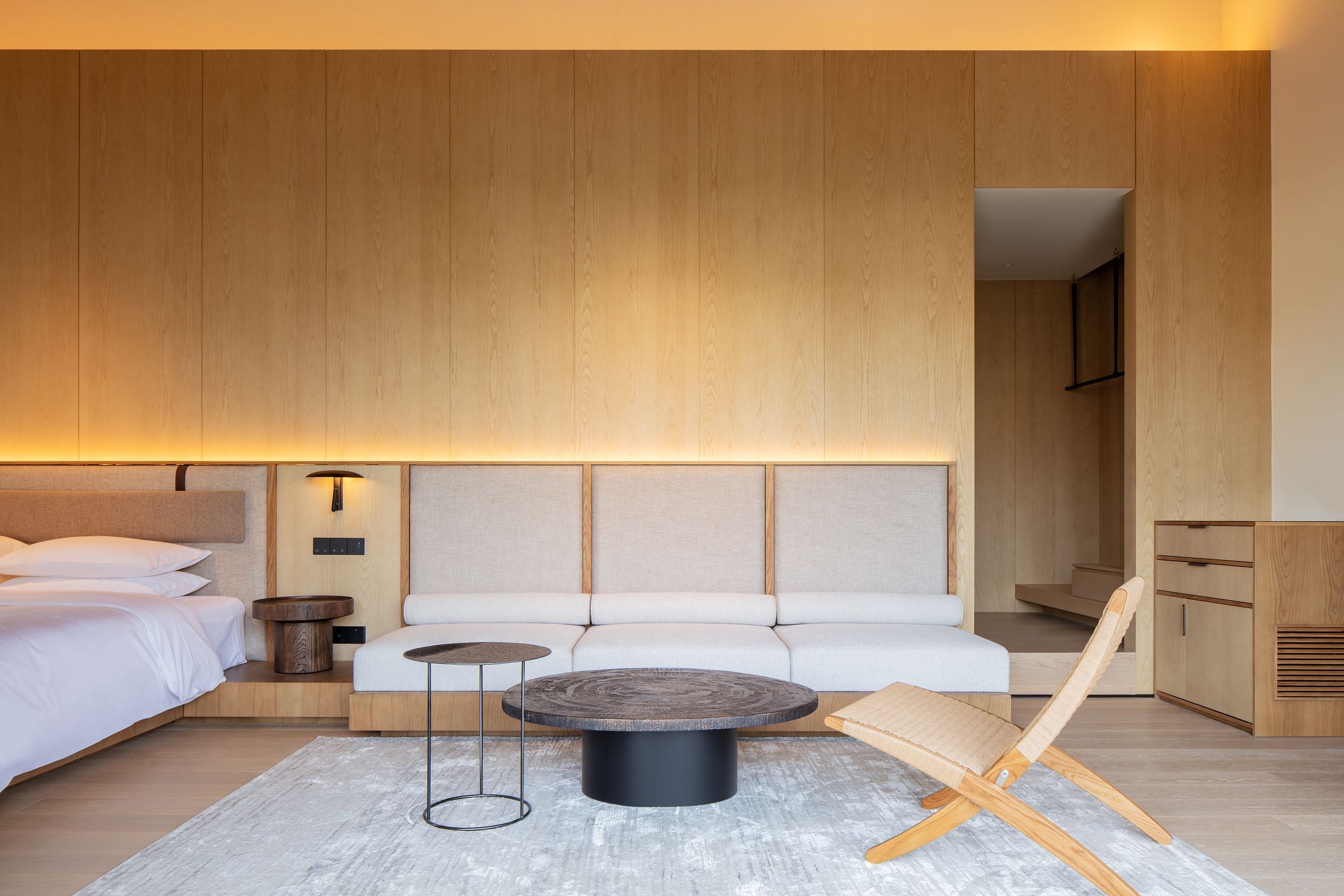 Сами же номера (всего их 40), часть из которых устроены в исторических корпусах, получили минималистичную отделку из натуральных материалов с сохранением всех ценных элементов и местного колорита, в которую органично, почти незаметно интегрированы необходимые удобства. Вместе все корпуса напоминают систему павильонов в традиционном китайском саду и соединены укромными зелеными зонами, переходами и разнообразными полуоткрытыми пространствами.