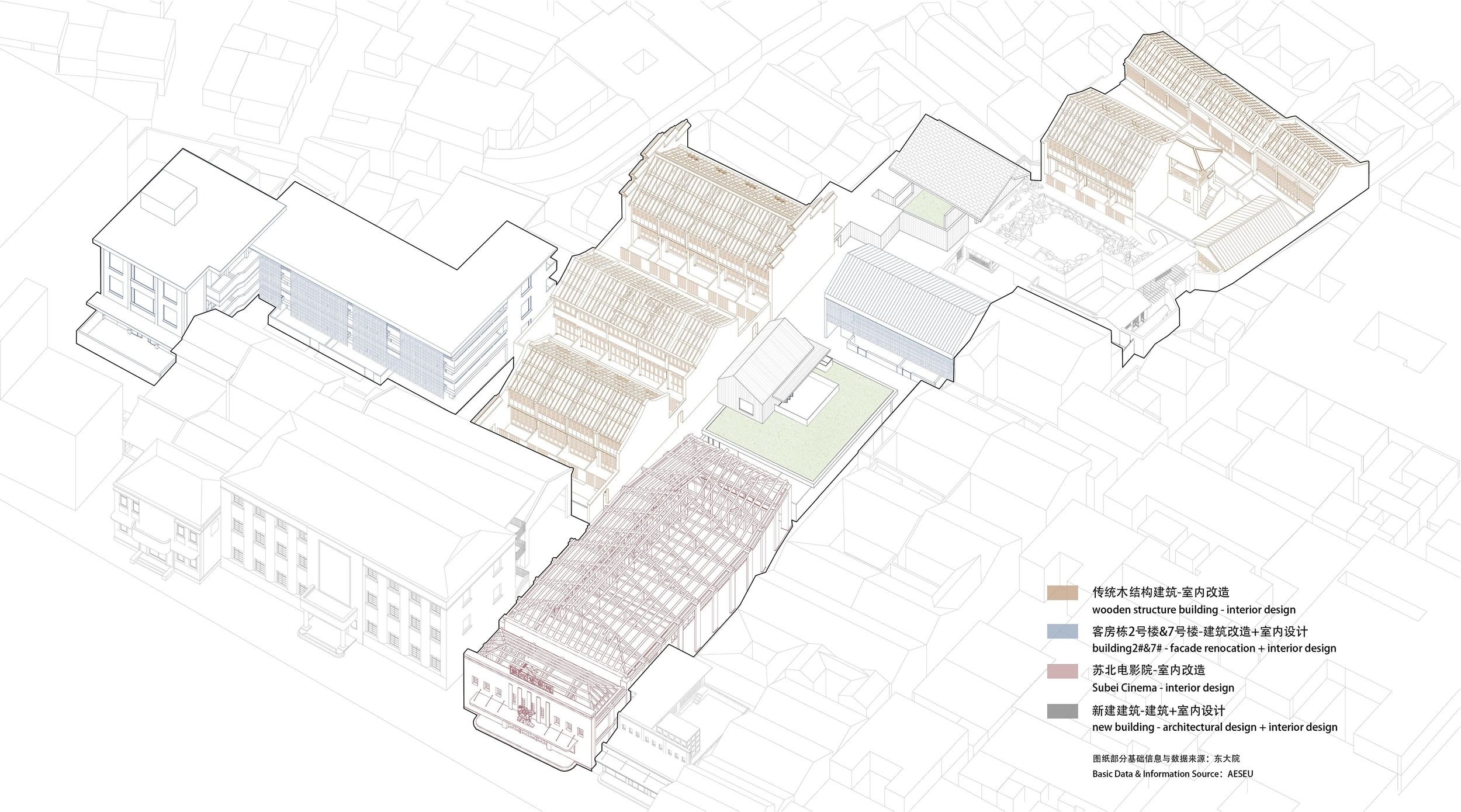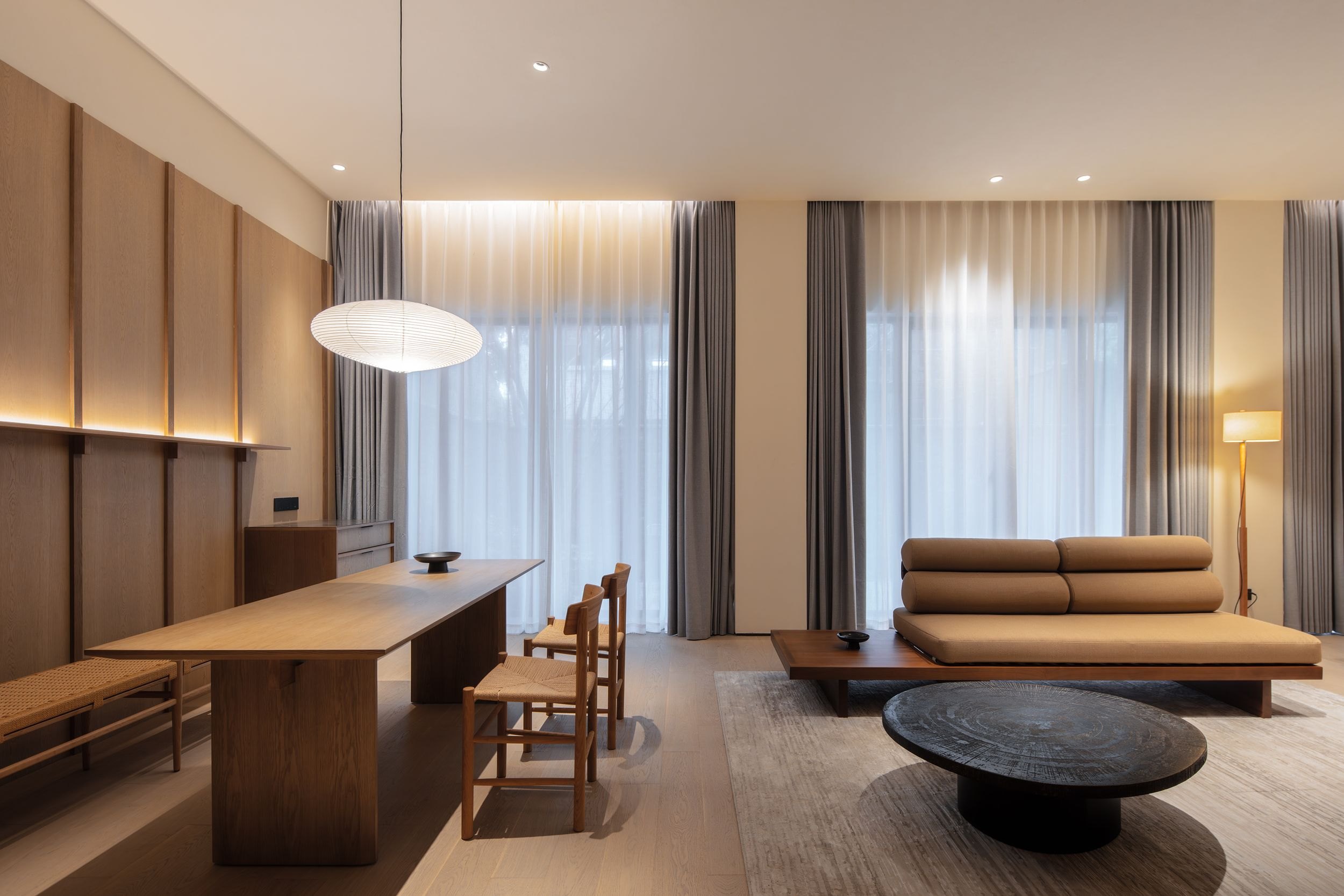 Японский дух отчетливо различим в новом образе оформленного ими отеля Jiangnan House с его деревянной отделкой, вниманием к фактурам и ничем не нарушаемым плоскостям. Перед архитекторами стояла задача собрать воедино здания, построенные из разных материалов (дерево, кирпич, бетон) в разное время и имеющие разную историческую ценность, а также дополнить плотную низкоэтажную застройку новыми объемами и связать все богатым ландшафтным решением. При этом общий дух необходимо было сохранить. В результате часть объектов и их фрагментов тщательно реставрировали, часть реконструировали, часть серьезно перестроили, а часть возвели полностью с нуля.