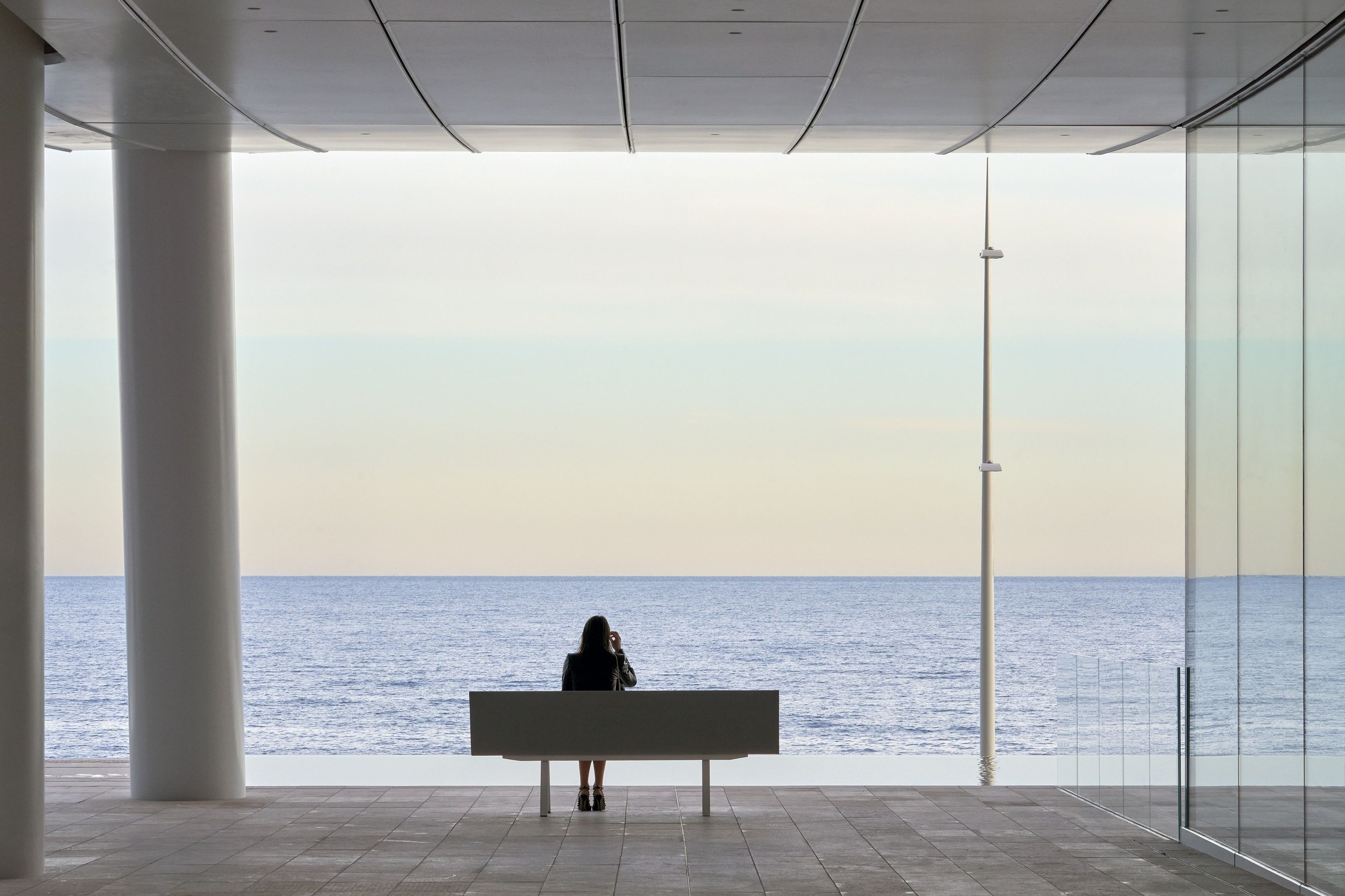 Светлые, круглого сечения наклонные тонкие «ноги» входят в скругленное «днище» сквозь аккуратные отверстия. Белые тонкие штанги перед балконами – этакие тонкие «ванты». Если про Гери говорили, что он использует авиационные технологии, то здесь, во всяком случае по ощущениям, качество не ниже.
