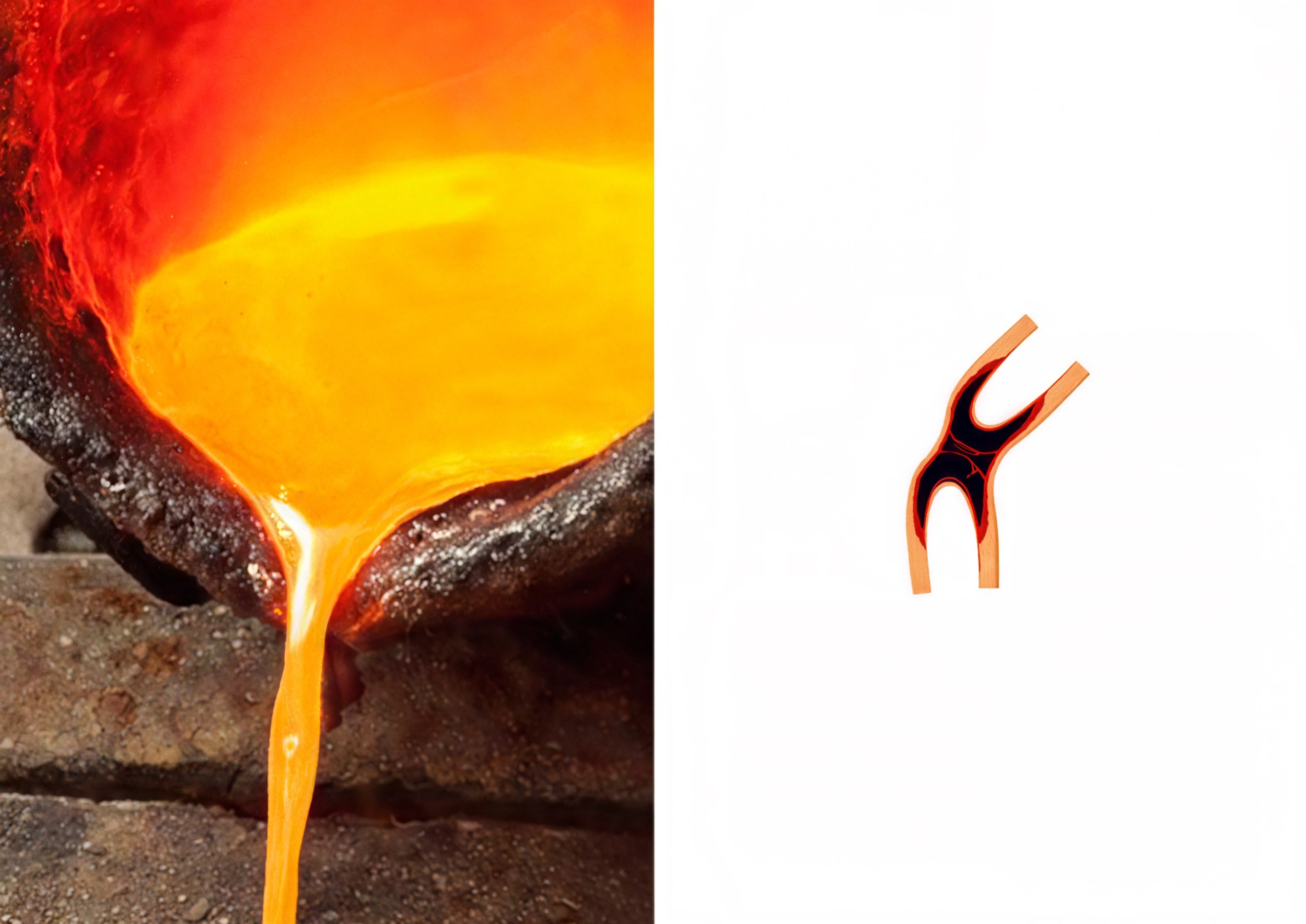Концепция – образ кузнеца как древнего бога, выливающего лаву, которую одновременно можно осмыслить и как раскаленное железо. Столкнувшись с холодным камнем, горячий материал принял футуристичную форму, которую ему позволила природа. Застывшая масса превращается в цепь из двух звеньев.