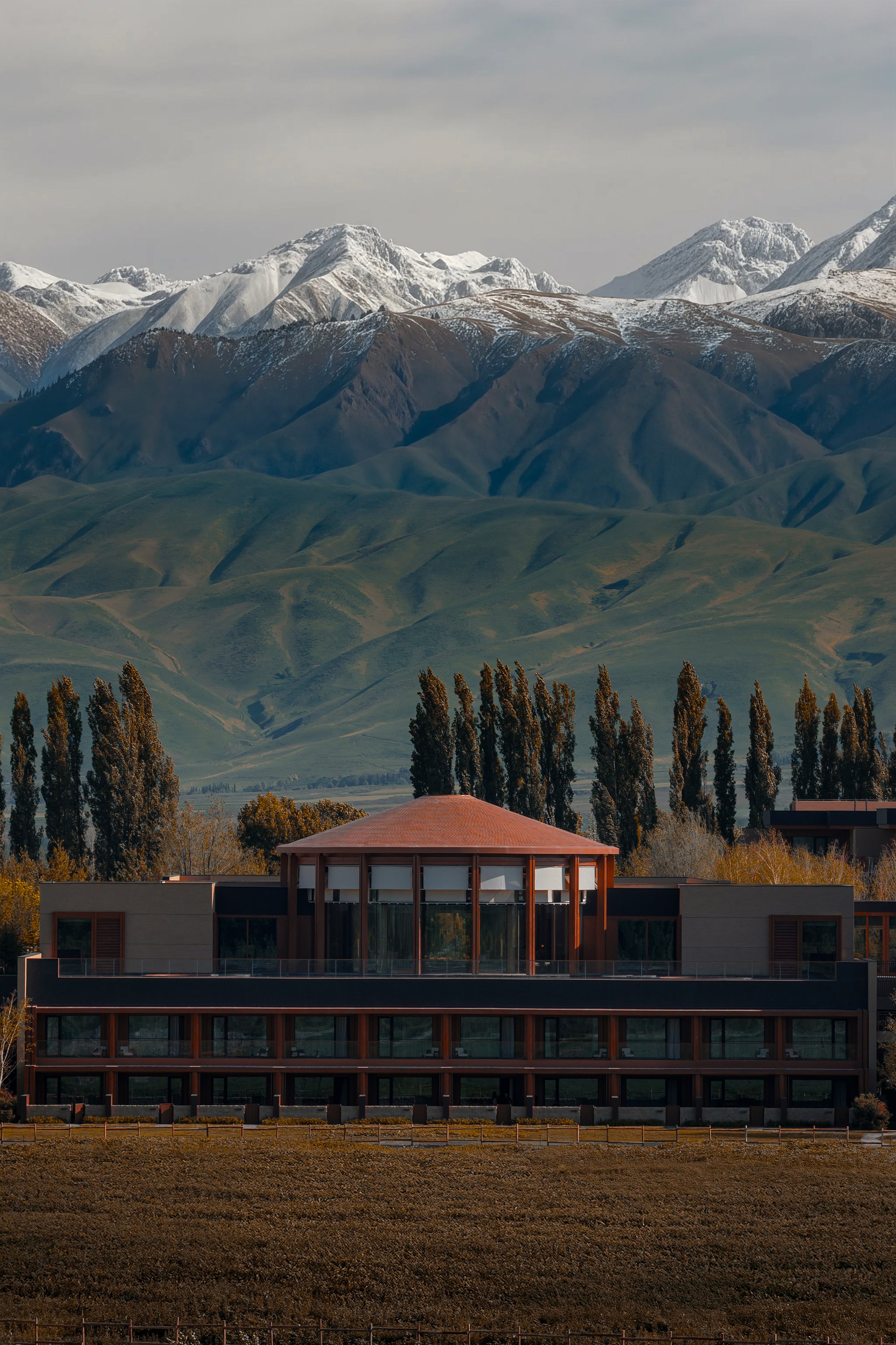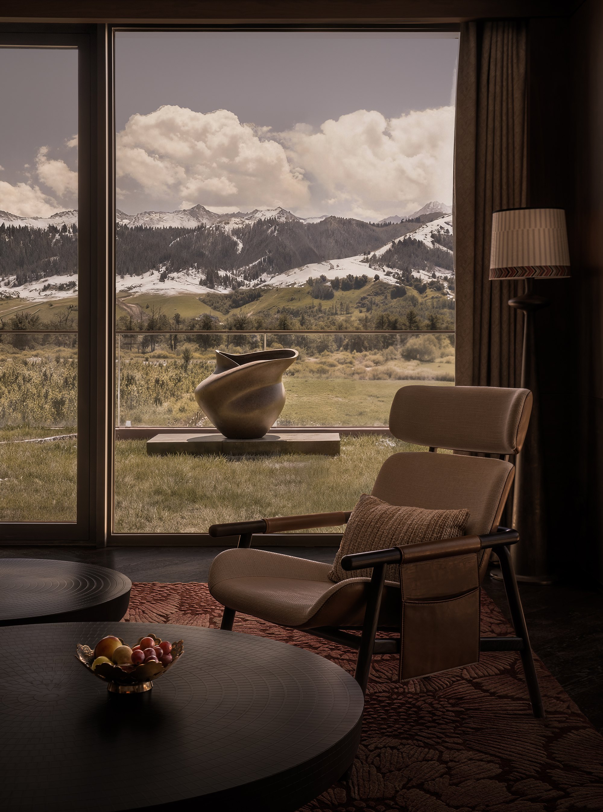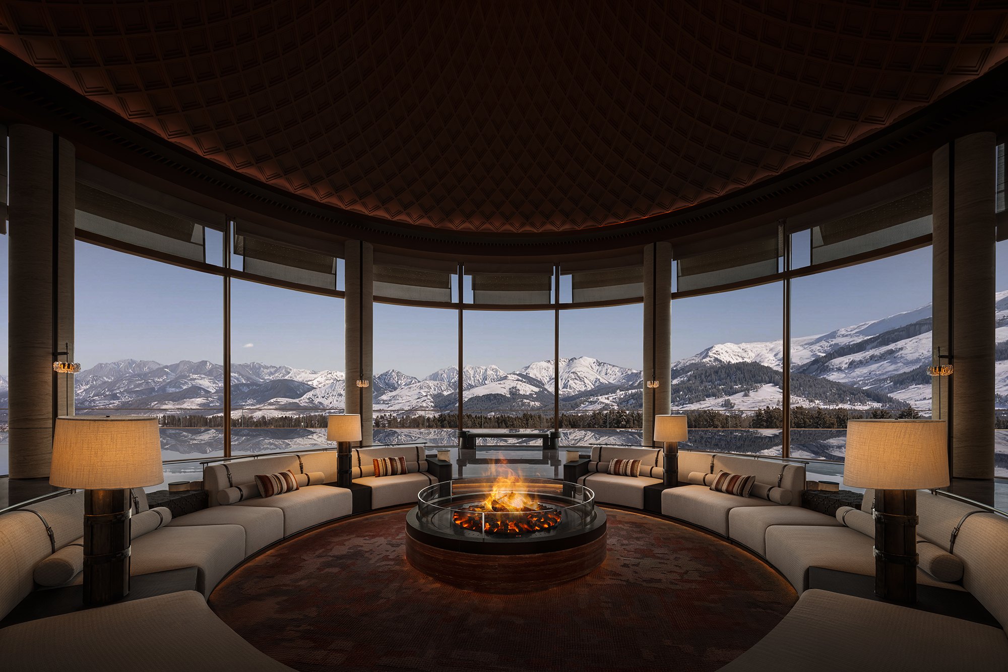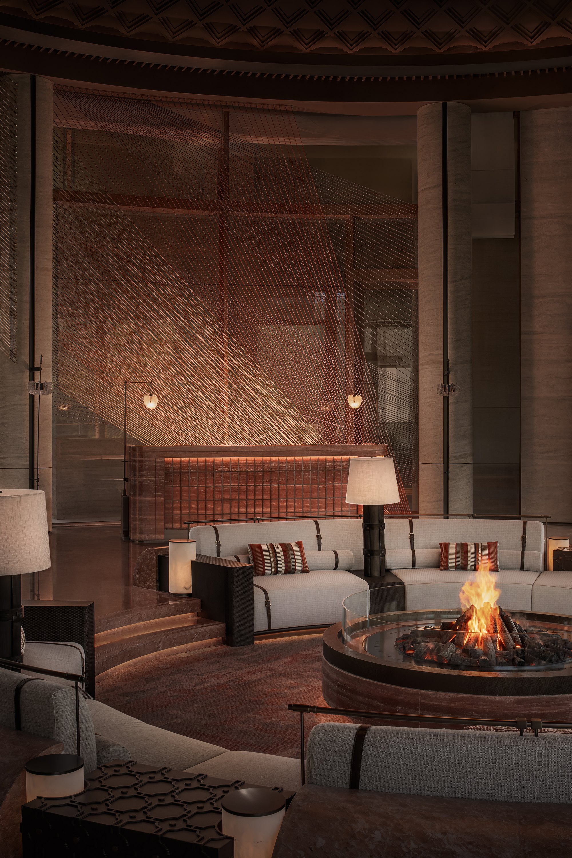 Главные для проекта образы почерпнуты из казахской культуры: это юрта и аул, поэтому как общественных зонах, так и среди гостиничных номеров (всего их 151) много круглых в плане помещений, перекрытых куполами с световым проемом-окулусом в центре; в вестибюле такое решение даже дополнено очагом посередине, как в настоящем жилище кочевника. Еще одним важным мотивом стала деревянная ромбовидная решетка – несущий каркас юрты. Материалы выбраны традиционные – камень, дерево, металл, красный кирпич.