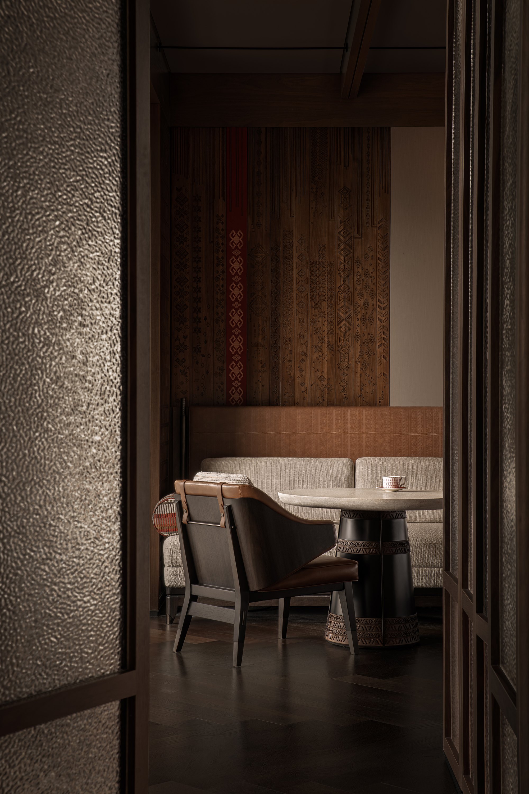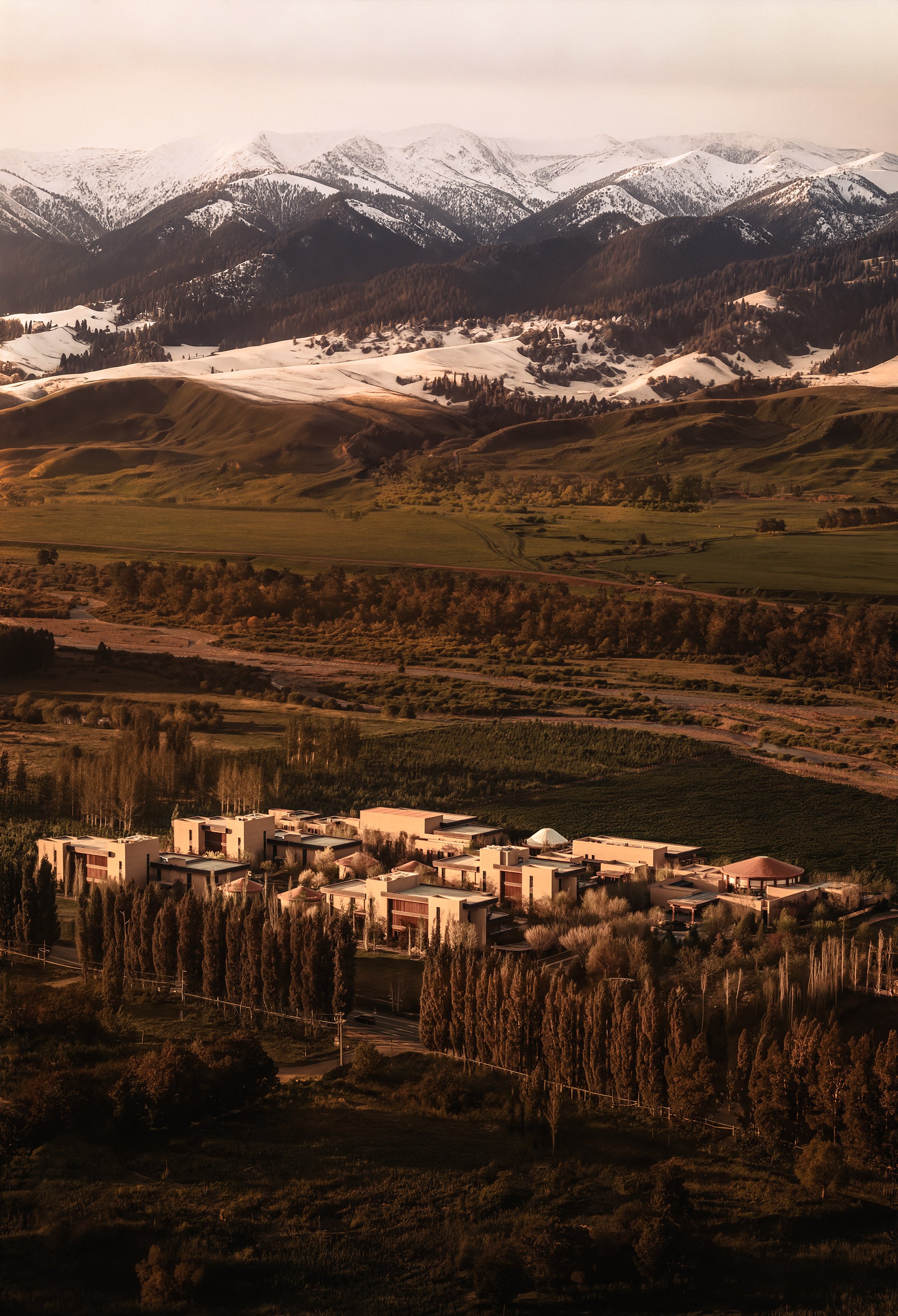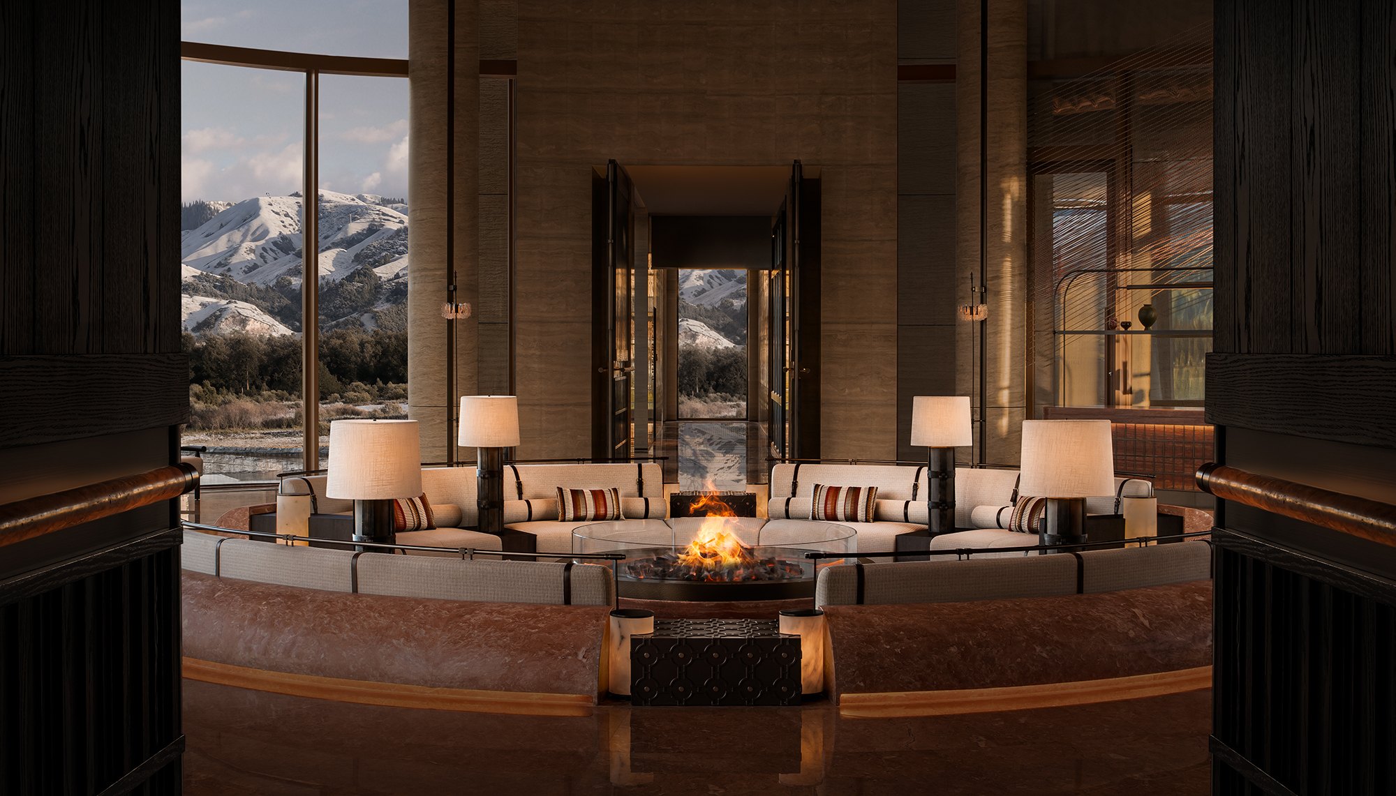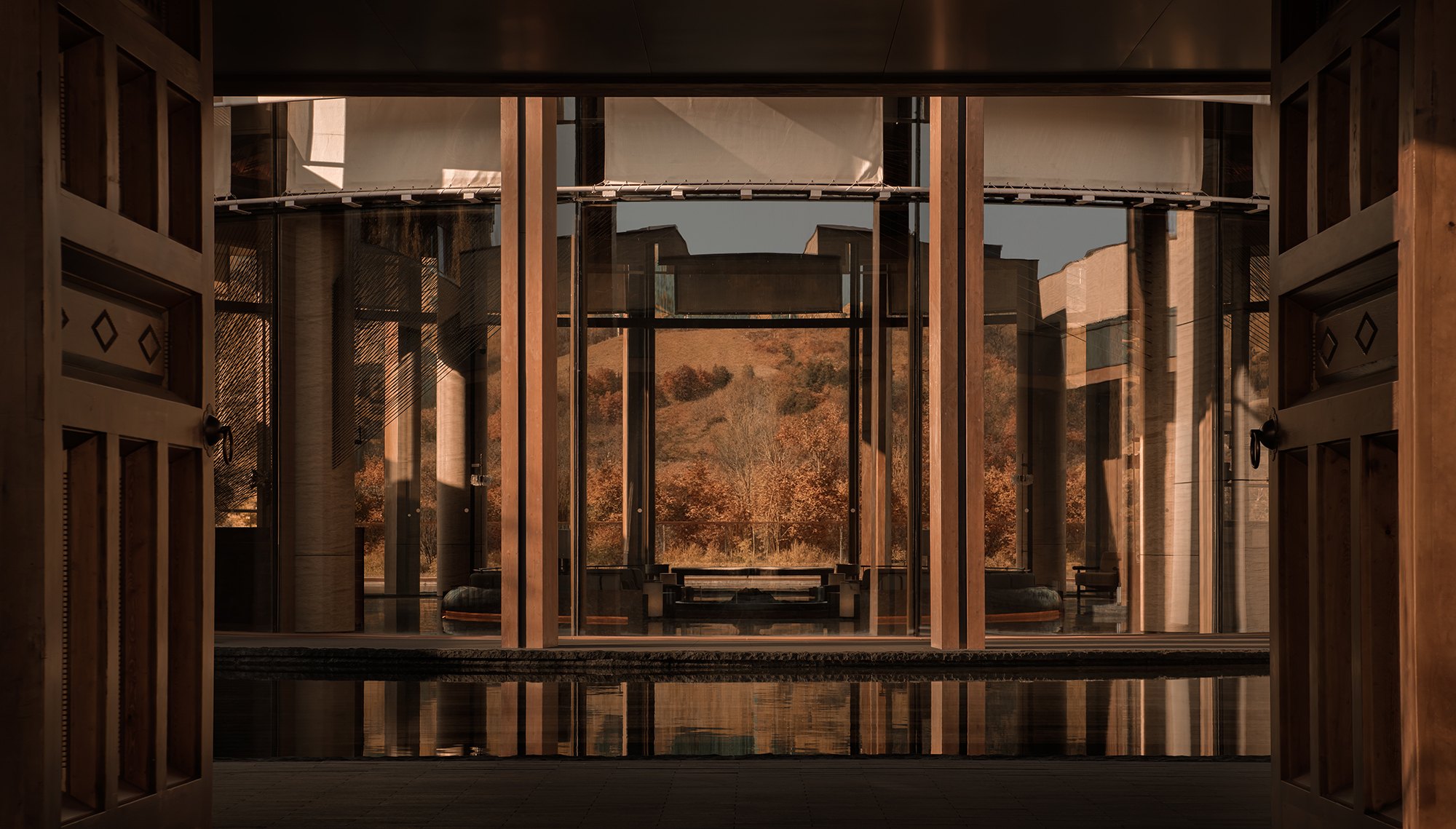 Главные для проекта образы почерпнуты из казахской культуры: это юрта и аул, поэтому как общественных зонах, так и среди гостиничных номеров (всего их 151) много круглых в плане помещений, перекрытых куполами с световым проемом-окулусом в центре; в вестибюле такое решение даже дополнено очагом посередине, как в настоящем жилище кочевника. Еще одним важным мотивом стала деревянная ромбовидная решетка – несущий каркас юрты. Материалы выбраны традиционные – камень, дерево, металл, красный кирпич.
