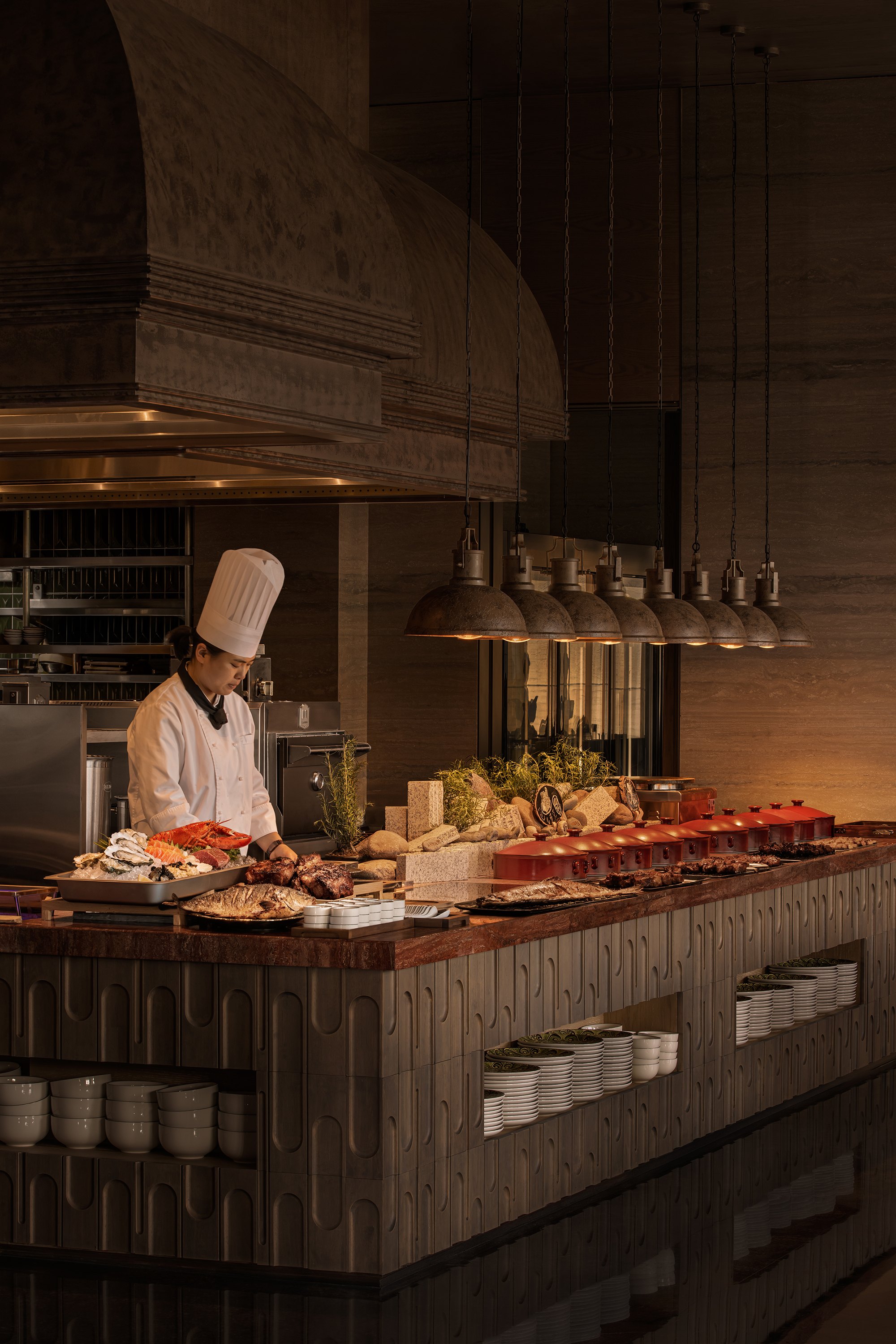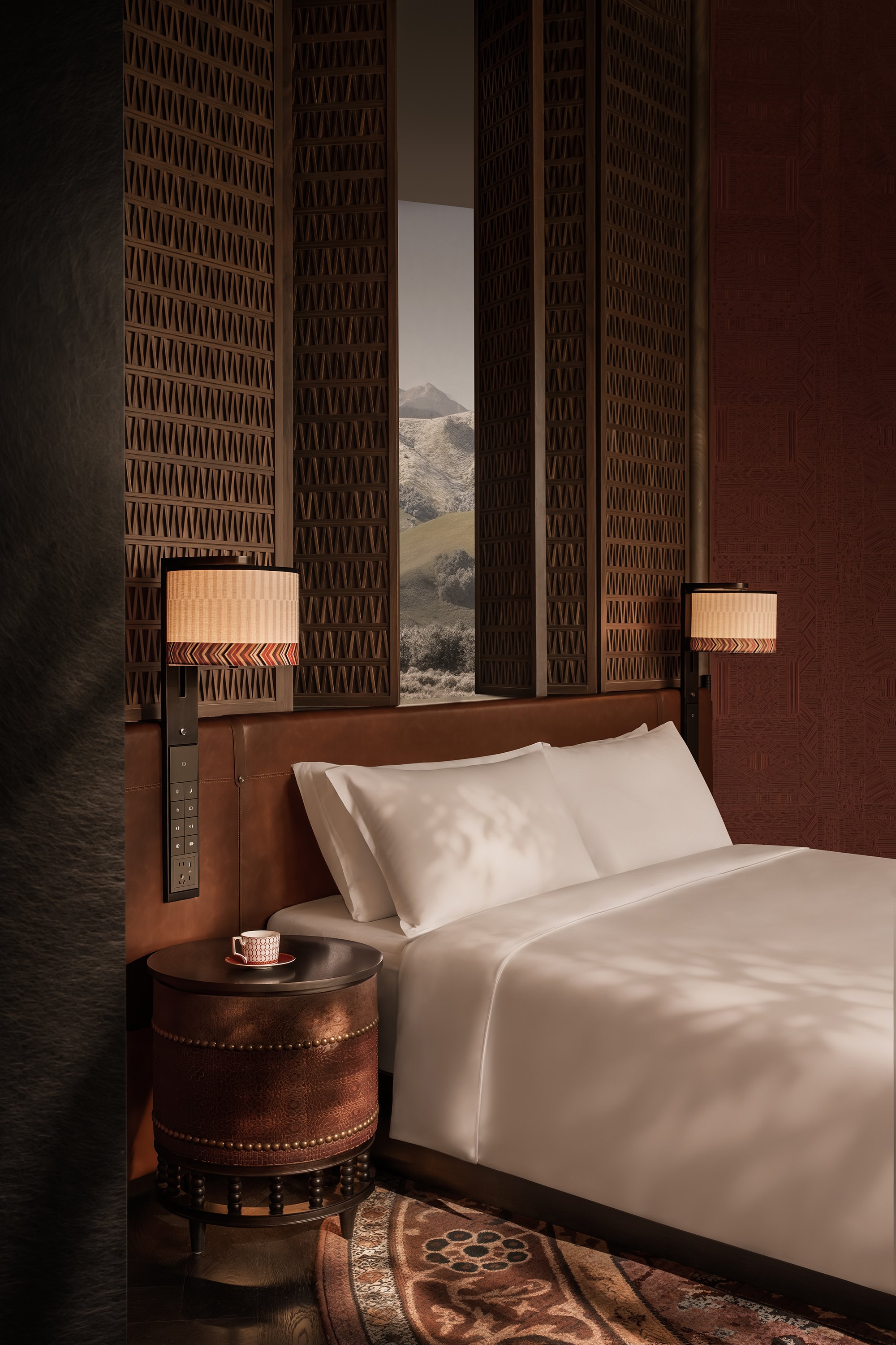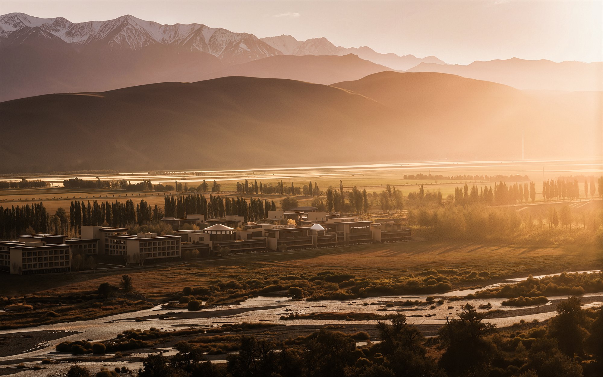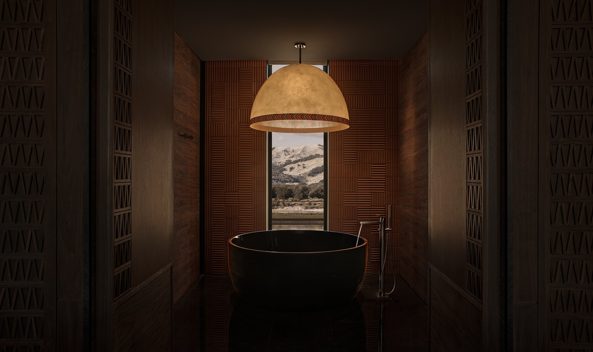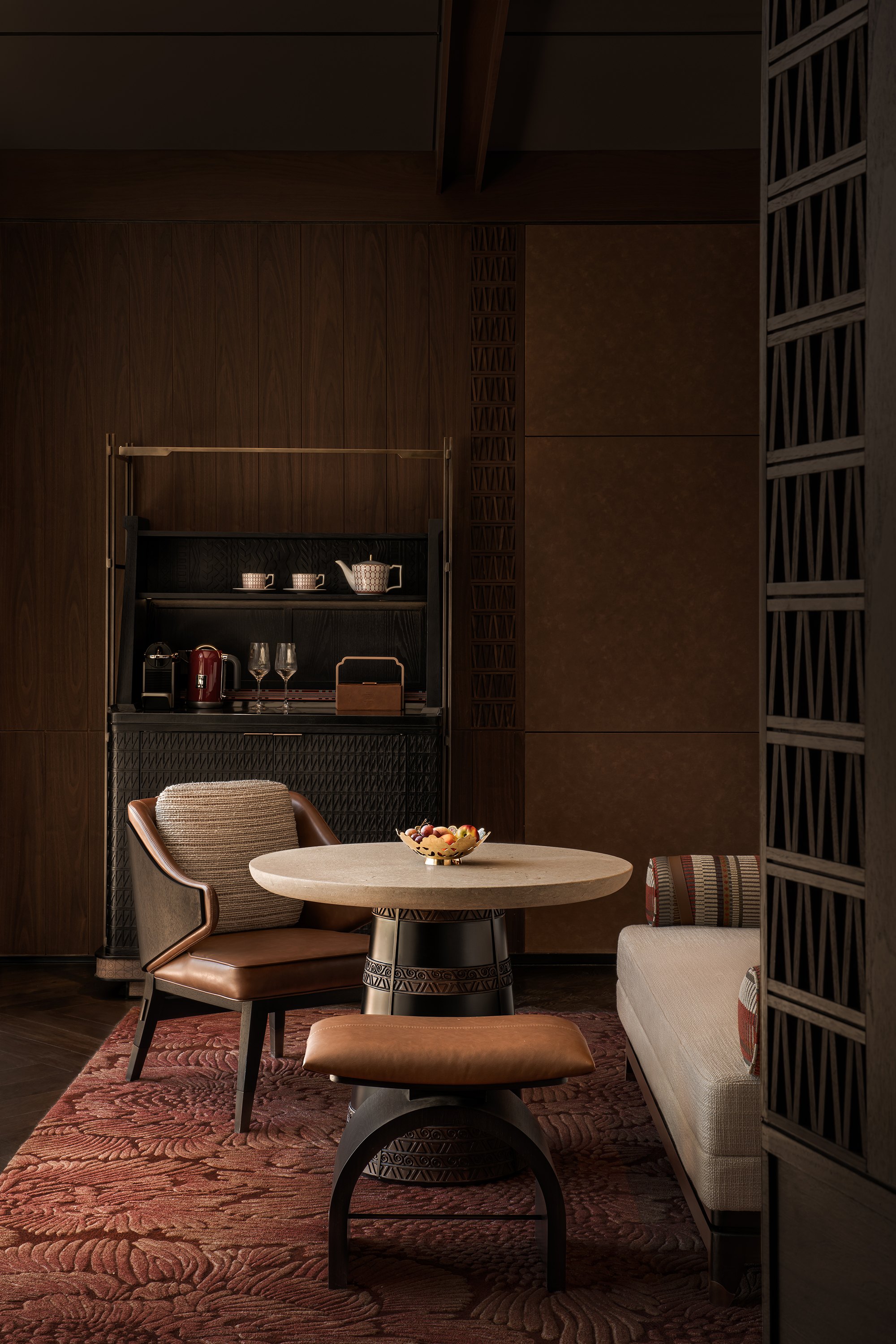 Главные для проекта образы почерпнуты из казахской культуры: это юрта и аул, поэтому как общественных зонах, так и среди гостиничных номеров (всего их 151) много круглых в плане помещений, перекрытых куполами с световым проемом-окулусом в центре; в вестибюле такое решение даже дополнено очагом посередине, как в настоящем жилище кочевника. Еще одним важным мотивом стала деревянная ромбовидная решетка – несущий каркас юрты. Материалы выбраны традиционные – камень, дерево, металл, красный кирпич.