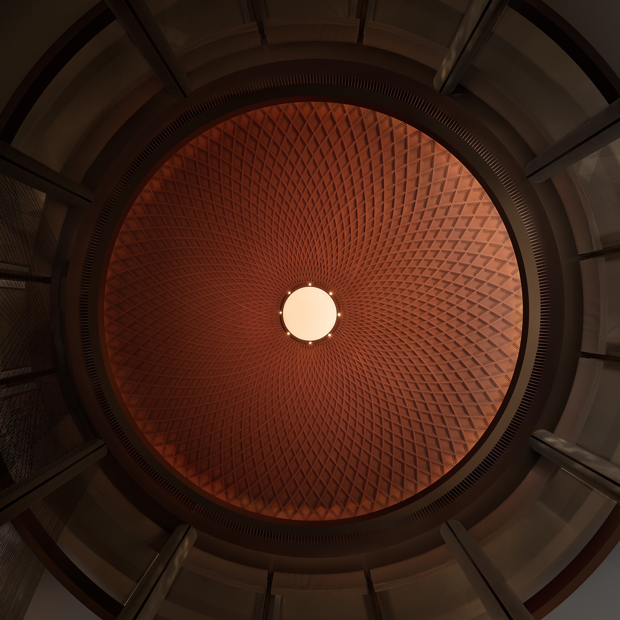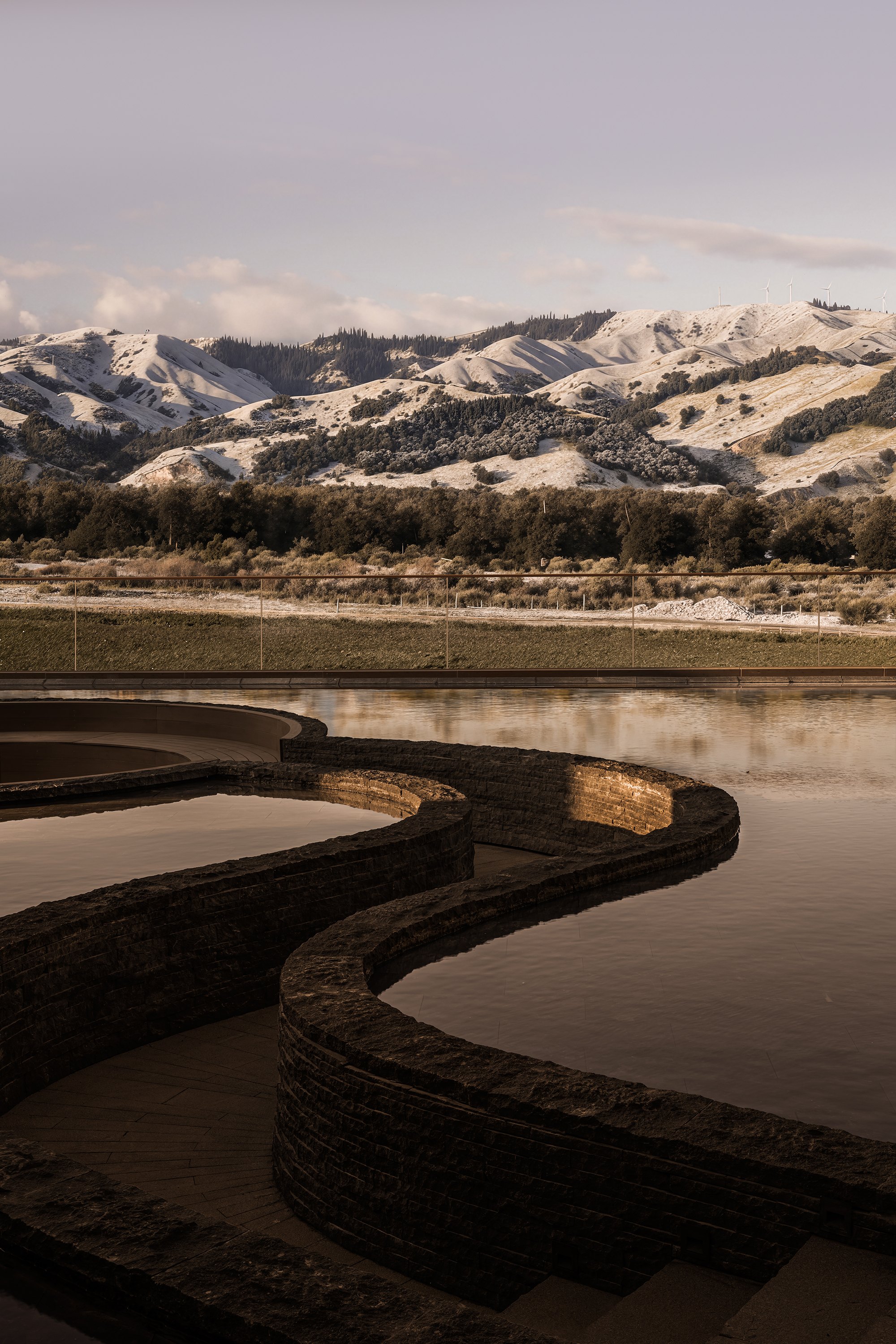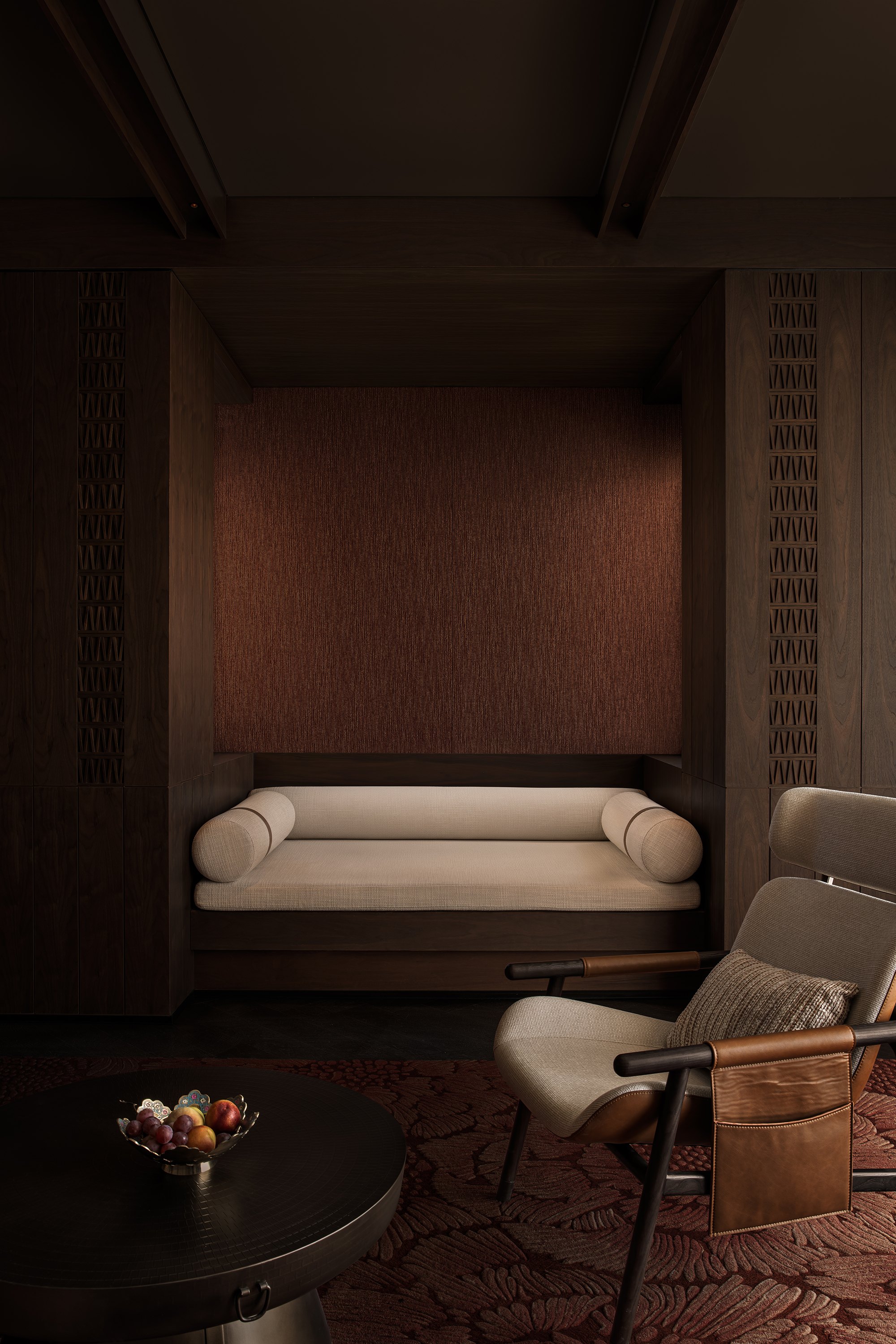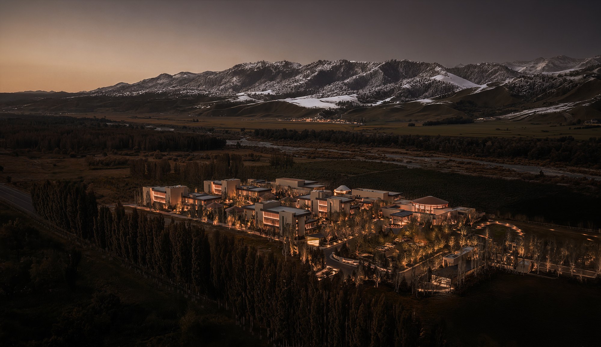Главные для проекта образы почерпнуты из казахской культуры: это юрта и аул, поэтому как общественных зонах, так и среди гостиничных номеров (всего их 151) много круглых в плане помещений, перекрытых куполами с световым проемом-окулусом в центре; в вестибюле такое решение даже дополнено очагом посередине, как в настоящем жилище кочевника. Еще одним важным мотивом стала деревянная ромбовидная решетка – несущий каркас юрты. Материалы выбраны традиционные – камень, дерево, металл, красный кирпич.