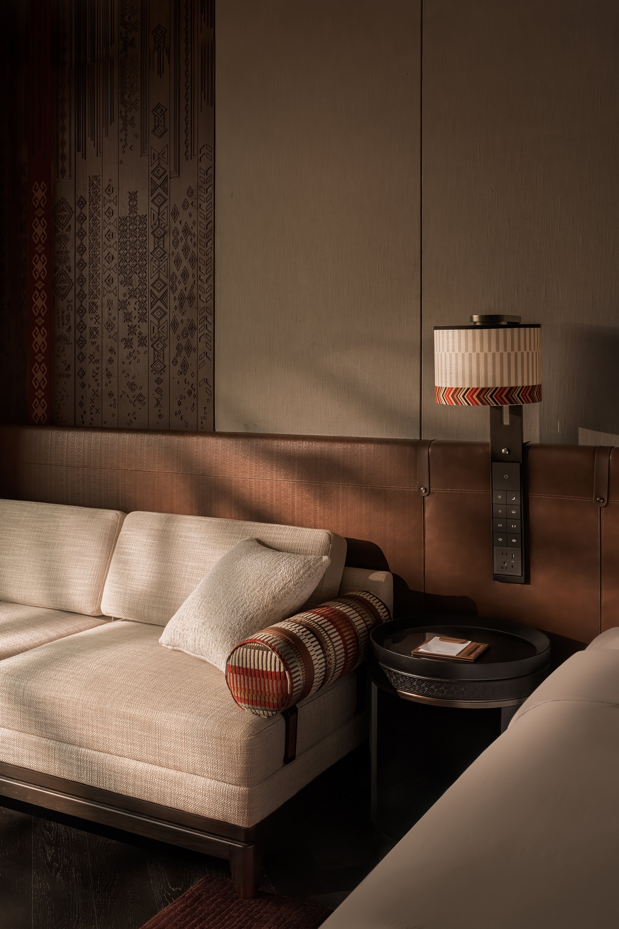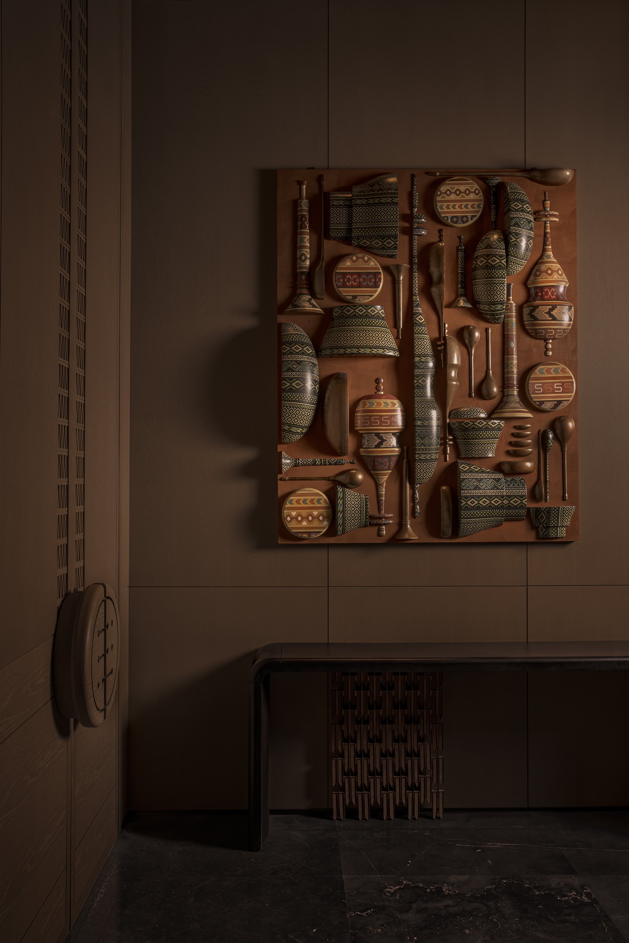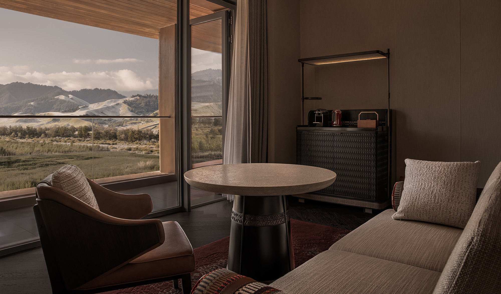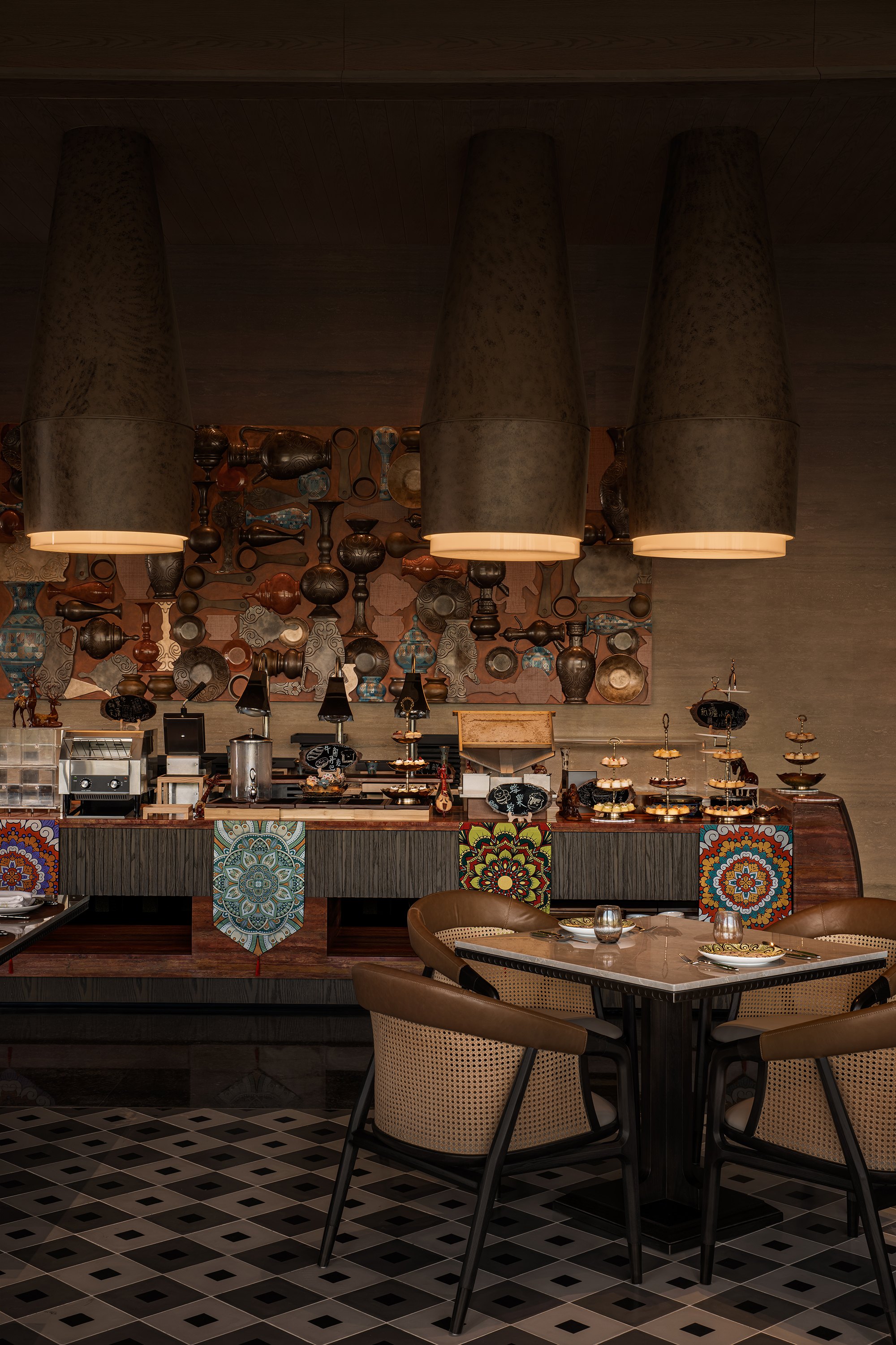 Большое внимание было уделено традиционным ремеслам: тканые и войлочные ковры и настенные украшения, декор, вдохновленный конской сбруей и подобные мотивы сочетаются с откровенно современными предметами, например, светильниками в лифтовых холлах – но и они вдохновлены местным горным первоцветом, шафраном (крокусом) алатавским.
