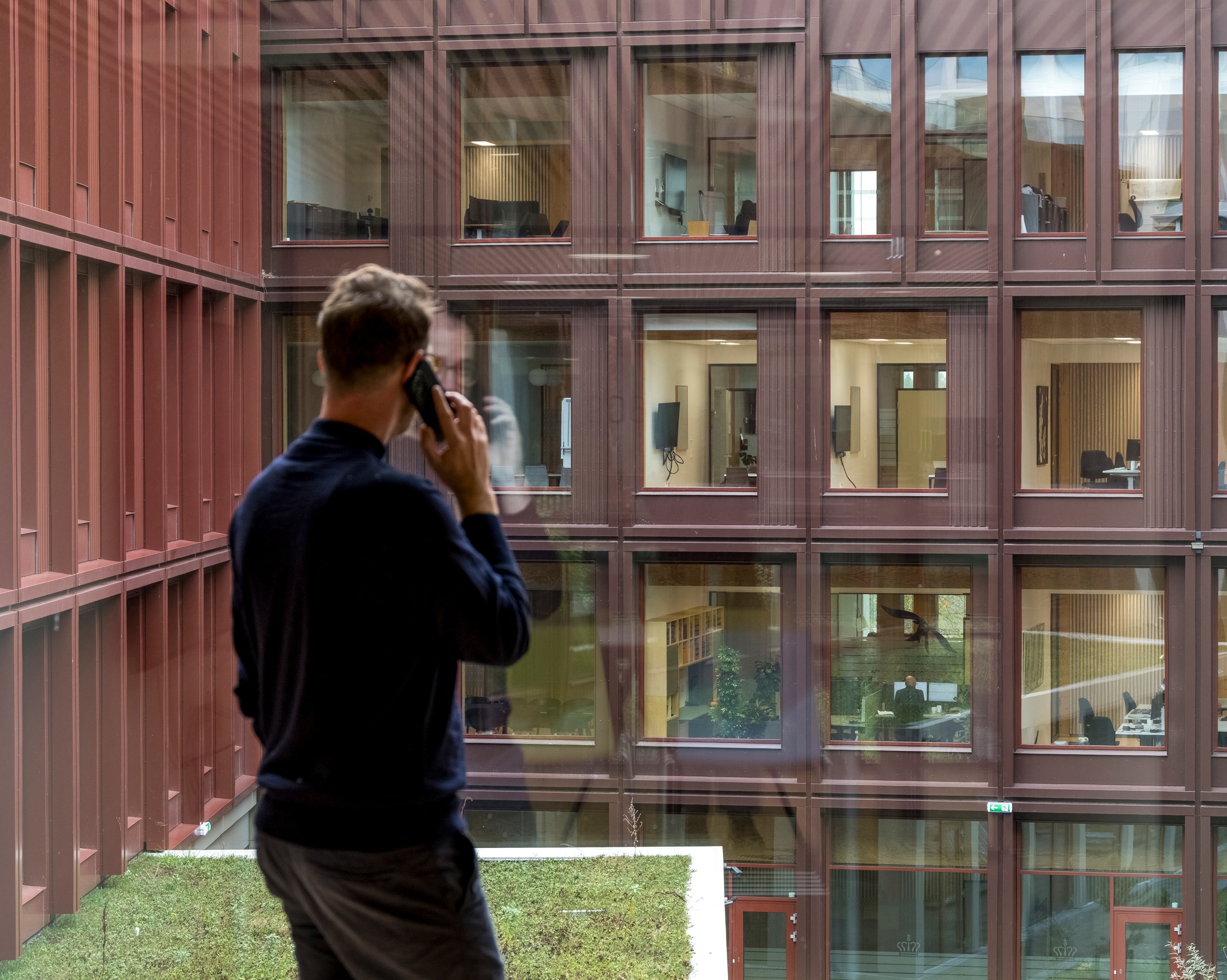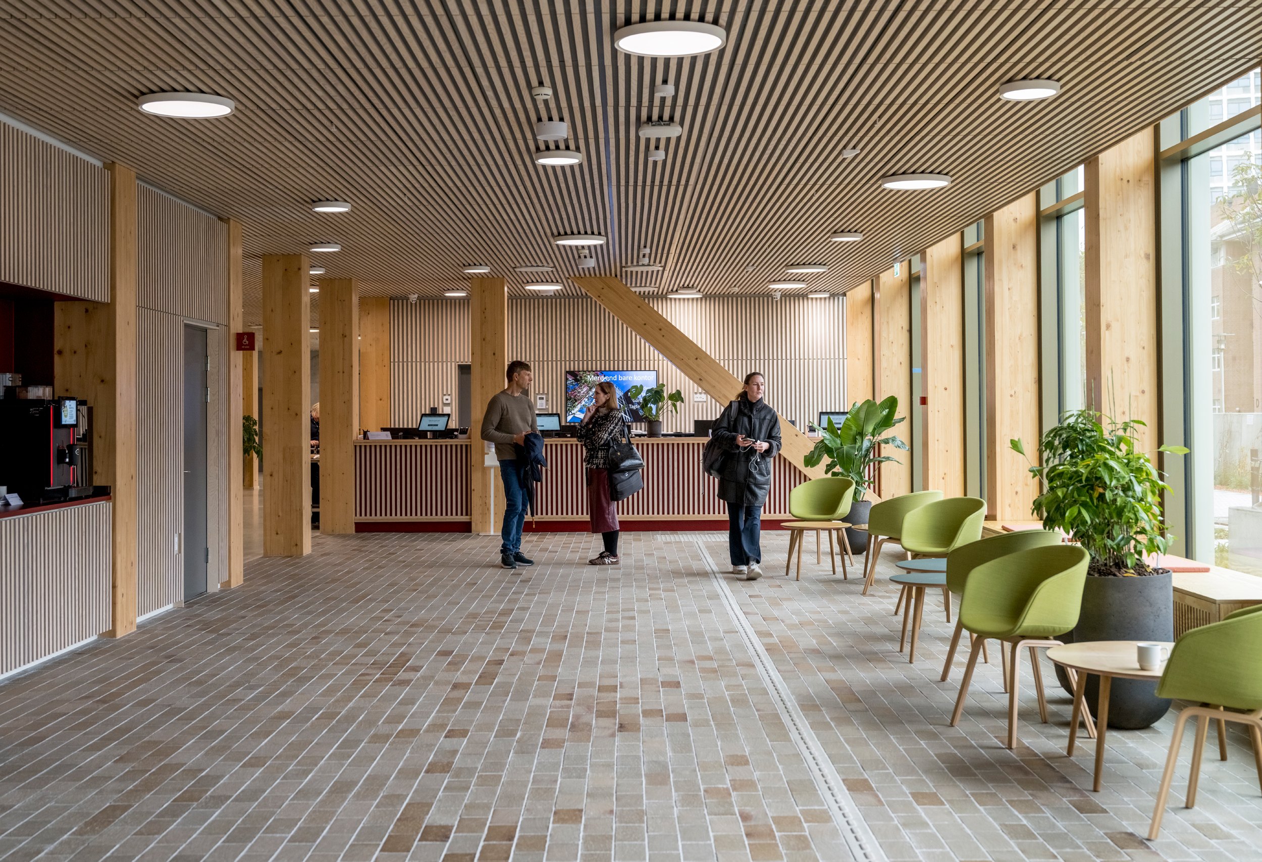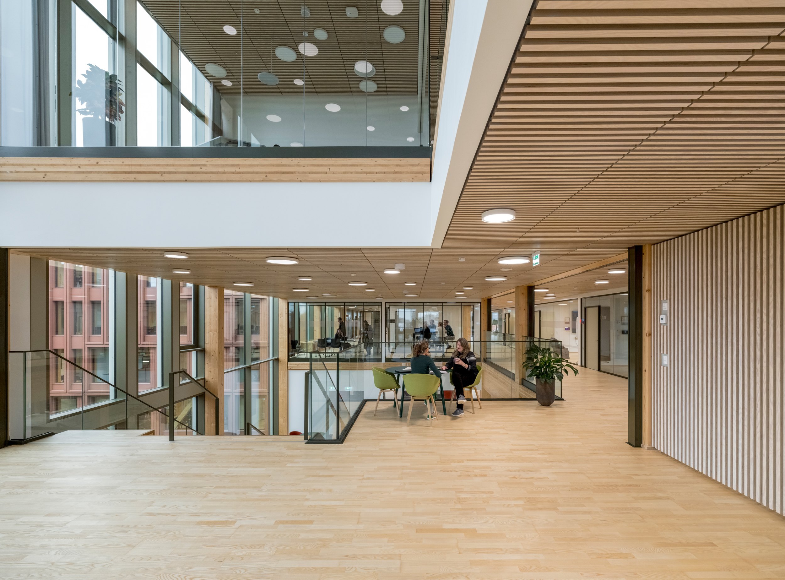 Пока же в здании с площадью наземных уровней 31 тыс. м2 разместились 1600 служащих нескольких госучреждений. Их кабинеты расположены в двух С-образных крыльях высотой от трех до шести этажей, обращенных на запад и восток, а по центру помещен 7-этажный корпус с переговорными. Первый этаж занят, помимо прочего, конференц-залом, столовой и центром приема граждан. Понижающаяся по мере удаления от центральной части высота WoodHub помогает согласовать здание с окружением, хотя среда вокруг достаточно нейтральна: это прилегающая к небольшой гавани Оденсе территория современной застройки.