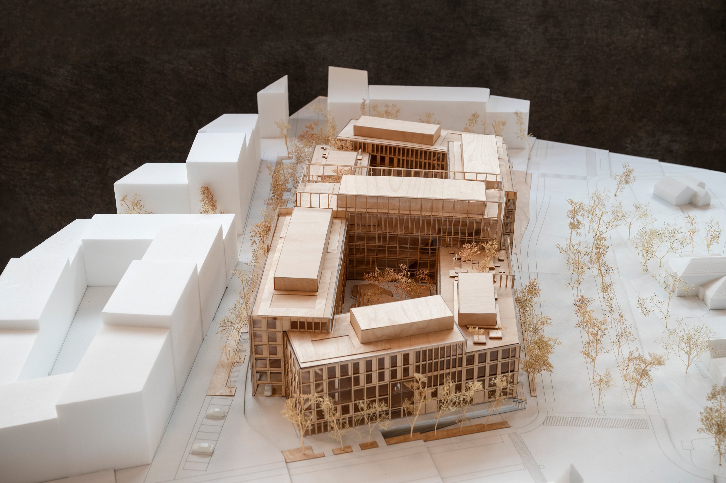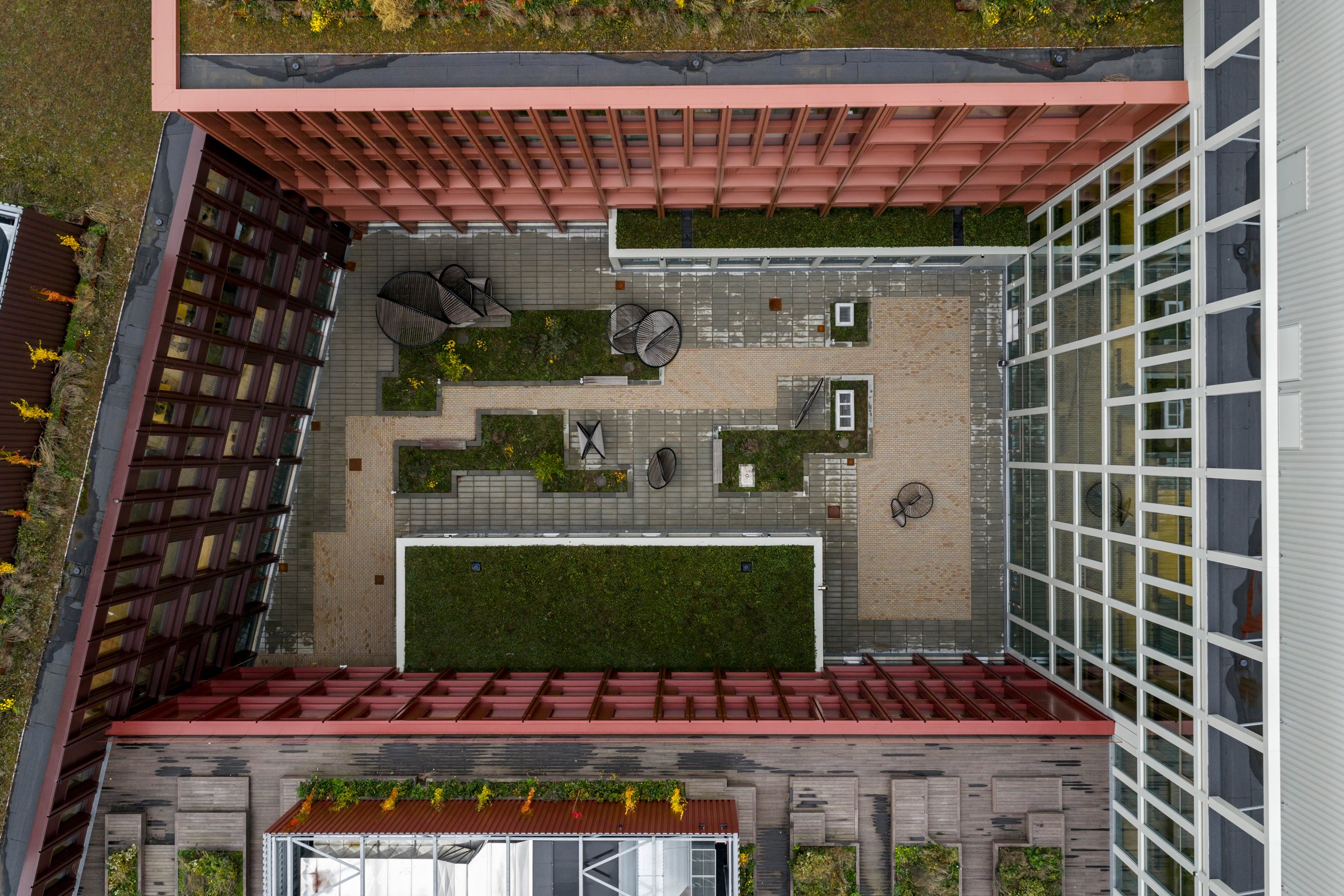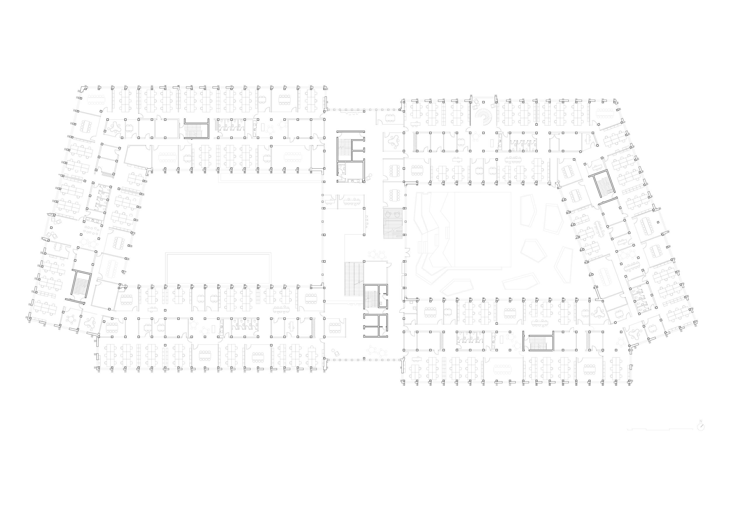 Пока же в здании с площадью наземных уровней 31 тыс. м2 разместились 1600 служащих нескольких госучреждений. Их кабинеты расположены в двух С-образных крыльях высотой от трех до шести этажей, обращенных на запад и восток, а по центру помещен 7-этажный корпус с переговорными. Первый этаж занят, помимо прочего, конференц-залом, столовой и центром приема граждан. Понижающаяся по мере удаления от центральной части высота WoodHub помогает согласовать здание с окружением, хотя среда вокруг достаточно нейтральна: это прилегающая к небольшой гавани Оденсе территория современной застройки.