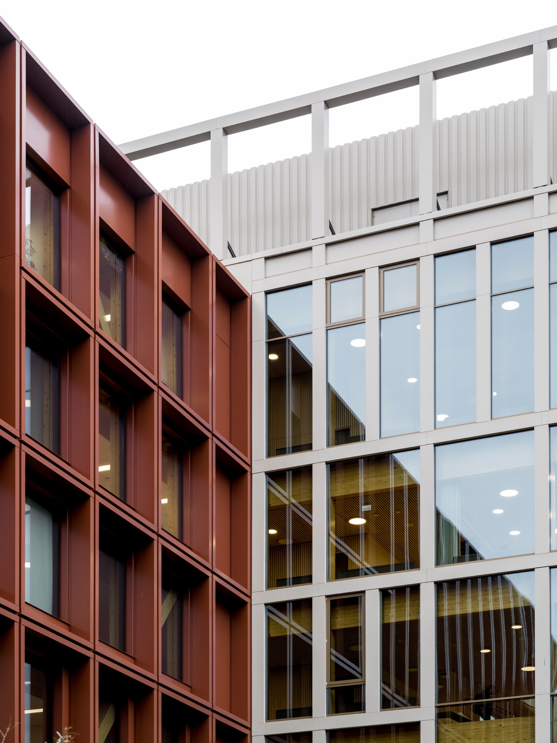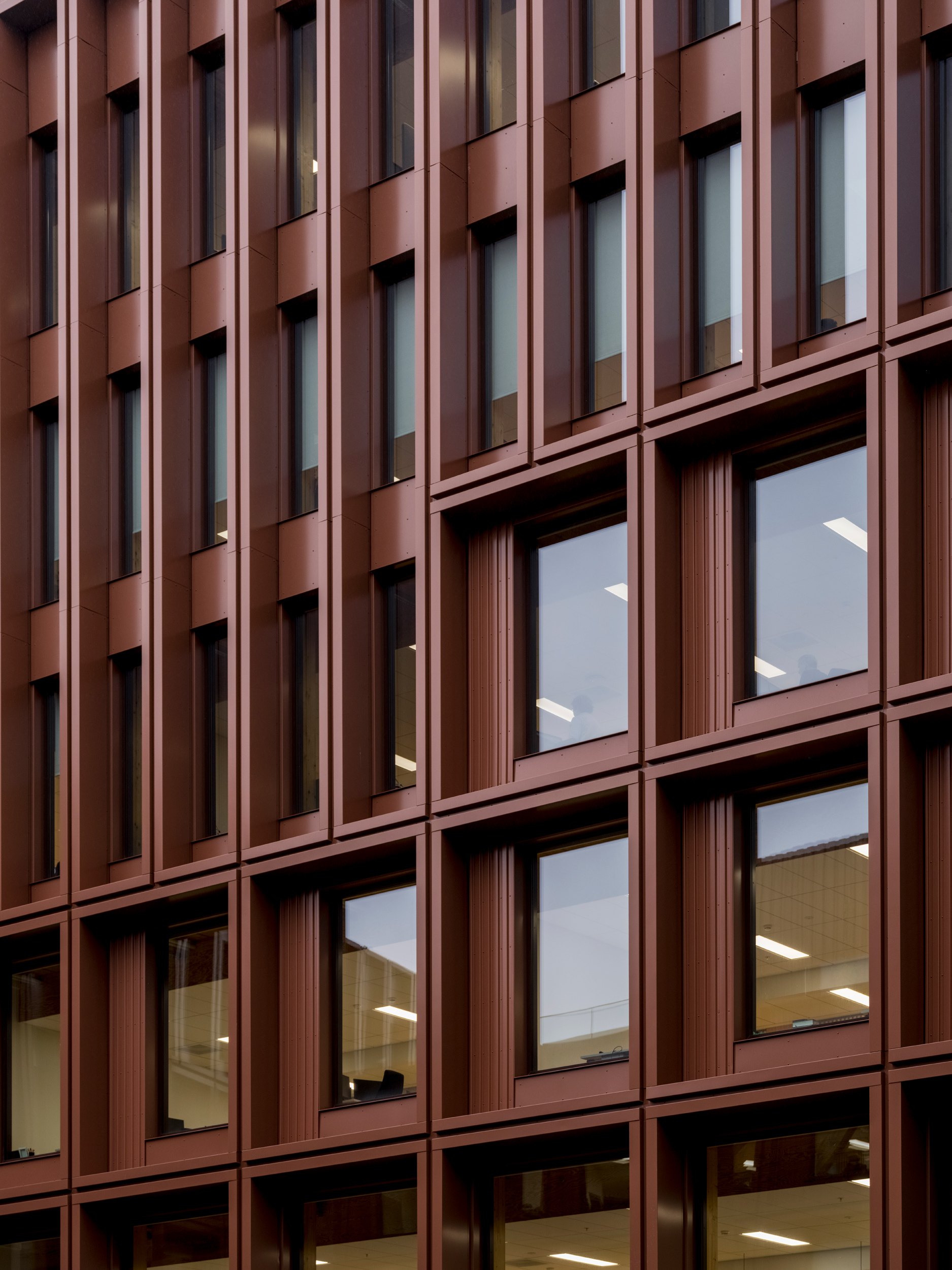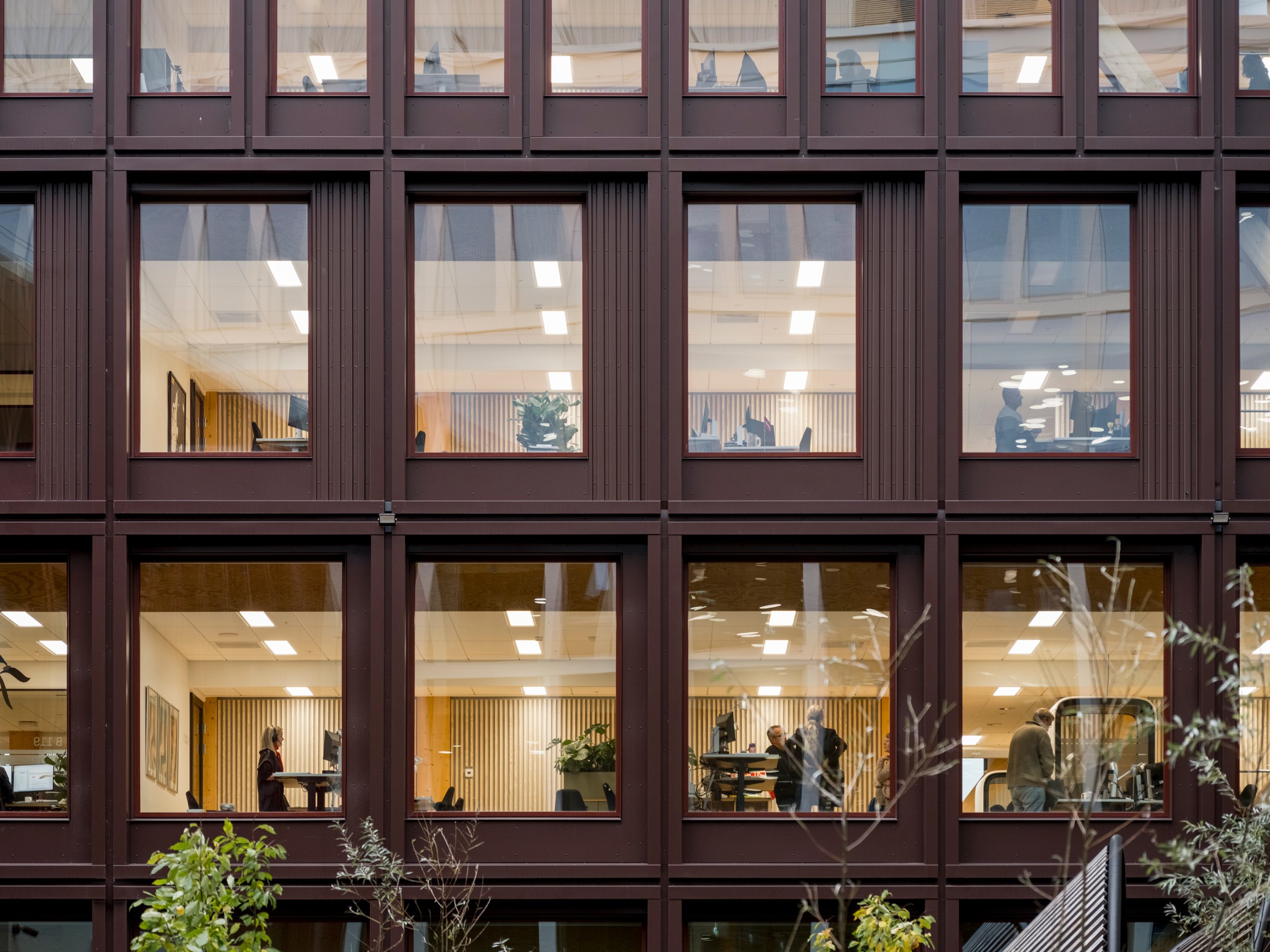 За алюминиевыми фасадами WoodHub красно-коричневых оттенков, напоминающих о характерных для Оденсе и Дании в целом кирпичных сооружениях, скрывается «начинка» из инженерного дерева: опоры из клееной древесины и перекрытия из перекрестно-клееного дерева (CLT). Архитекторы C. F. Møller обошлись без балок, что позволило сделать планировку по-настоящему гибкой и подходящей для возможных в будущем изменений функции.