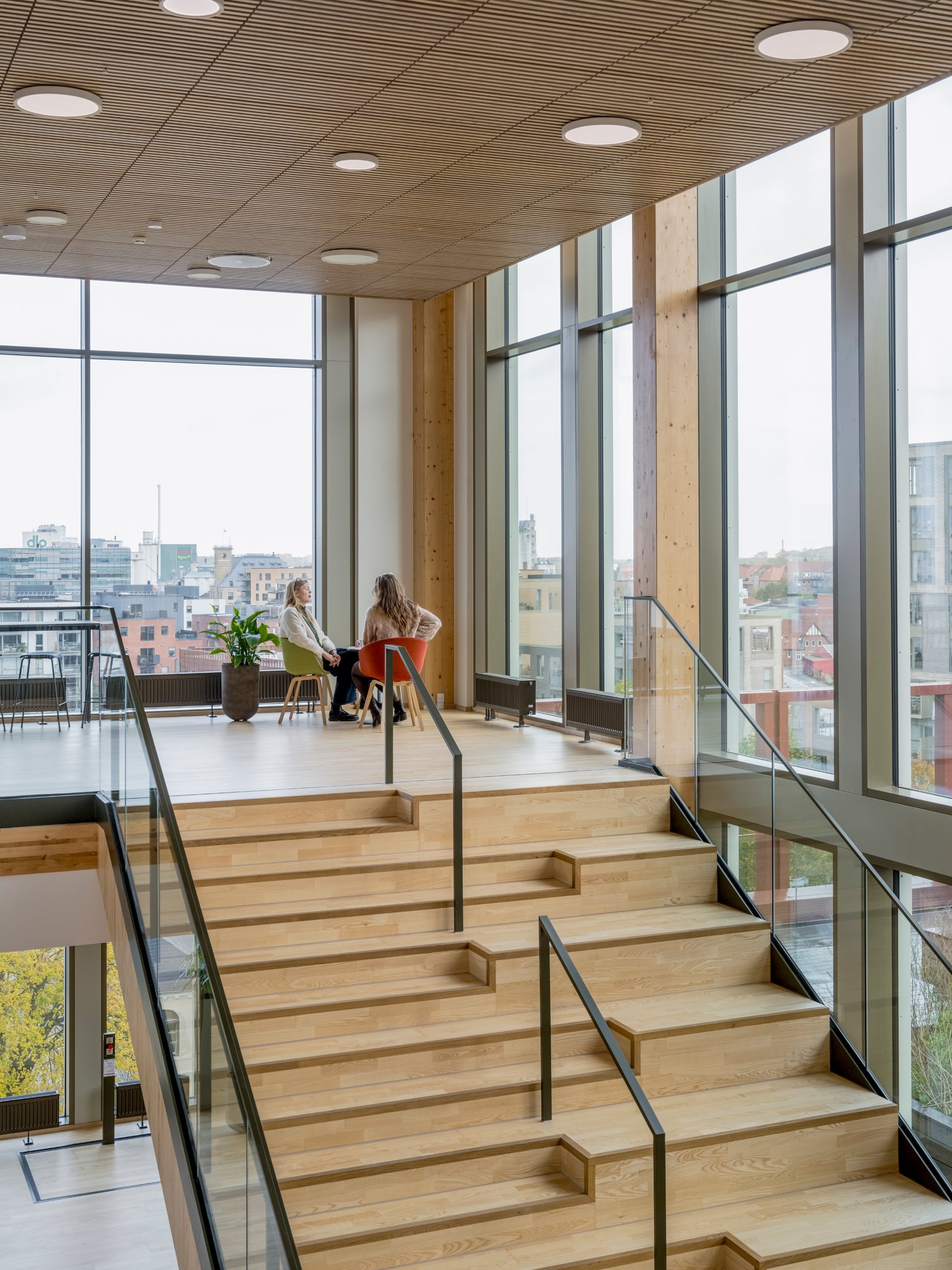 Архитекторы подчеркивают, что выведенная в интерьер деревянная конструкция создает комфортную атмосферу за счет запаха, теплоты, тактильной фактуры дерева. Использование древесины не только позволило «замуровать» захваченный деревьями при их жизнедеятельности CO2 (который иначе, при естественной гибели растений, выделяется обратно в атмосферу), но и сократить углеродный след постройки на 5400 тонн по сравнению с обычным офисным зданием (это показатель за весь прогнозируемый срок службы в 50 лет).