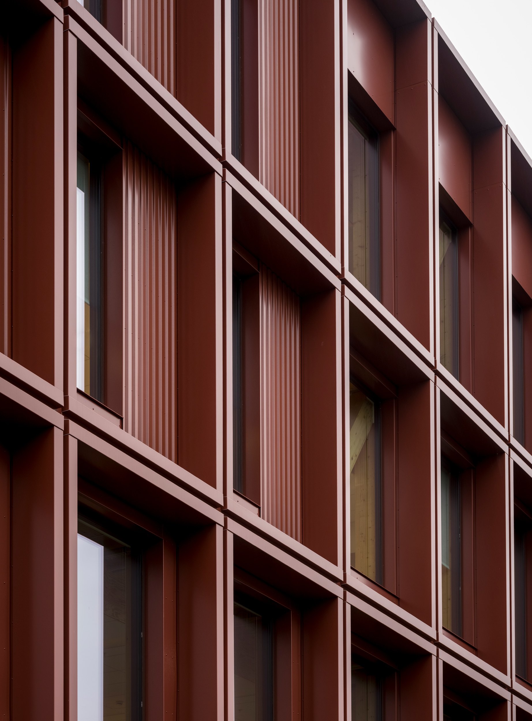 Фасады выполнены из вторично использованного алюминия, не требующего особого ухода. Ниши затеняют оконные проемы (их размер в каждом случае определен в зависимости от ориентации постройки), что позволило обойтись без механических жалюзи.