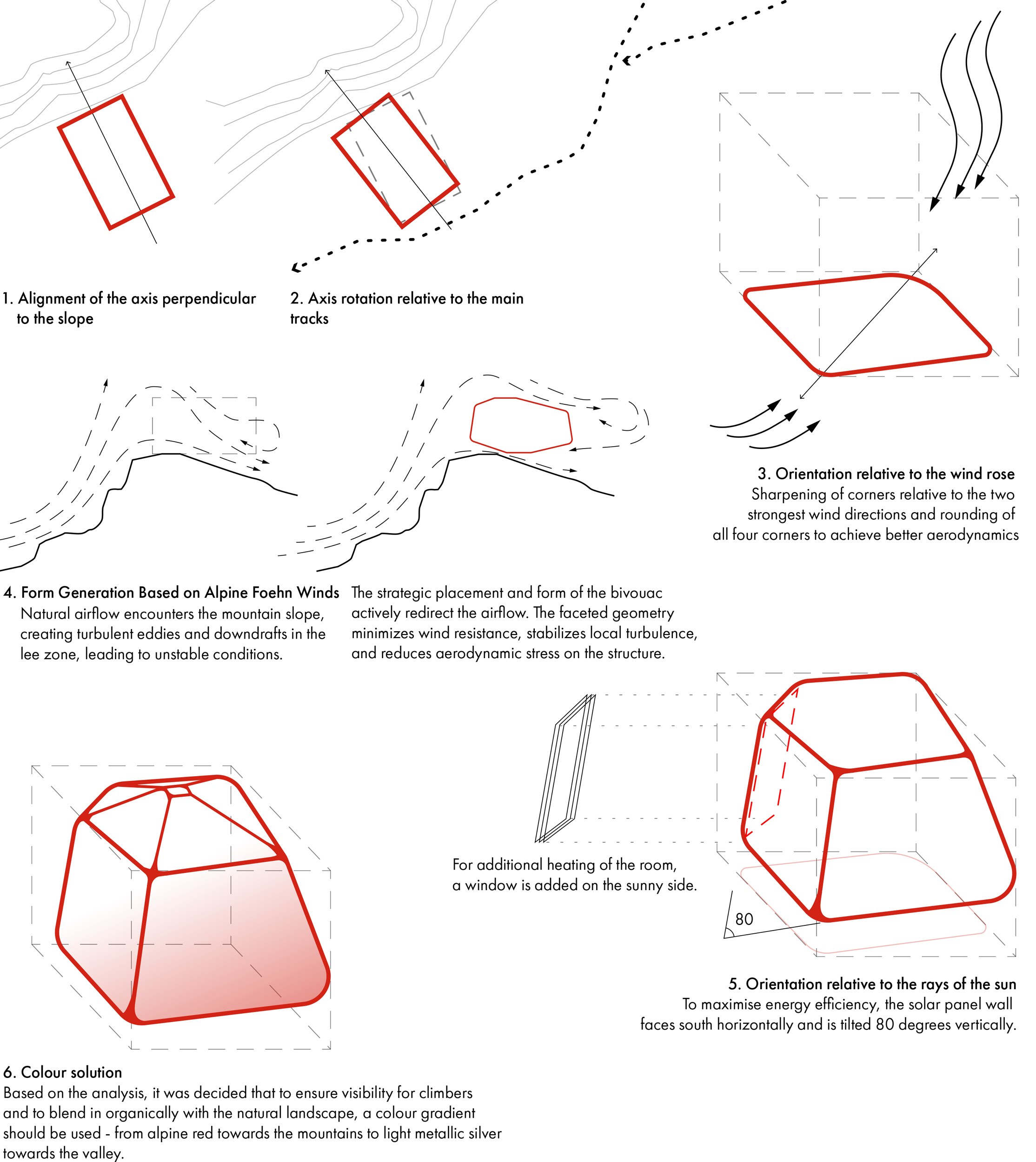 В процессе работы фокус архитектора сместился от формального решения к широкому исследованию. Проектирование началось с комплексного анализа природного контекста: розы ветров, направлений фёновых ветров, лавинной и камнепадной опасности, сезонного накопления снега, а также маршрутов доступа и эвакуации. Геоморфологический анализ с использованием ГИС позволил определить оптимальное положение и ориентацию бивуака.
