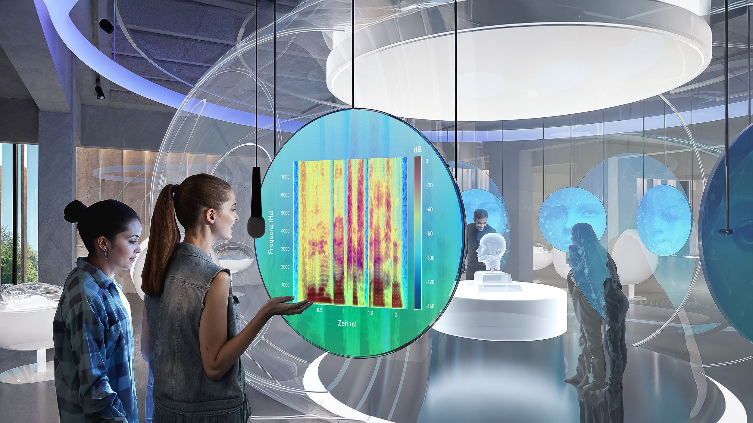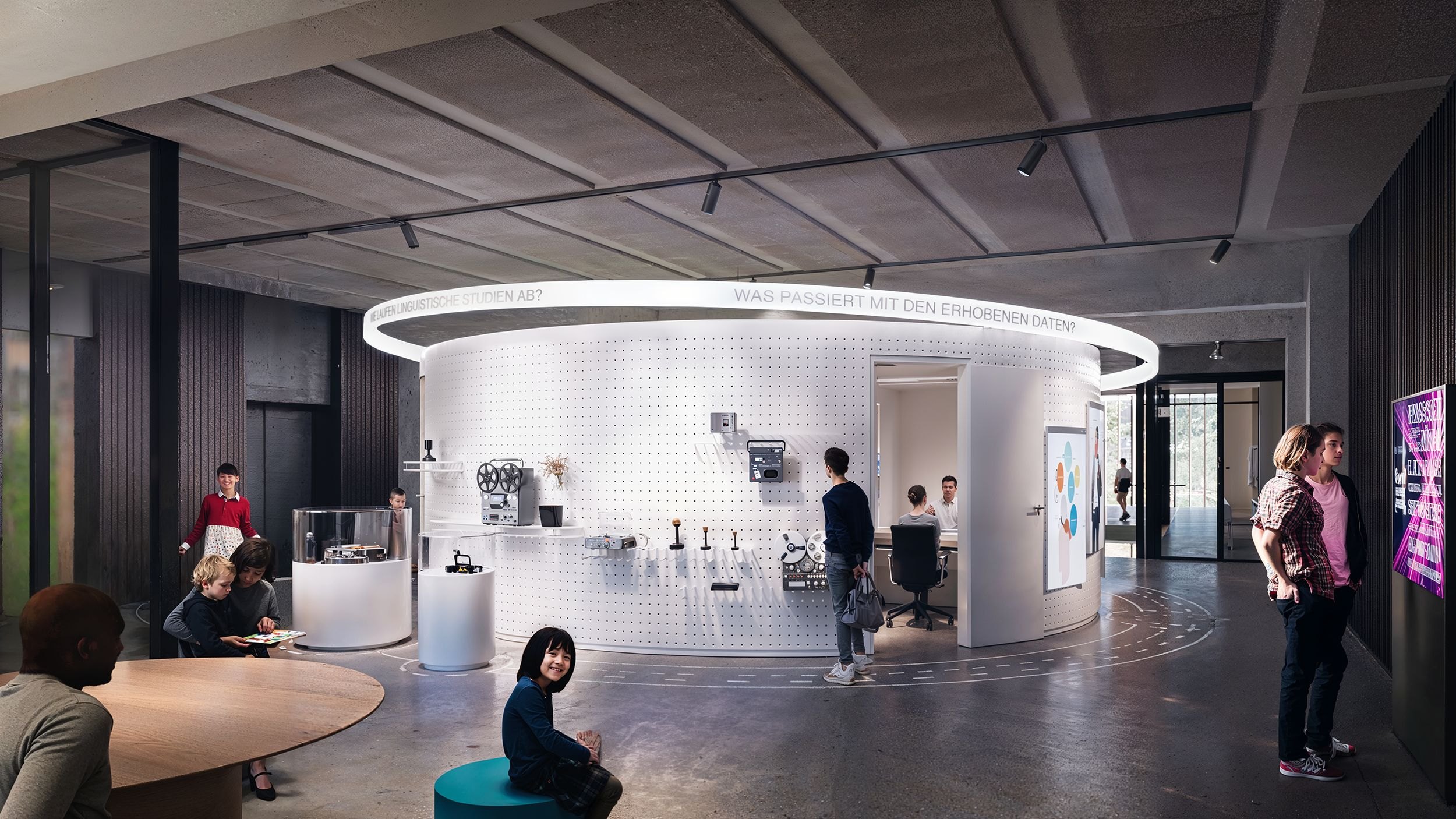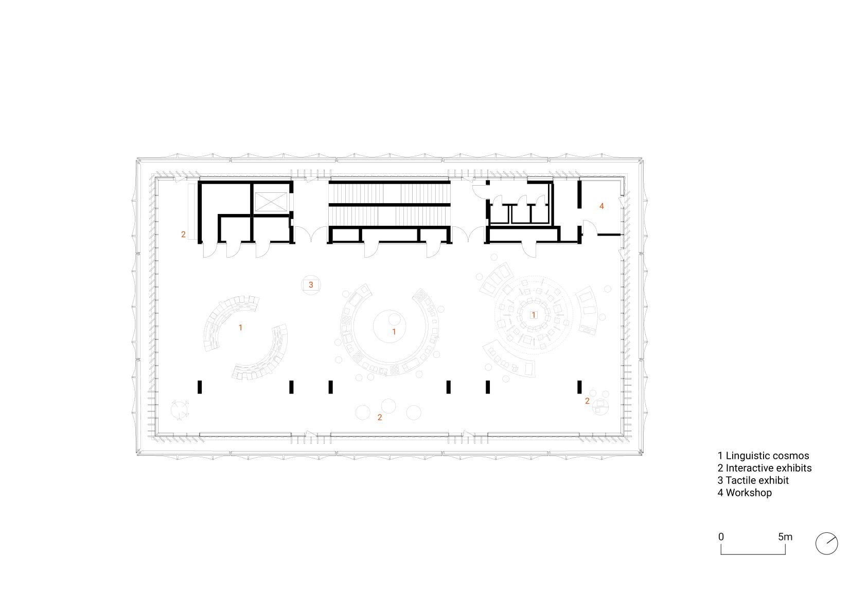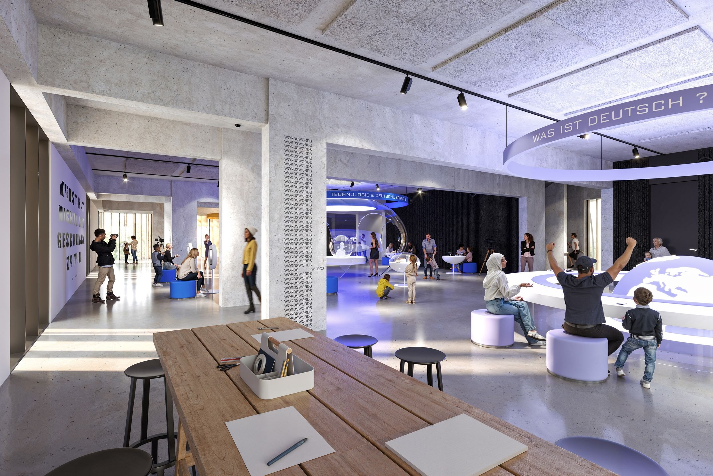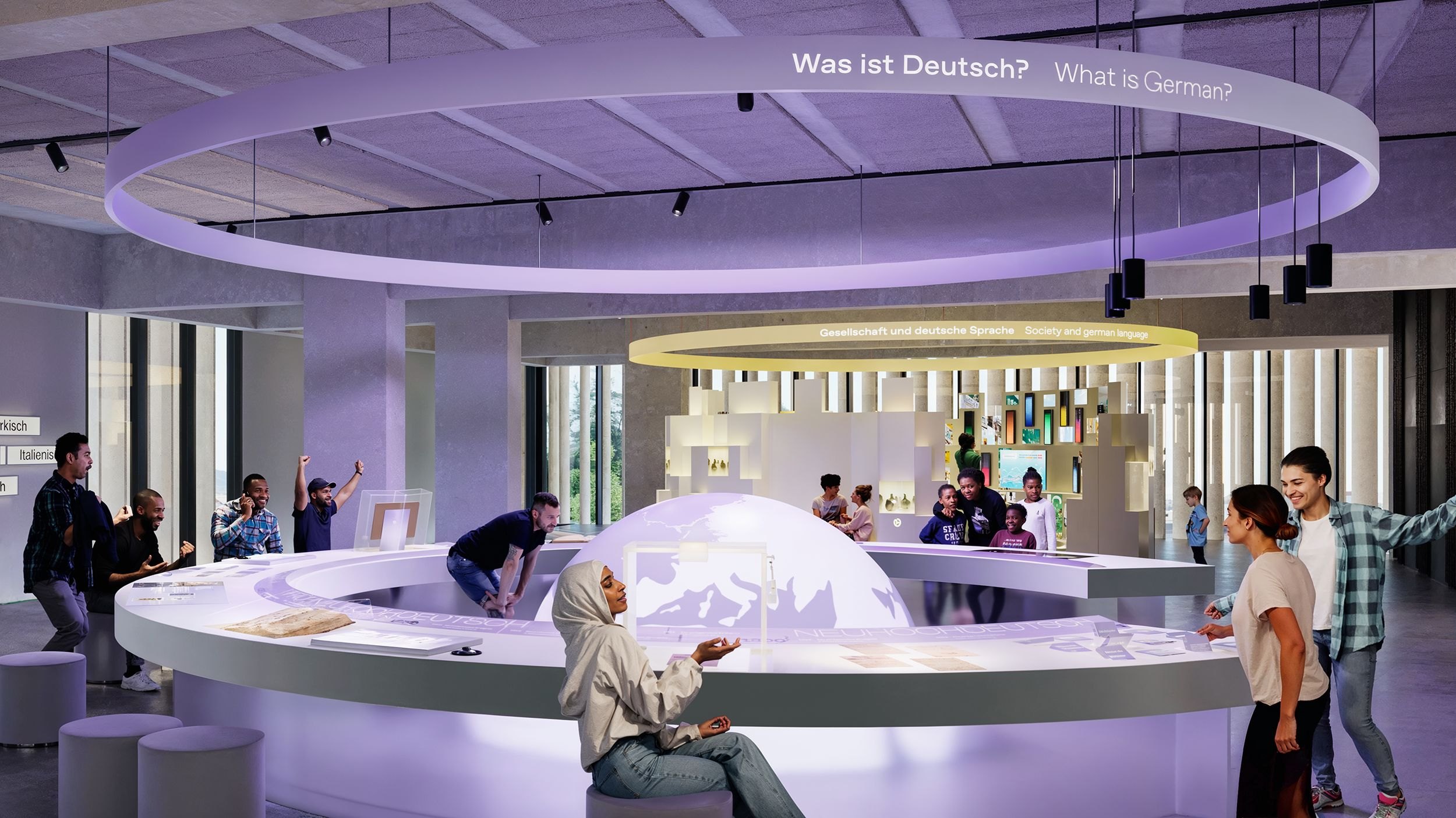 Выше запланированы три этажа постоянной экспозиции, которой займутся известные специалисты по выставочному дизайну Atelier Brückner. Посетители будут подниматься на лифте на четвертый этаж, а затем спускаться вниз, осматривая экспонаты. Бетонную конструкцию здания планируется открыть в интерьер: она разграничит зоны экспозиции, обозначенные как «языковые миры». Темами станут разнообразие немецкого, его трансформации и взаимоотношения с другими языками, лингвистические технологии, социальные аспекты его существования.