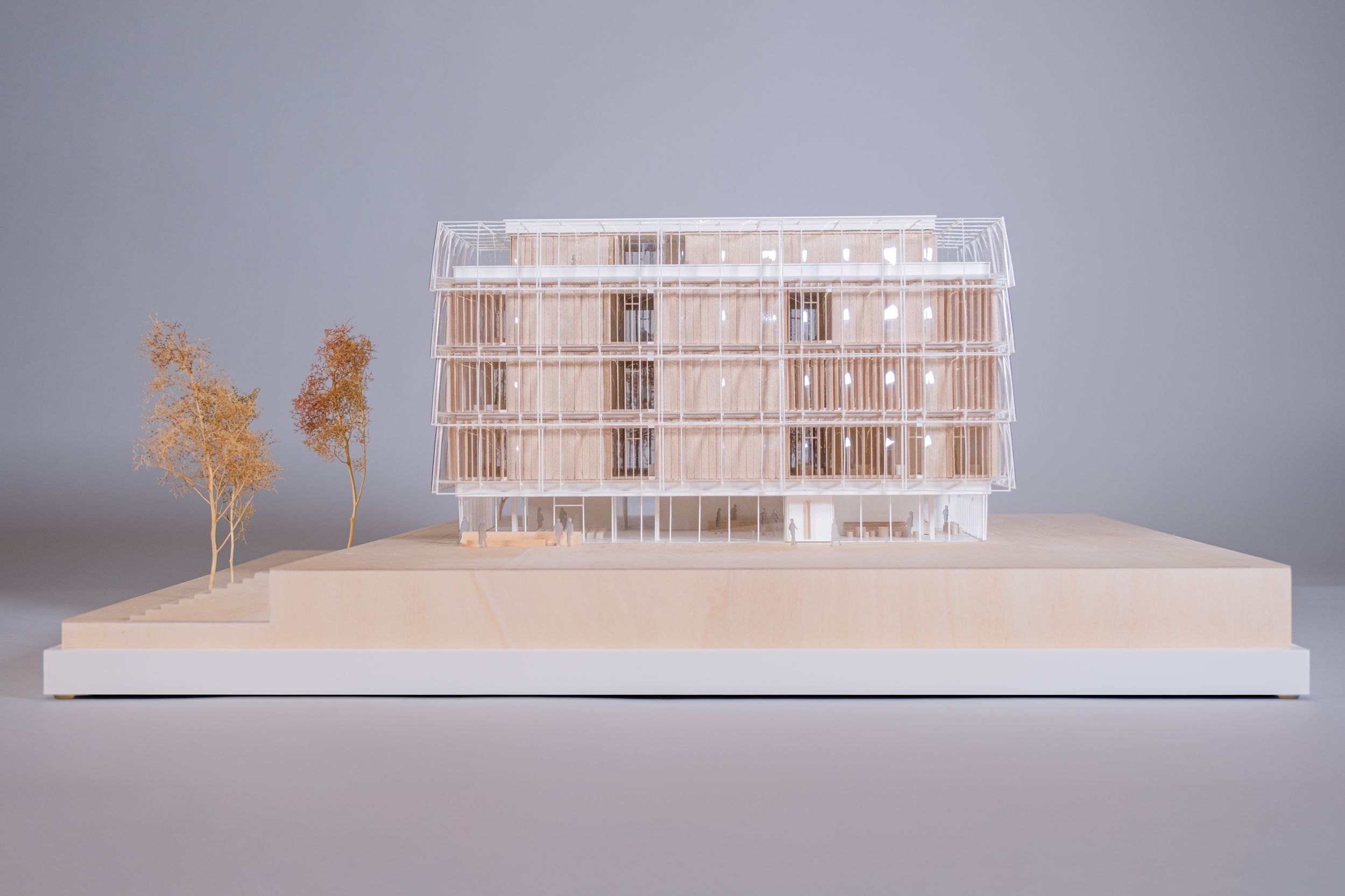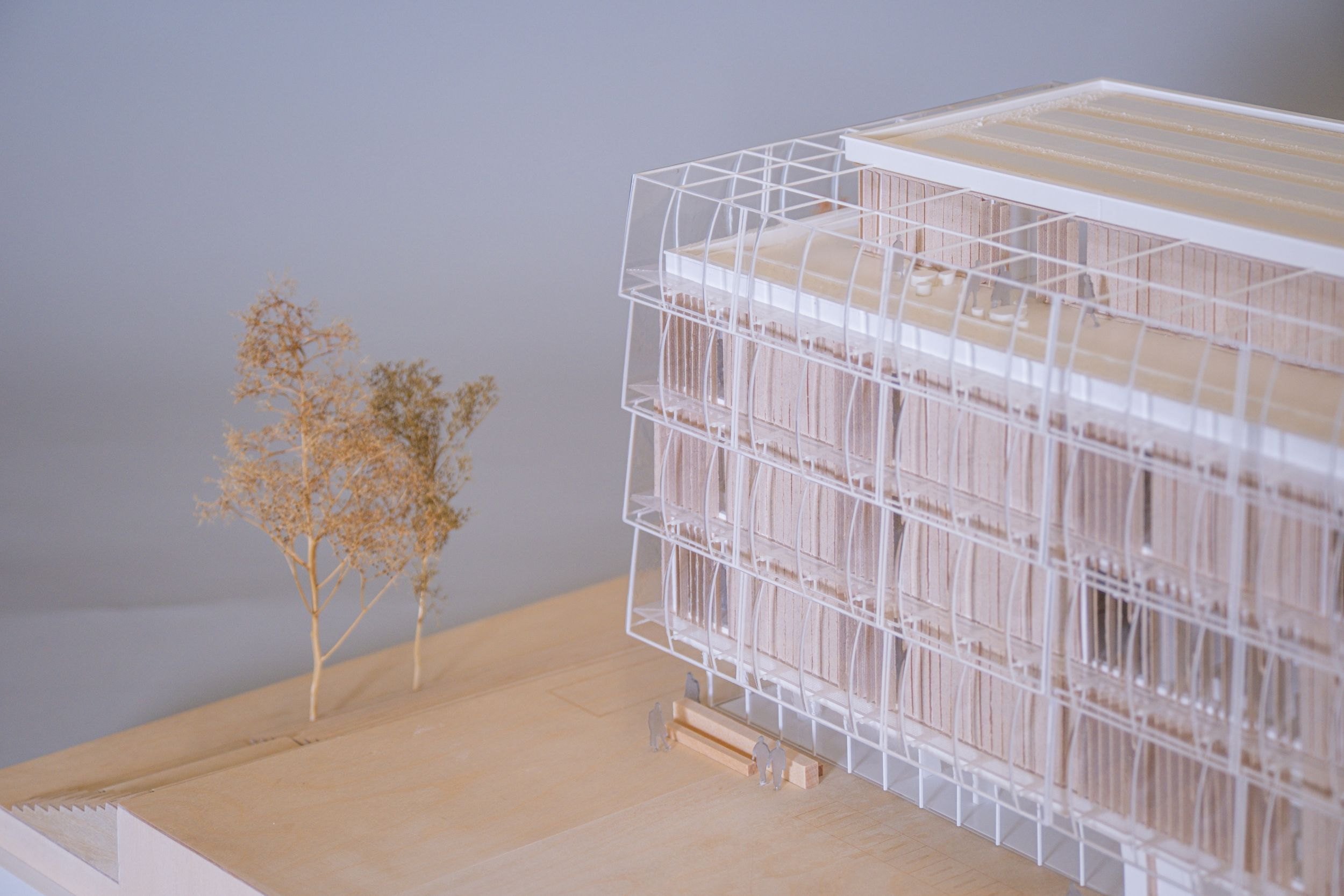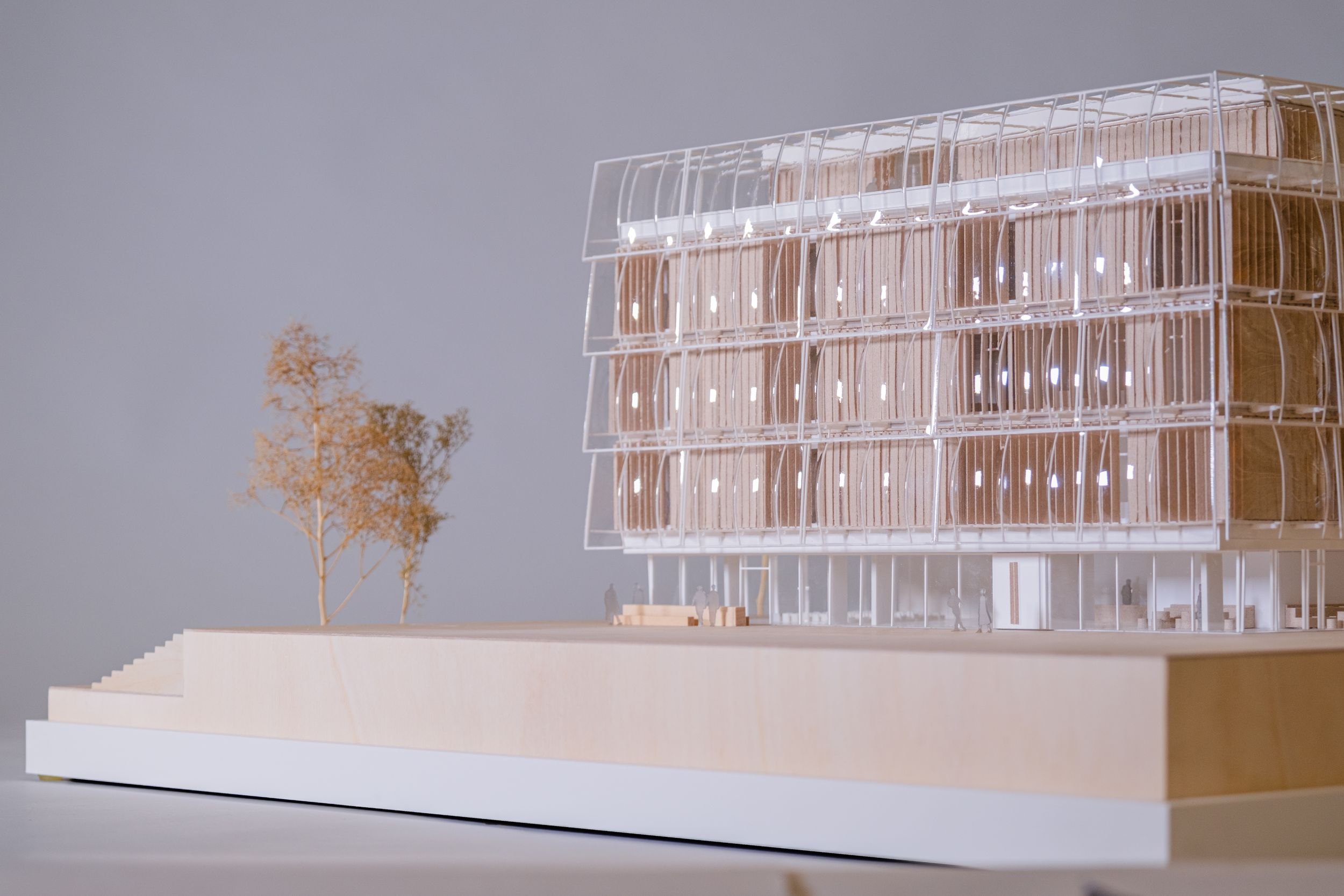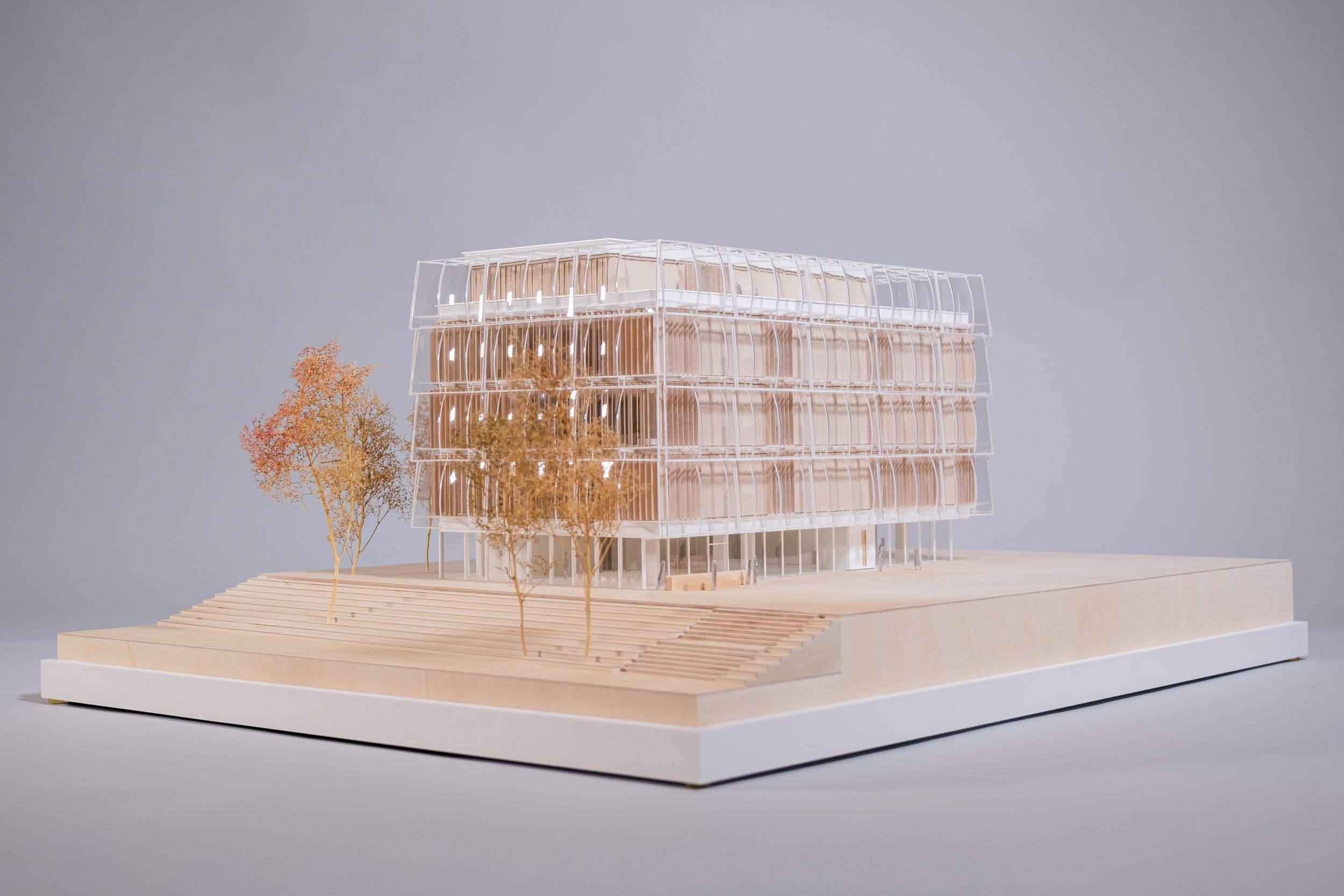 Снаружи здание закроют деревянные детали: панели и стоечно-балочная система, скрытая за жалюзи. Их в свою очередь защитит от воздействия атмосферы слой из прозрачной полимерной пленки ETFE (модули 6,3×8,1 м): остекления выше первого этажа в Форуме не будет.