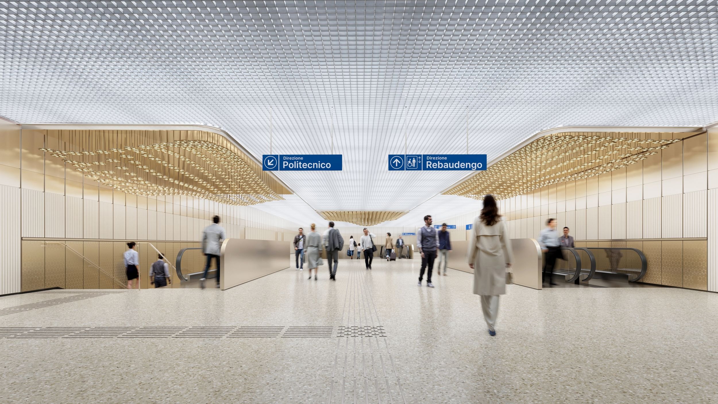Брендинг будет основан на все тех же реках и портиках, а также Альпах: они зададут графический и пространственный коды для станций. Колорит напомнит о природе Северной Италии: оттенки желтого и охры, синего и зеленого. Долговечные материалы (алюминий и фарфоровые элементы) будут сочетаться с рассеянным освещением; напольное покрытие, похожее на терраццо, напомнит об исторической архитектуре.