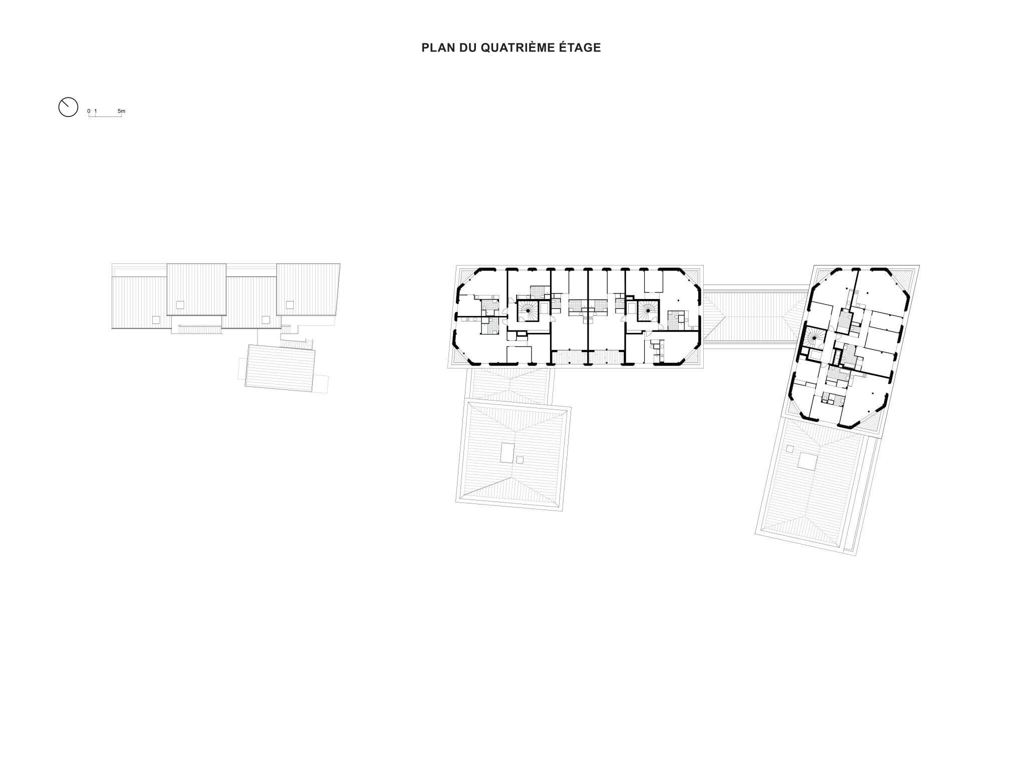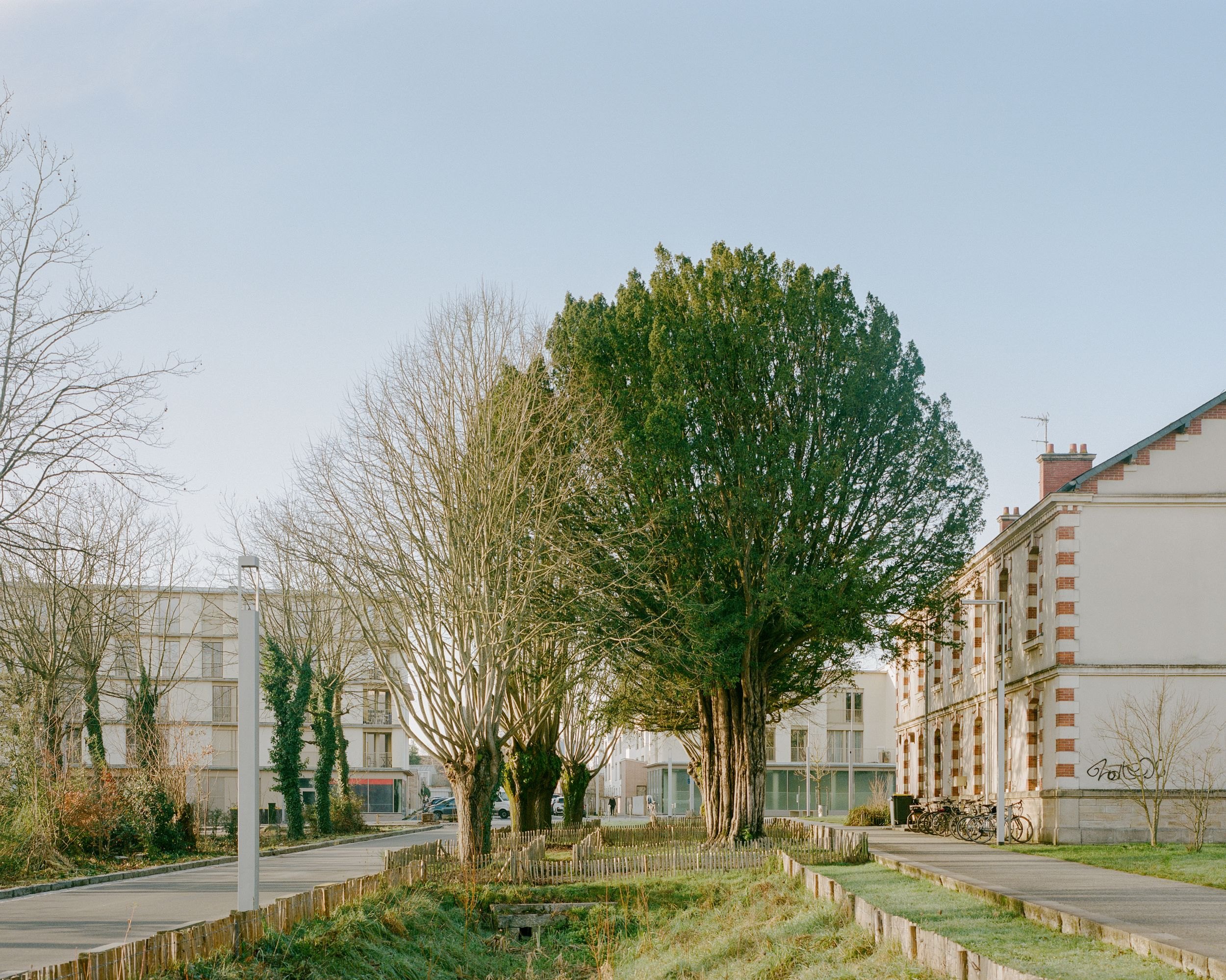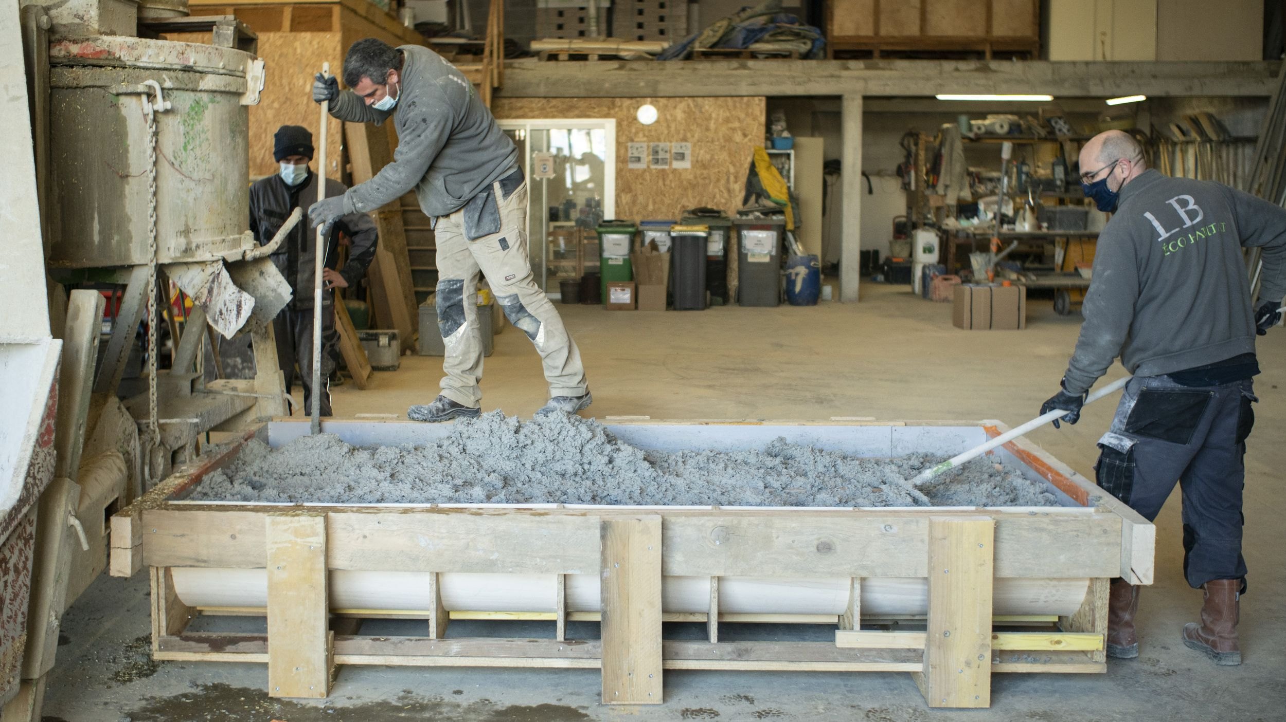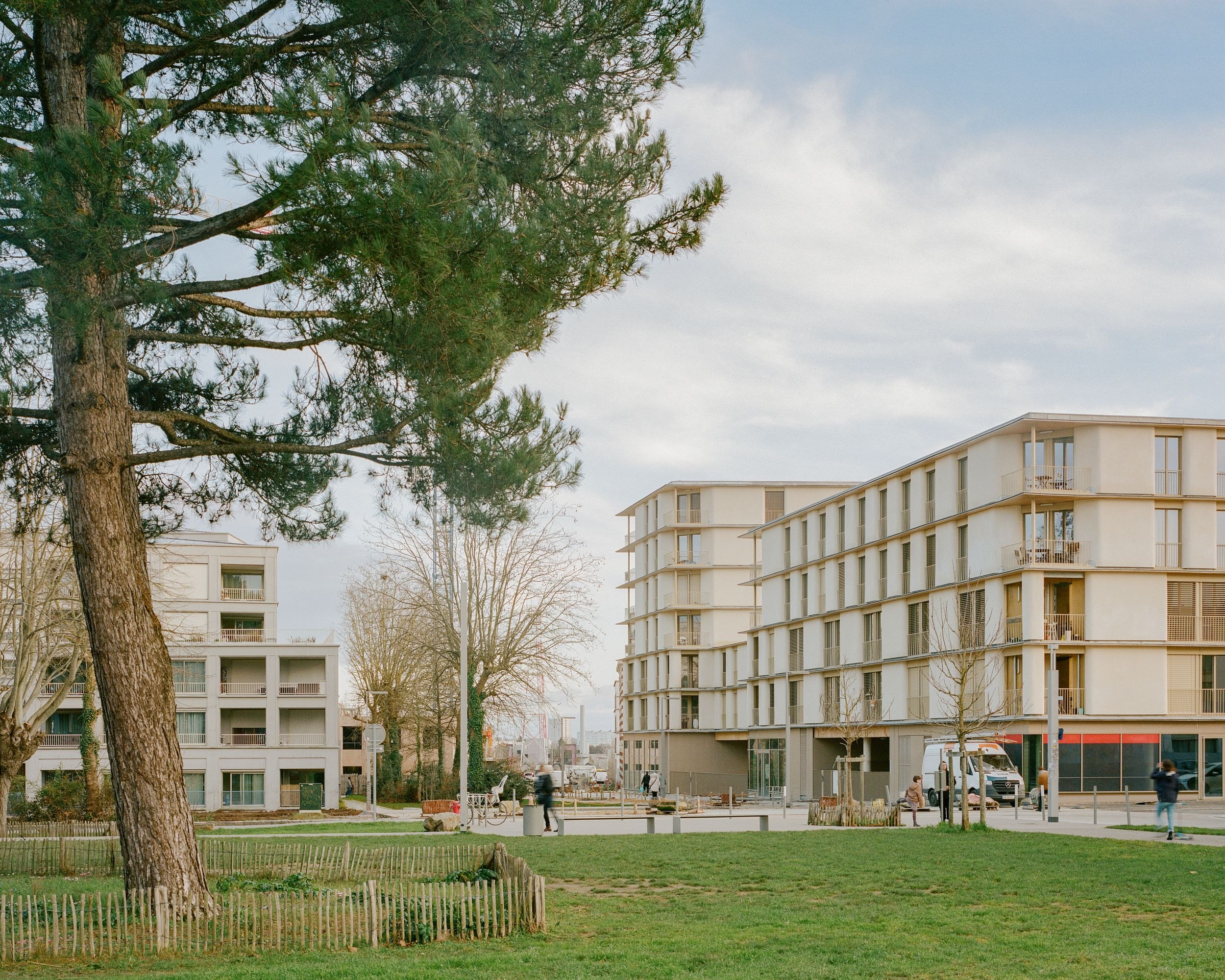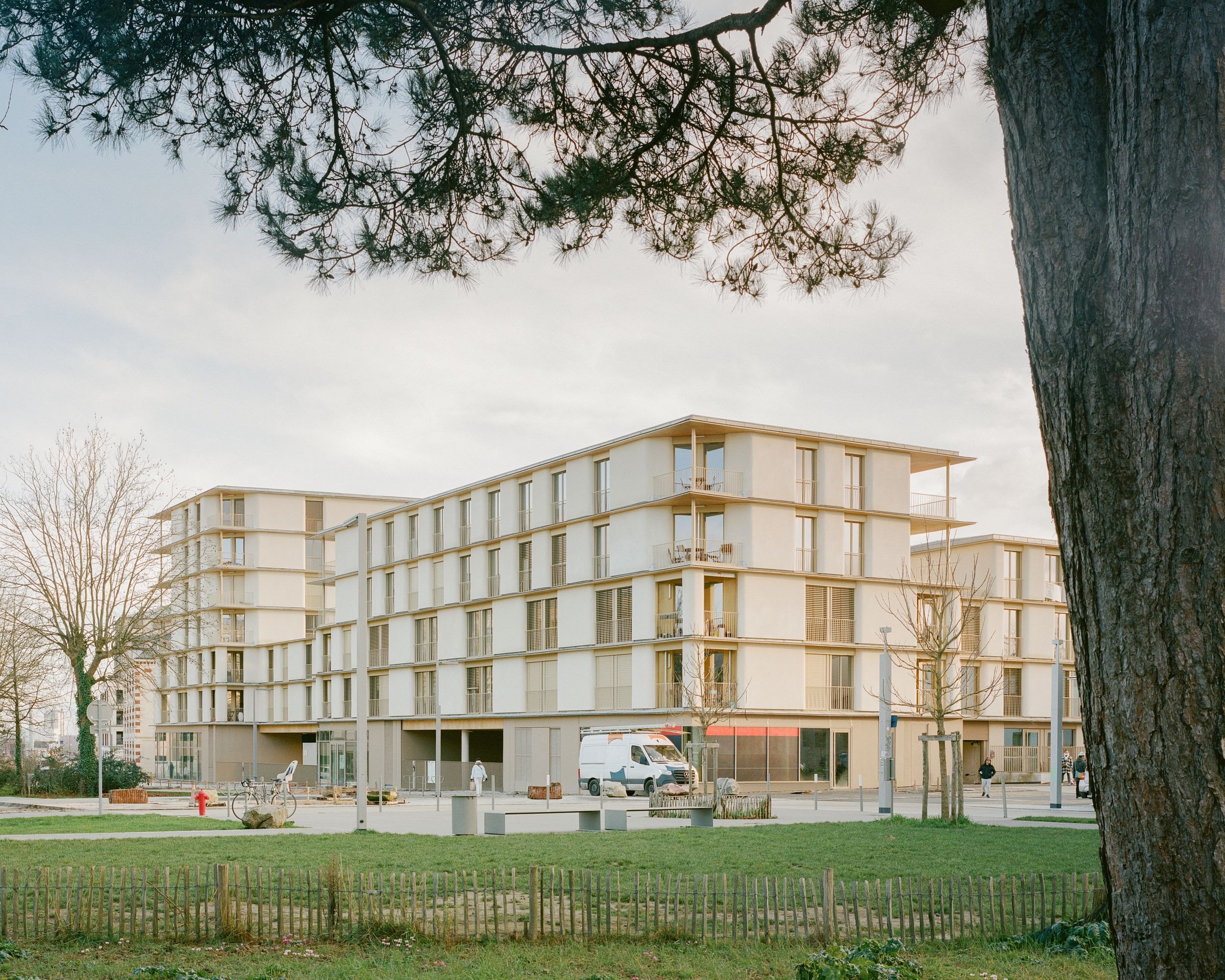 Так был задуман фасад из костробетона, или конопляного бетона: для материала используются жесткие стебли (костра) конопли, известь и минеральные добавки. Округлые простенки из этого материала, покрытые известковой штукатуркой, выглядят привлекательно, обеспечивают качественную изоляцию и обладают небольшой массой. Их произвели на заводе и смонтировали на месте, что упростило и ускорило строительство. Конопля распространена в регионе Луары, где находится Нант, и быстро воспроизводится, что делает костробетон особенно «зеленым» материалом для этой части Франции.